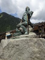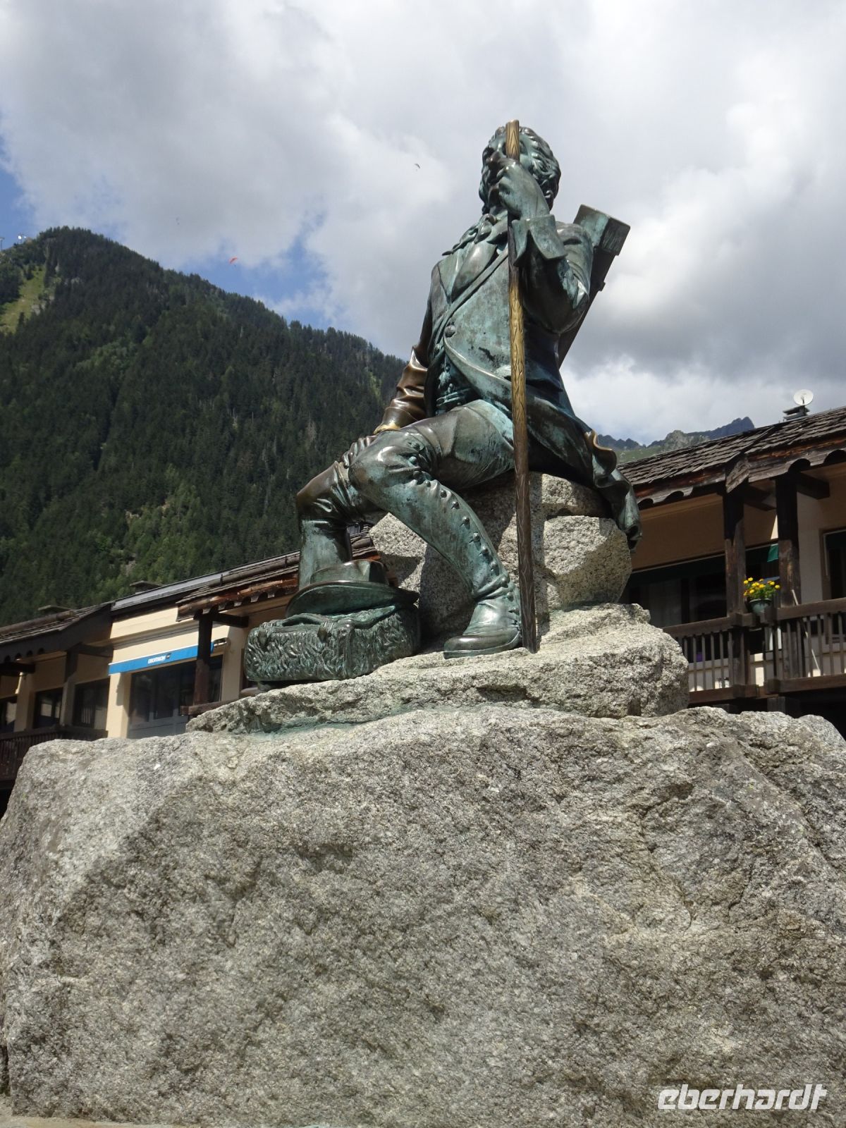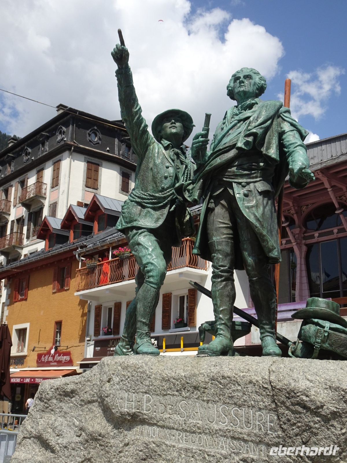 Nach der Rückfahrt unternahmen wir eine kleinen Stadtrundgang durch Chamonix. Besonders beeindruckend sind die Denkmäler der Erstbesteiger Jaques Balmat sowie Michel-Gabriel Paccard mit ihrem Förderer Horace Bénédict de Saussure, die im Ortskern an die Erstbesteigung am 8. August 1786 in eindrucksvoller Weise erinnern. Natürlich waren viele Reisegäste auch bei ihrem Stadtbummel an den vielfältigen Geschäften und einer Stärkung in Cafés und Gaststätten interessiert. Die Arve ist hier noch ein kleines Flüsschen, das sich gut durch den Stadtkern schlängelt.