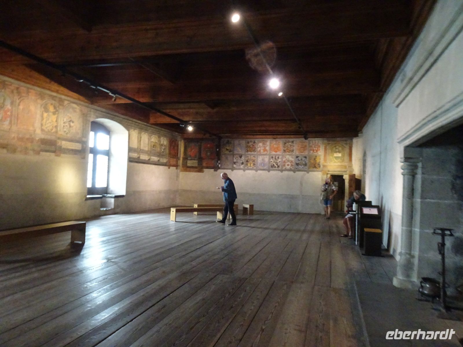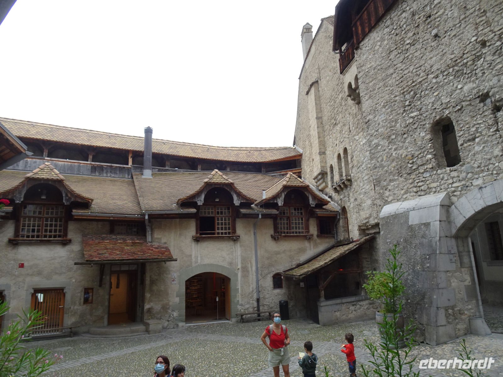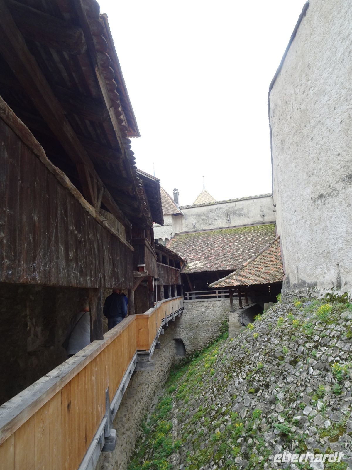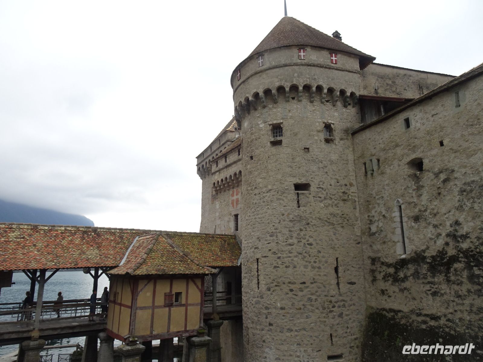 Für die übrigen Reisegäste war der Ausflug zum Wasserschloss Chillon und anschließend die Auffahrt auf den Rochers de Naye fakultativ. Bei bedecktem Himmel zeigte sich das Wasserschloss Chillon nicht von seiner fotogenen Seite. Dafür offenbarte uns das Schloss seine inneren Werte bei einer Audioguide-Führung. Von den Kerkern mit dem felsigen Untergrund der ursprünglichen Insel bis zu den Wehrgängen und dem Bergfried konnten wir viele Räume betrachten und uns einen Eindruck des Lebens in der fast 1000jährigen Vergangenheit machen. Die Ausblicke vom Schloss auf den Genfersee waren aus allen Etagen beeindruckend. Dabei wurde uns auch allerhand an interessanten Dingen über die ehemaligen Schlossherren, die Savoyer, und deren Gefangene mitgeteilt. Bekannt ist das Wasserschloss vor allem durch die Erzählung des englischen Lords George G. Byron (1788 – 1824) „Der Gefangene von Chillon“, der in seinem 392 Zeilen langen dramatischen Gedicht (1816 entstanden) dem Genfer Freiheitskämpfer Francois Bonivard, der in den Jahren 1532 bis 1536 in Chillon eingekerkert war, ein literarisches Denkmal setzte. Interessant an dieser sehr schmalen Stelle zwischen Fels und See ist auch die kürzlich eröffnete Festung Chillon. Die Verteidigungsanlagen aus dem zweiten Weltkrieg sind noch gut zu erkennen und waren Bestandteil des Programms „Schweizer Reduit“ zur Sicherung der Schweiz gegen ausländische Feinde.