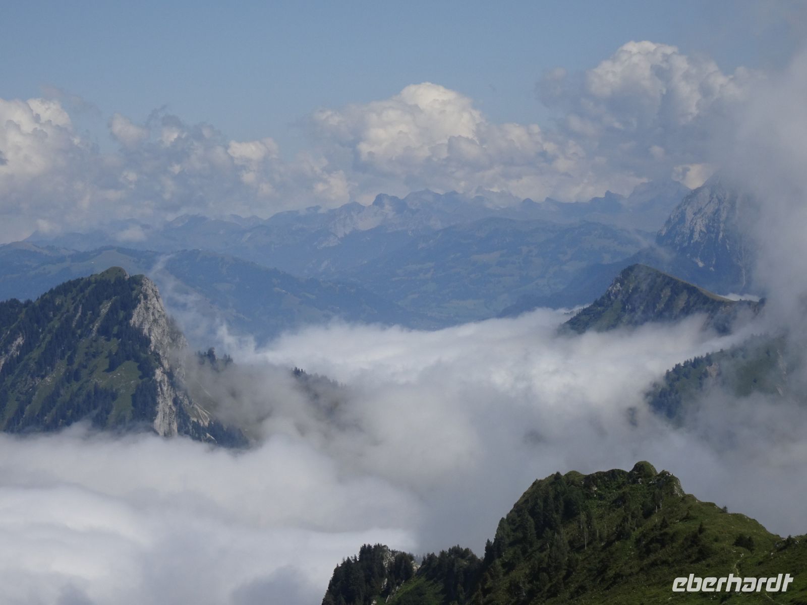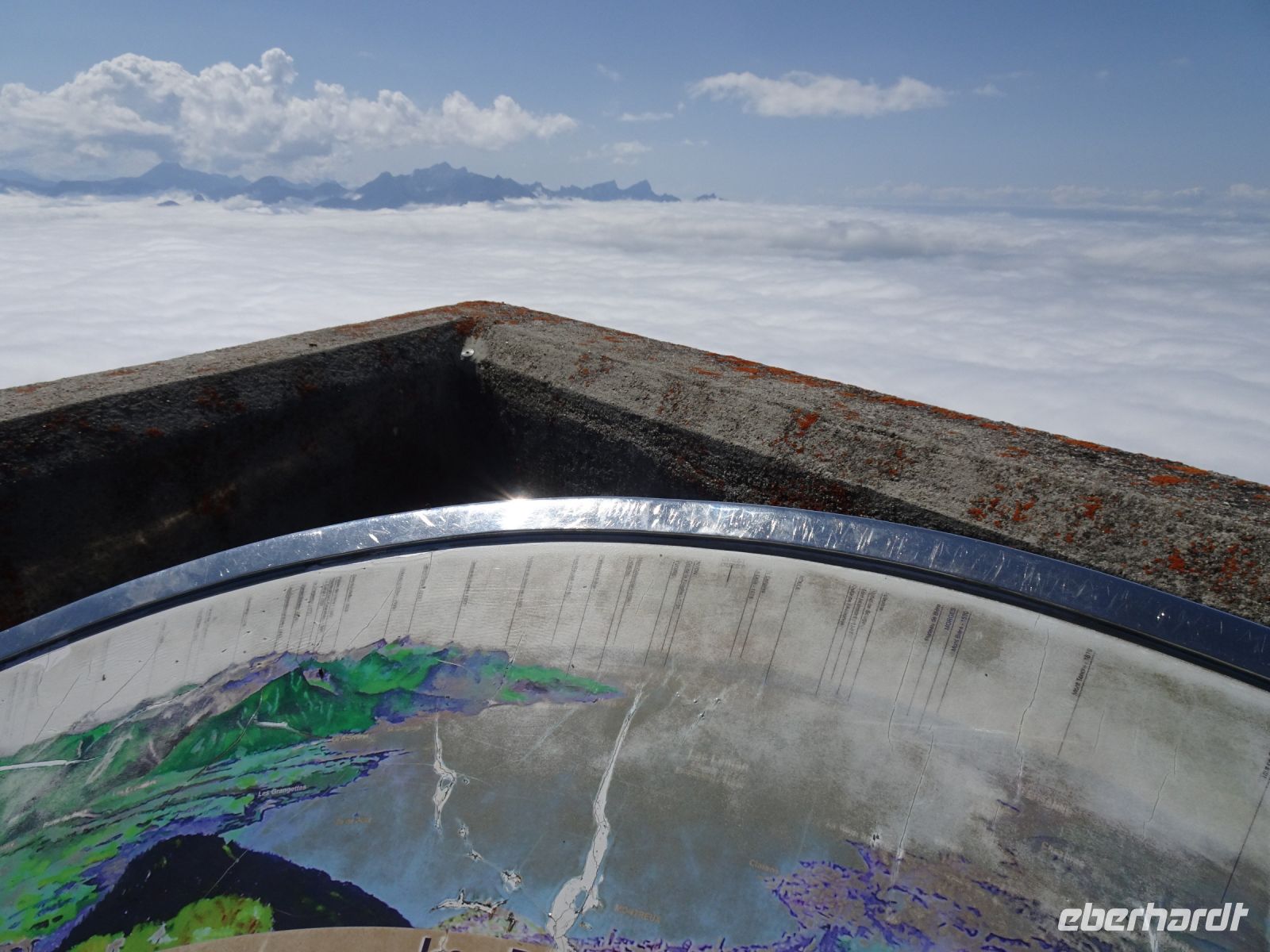 Dann ging es mit der Zahnradbahn auf den Rochers de Naye mit 2042 m üM in den Waadtländer Alpen. Und wir hatten Glück: oben angekommen, waren wir „über den Wolken“ und konnten damit zwar zahlreiche Gipfel in nah und fern, aber nicht den Genfersee bewundern. Wie angekündigt, begrüßten uns die possierlichen Murmeltiere nahe der Bergstation. Der naheliegende Alpengarten La Rambertia mit wohl über 1000 prächtigen Pflanzen der alpinen Vegetation ist in der steinigen Bergwelt sehr gut angelegt. Einige Eindrücke sind in der Bildergalerie zu bewundern. Fußwanderung auf den Gipfel Rochers de Naye: wer wollte, hatte hier - oberhalb der Wasserscheide zwischen Rhone und Rhein – ein prächtiges Panorama vor sich, das bis zur Berggruppe Mönch – Eiger – Jungfrau reichte.