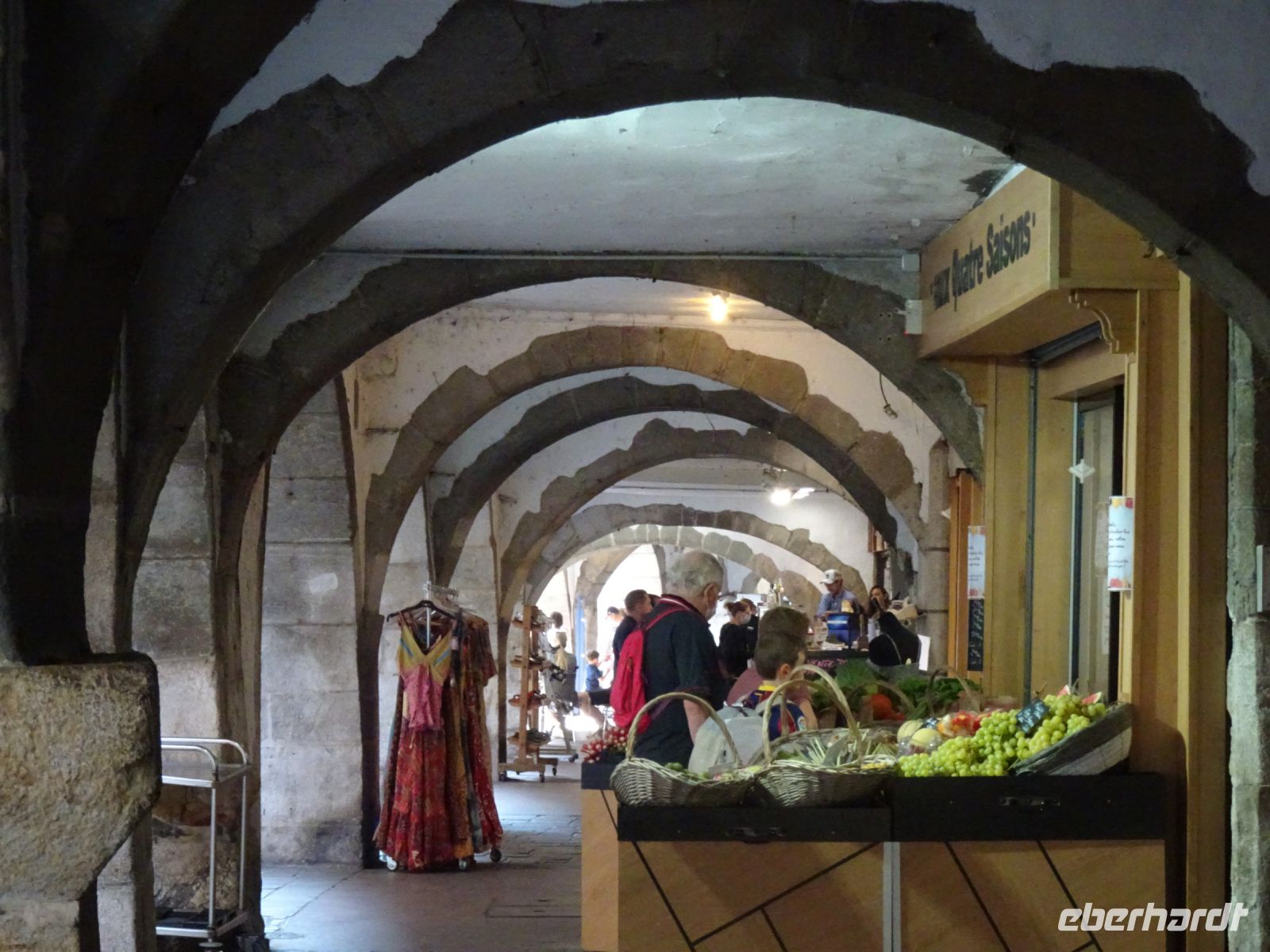 Schön zum Bummeln auch die mittelalterlichen Arkaden. Hier blüht der Handel mit regionalen Produkten, wie z. B. Käse und verschiedene Wurst- und Schinkensorten. Aber auch Tee und Gewürze, Seife und Lavendel kann man ganz frisch hier erwerben. Und es duftet herrlich in den kleinen Geschäften!