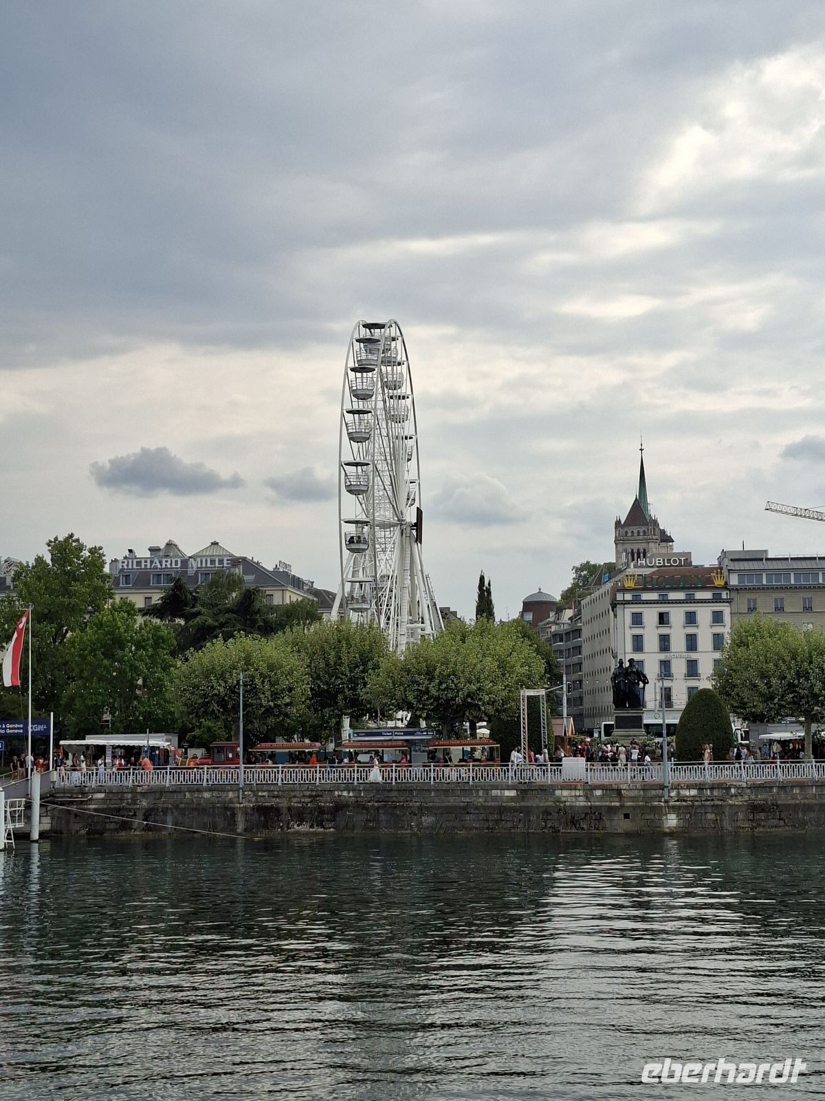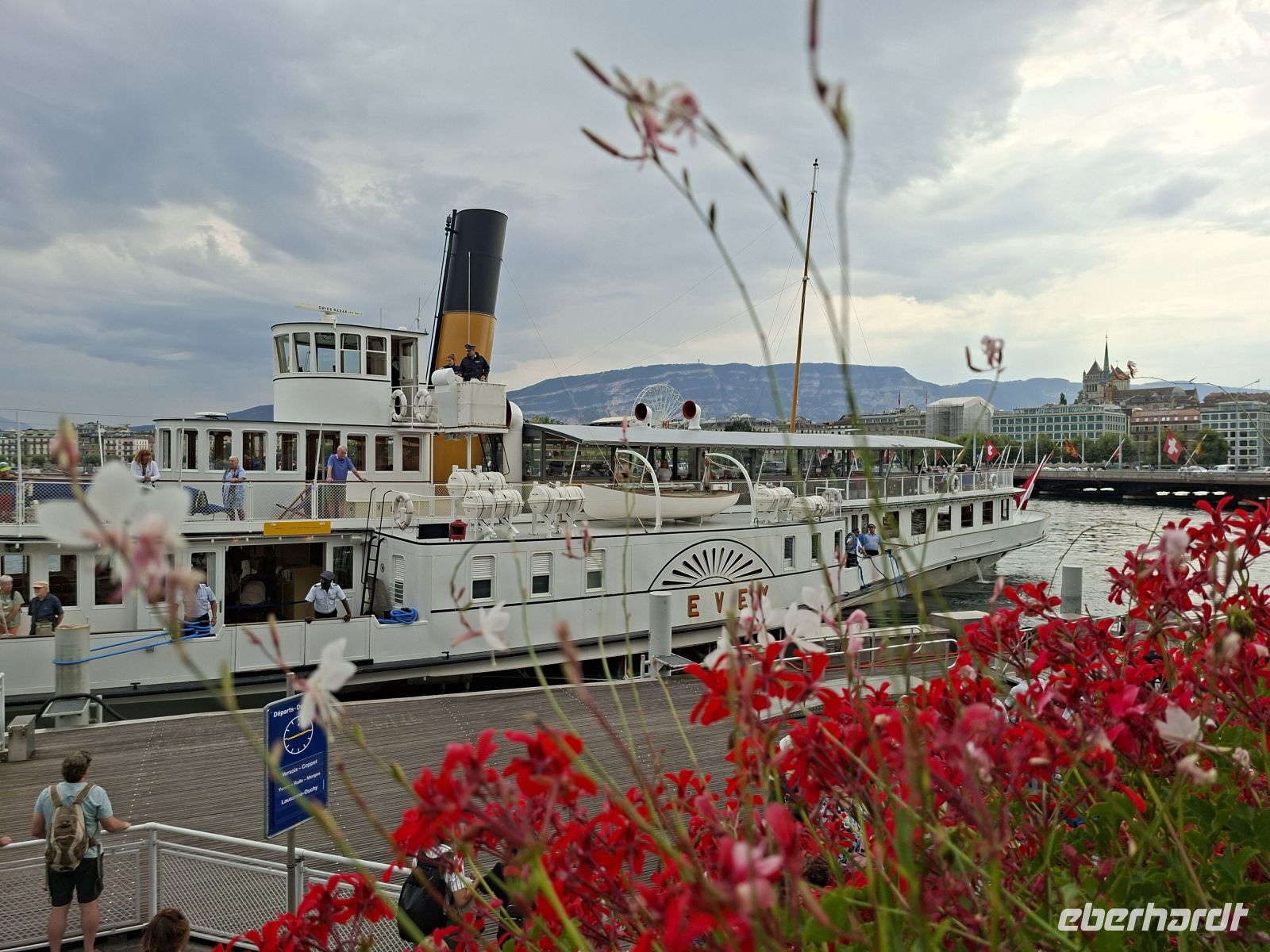 Nach einer kurzen Mittagspause am Busparkplatz zieht es uns nun in die internationale Welt, auf die Schweizer Seite des Sees, nach Genf. Wir parken am Brunswick-Denkmal am Quai de Mont-Blanc, direkt am Genfer See. Es wurde 1879 zu Ehren von Karl II. von Braunschweig, einem Prinzen von Braunschweig und Lüneburg, errichtet. Er vermachte sein Vermögen der Stadt Genf für den Bau eines Denkmals, um den Bürgern der Stadt für die Gastfreundschaft und die Hilfe, die ihm gewährt wurde, zu danken. Gegenüber der prachtvollen Hotelmeile besteigen wir unser Schiff für eine Rundfahrt auf dem Genfer See: wir erblicken die St. Pierre Kathedrale, die die Altstadt überragt u. die Promenade de la Treille, die wir bei der Einfahrt nach Genf befahren haben. Sie ist bekannt für die älteste öffentliche Bank der Welt. Das Schiff umrundet den Jet d'Eau – die berühmte Fontäne von Genf. Die Fontäne wird von einer leistungsstarken Pumpe betrieben, die das Wasser mit einer Geschwindigkeit von 200 km/h in die Luft schießt. Auf der anderen Seeseite säumen pompöse Gärten u. Villen das Ufer, u. wir erblicken das Gebäude der Vereinte Nationen (UN)) - Sitz des UN-Europe-Büros. Auf dem See wird Freizeitsport betrieben: Segelübung für die Jüngsten, Kleinboote u. ein Freibad mitten im See, das über eine Mole zu erreichen ist. Die Fahrt ermöglicht uns einen guten Überblick über die Stadt zu bekommen -u. alle hatten Außenplätze.
