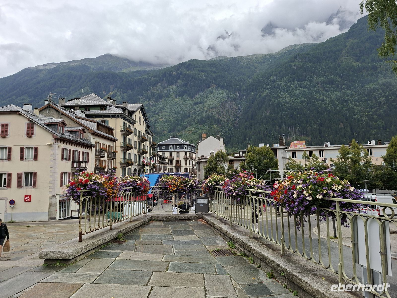 Schließlich erreichen wir das Tagesziel - Ankunft in Chamonix- dem Alpenparadies für Bergsportler und Naturliebhaber. Wenig Gäste sind heute im Ort unterwegs wegen schlechten Wetters; so sind wir in der Seilbahnauffahrt flexibel. Hier teilen sich unsere Gäste nach den gewählten Aufstiegsoptionen: 17 Gäste fahren mit der Seilbahn zur Aiguille du Midi (3.842m), von wo aus sich ein spektakulärer Blick auf den Mont Blanc und die umliegenden Gipfel bieten kann , wenn, ja wenn das Wetter mitspielt. Vier Gäste fahren mit der Zahnradbahn zum Eismeer-Gletscher, Mer de Glace - der größte Gletscher Frankreichs. Unsere Gäste überwinden die 500 Treppenstufen bis in die Gletscherhöhle und erfahren mehr über die Gletscherforschung. Individuell verbringen wir noch ca 2 Stunden im touristischen Ort. Die Stadt ist gesäumt von gemütlichen Chalets, eleganten Boutiquen und traditionellen Restaurants. An diesem Tag haben wir die Schlechtwetterprognose noch recht gut gemeistert. Auch der Mont Blanc zeigt sich zum Abschluss gnädig durch einen kurzen Wolkenaufriss.