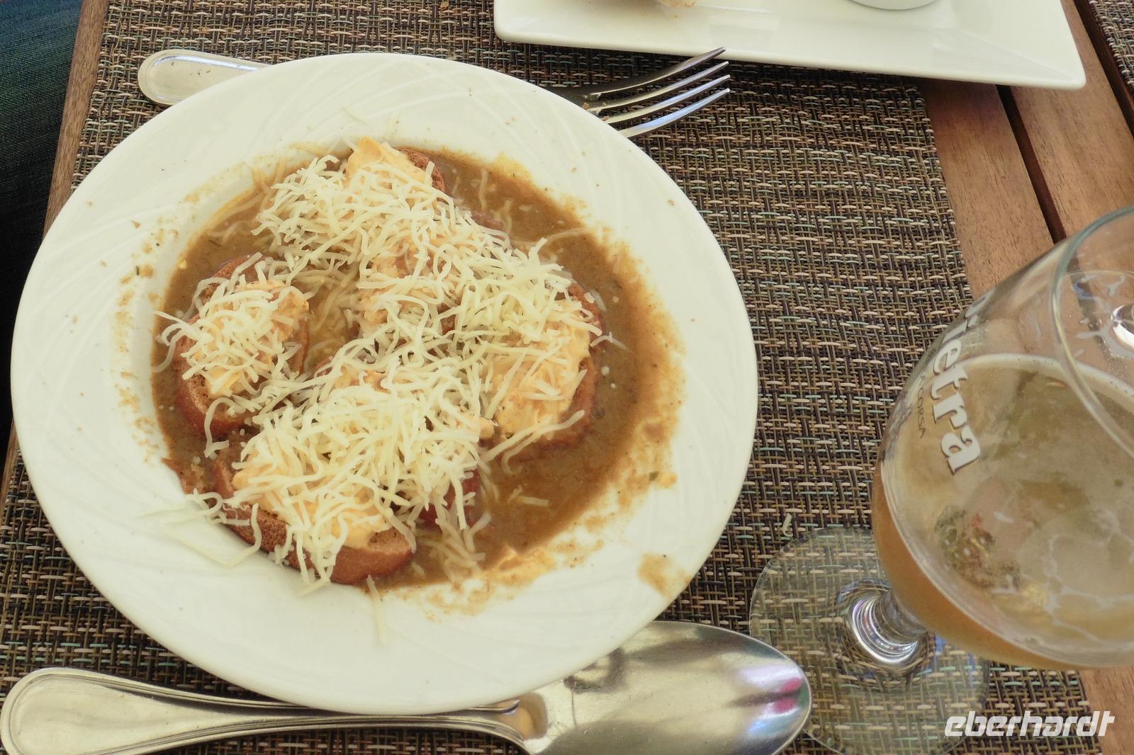 Der heutige Ausflug führte uns ganz in den Norden der Insel zum bekannten Cap Corse, welches die gesamte Landschaft der Insel im Kleinformat widerspiegelte. Wie der Zeigefinger einer Hand zeigt sich die 40 km lange Landzunge auf der Landkarte. Auf diesem Ausflug begleitete uns die Reiseleiterin Sybille, die seit vielen Jahren am Cap Corse zu Hause ist. Bei unserem ersten Stopp besuchten wir Erbalunga, ein kleiner Ort mit zahlreichen halbverfallenen genuesischen Türmen, kleinen Häusern und engen Gassen. Auf der Fahrt gen Norden sahen wir immer wieder traumhafte Buchten, kleine Hafenorte und genuesische Wachtürme wie z.B. den Tour de L´Osse. An der Westküste hielten wir im Dorf Pino, welches am Hang gebaut, zwischen Meer und Bergen liegt, bevor wir über den Col de Sainte Lucie Pass wieder an die Ostküste fuhren. Im Hotel wurde, wie jeden Tag, ein 4- Gänge Menü für uns vorbereitet. Als Vorspeise servierte man uns diesmal eine korsische Fischsuppe, von der uns viele Reiseleiter erzählten. Wir rieben nach Anleitung die getoasteten Baguettescheiben mit Knoblauch ein, strichen eine Schicht Knoblauchmayonnaise darüber, legten alles in die tiefen Teller, bevor die Fischsuppe darüber gegossen wurde.