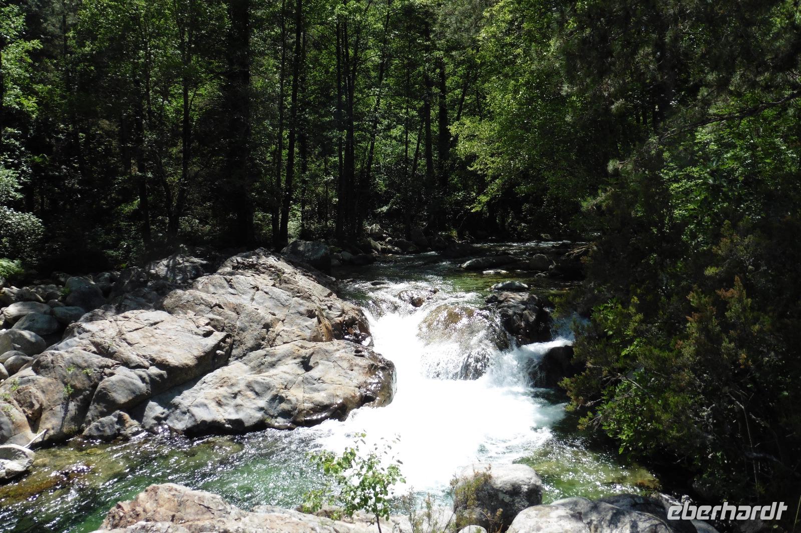 Am Morgen holten wir unsere heutige Reiseleiterin Delphine am Bahnhof von Casamozza ab, um mit ihr einen Ausflug nach Corte zu unternehmen, der „heimlichen" korsischen Hauptstadt. Die Stadt liegt im Herzen der Insel und ist umgeben von üppigen Wäldern und fruchtbaren Tälern. Dort kämpfte Pasquale Paoli im 18. Jahrhundert für die Unabhängigkeit Korsikas. Inzwischen ist es eine junge Studentenstadt in der sich auch viele Touristen per Zug oder zu Fuß durch die gepflasterten Gassen der Altstadt treiben lassen. Vom Aussichtspunkt Belvedere hatten wir einen tollen Blick in die Restonicaschlucht und das Tavignano-Tal in denen man sehr gut wandern kann. Nach der Stadtbesichtigung von Corte fuhren wir ein kleines Stück in das Restonica-Tal, welches zu den schönsten Schluchten der Insel gehört. Dort kehrten wir in die Auberge de la Restonica ein, wo uns zum Mittag ein korsischer Wildscheingulasch serviert wurde. Die Umgebung des Restaurants war perfekt für einen kleinen Verdauungsspaziergang entlang des rauschenden Flusses. Danach fuhren wir diesmal in südliche Richtung von Corte nach Aleria und machten einen Fotostopp in Altiani an der genuesischen Brücke und einer romanischen Kirche. Am Abend wurden wir in unserem Hotelrestaurant mit einer mit Wunderkerzen bestückten Torte verabschiedet.