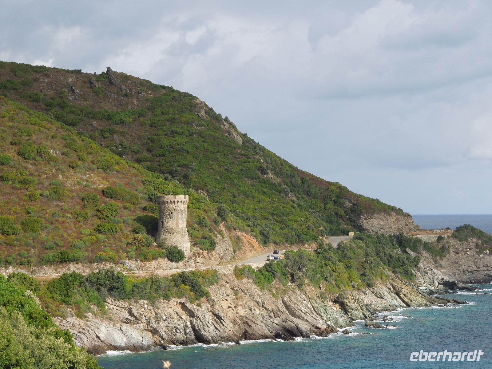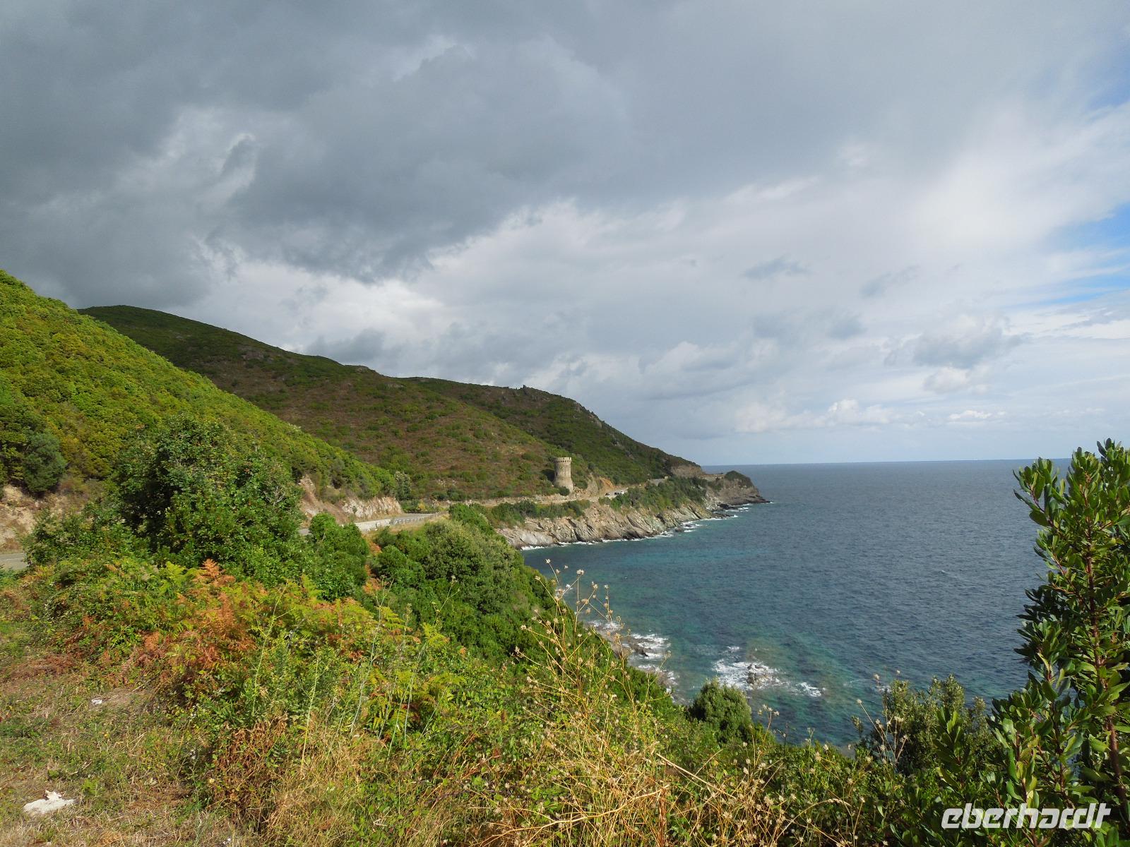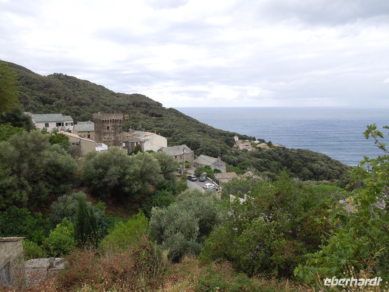 Nach einem ausgiebigen Frühstück in geselliger Runde und mit Blick aufs Meer, trafen wir unsere örtliche Reiseleiterin Simone am Hotel. Simone ist Deutsche, wohnt aber schon seit über 20 Jahren auf Korsika. Kurze Zeit später machten wir uns auf den Weg Richtung Bastia. Unseren ersten Stopp legten wir in dem kleinen Örtchen Erbalunga ein. Das kleine Fischerdorf liegt 10 km nördlich von Bastia. Es blieb Zeit für einen Kaffee oder einen Spaziergang durch die verwinkelten Gassen bis zum Hafen. Anschließend fuhren wir weiter die kurvigen Straßen auf dem Cap Corse entlang. Das Cap Corse befindet sich im nördlichen Teil Korsikas und ragt wie ein Zeigefinger nach oben. Nirgendwo anders auf der Insel folgen so viele genuesische Wachtürme von Bucht zu Bucht aufeinander. Ab und zu hielten wir für einen kleinen Fotostopp und Pflanzenkunde durch Simone. Unsere Mittagspause machten wir in Macinaggio, einem kleinen Hafenort. Kurz nachdem wir uns in einem der vielen Restaurants niedergelassen hatten, fing es an wie verrückt zu regnen und wollte gar nicht mehr aufhören. Eine Stunde und einen Wolkenbruch später kämpfte sich die Sonne zum Glück wieder ihren Weg zu uns durch und wir fuhren weiter. Es folgten Stopps am Moulin de Mattei, in Pino, in Luri & Santa Severa. Auf dem Aussichtspunkt Moulin de Mattei hat man einen spektakulären Blick und man kann eine restaurierte, etwa 150 Jahre alte Windmühle bestaunen.