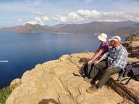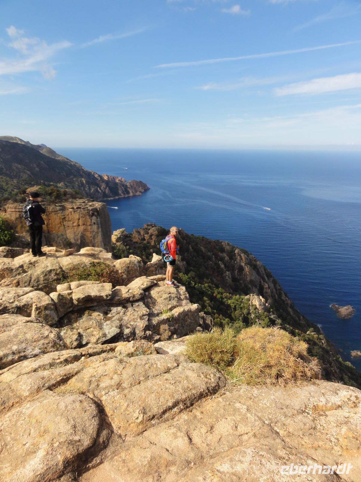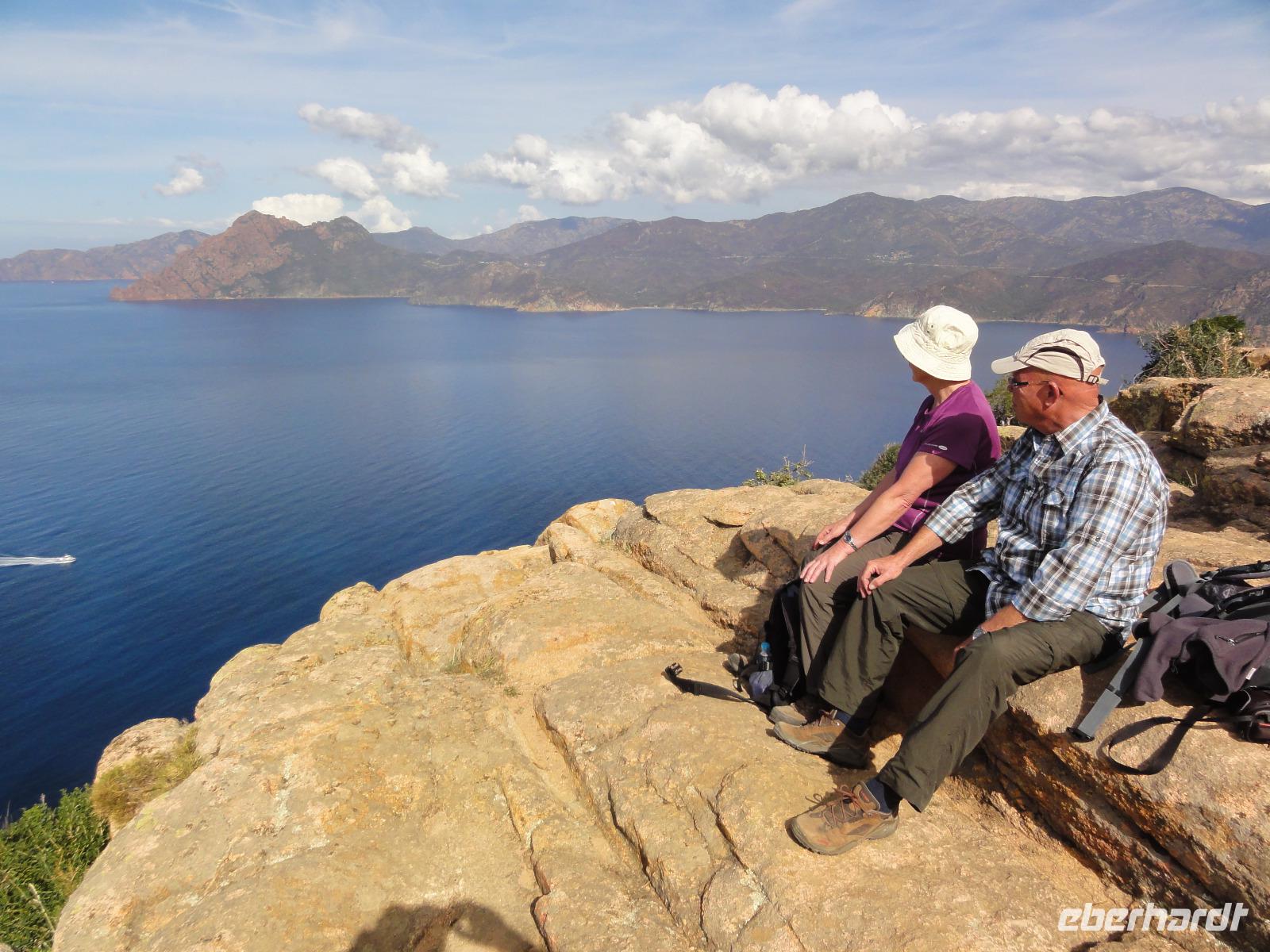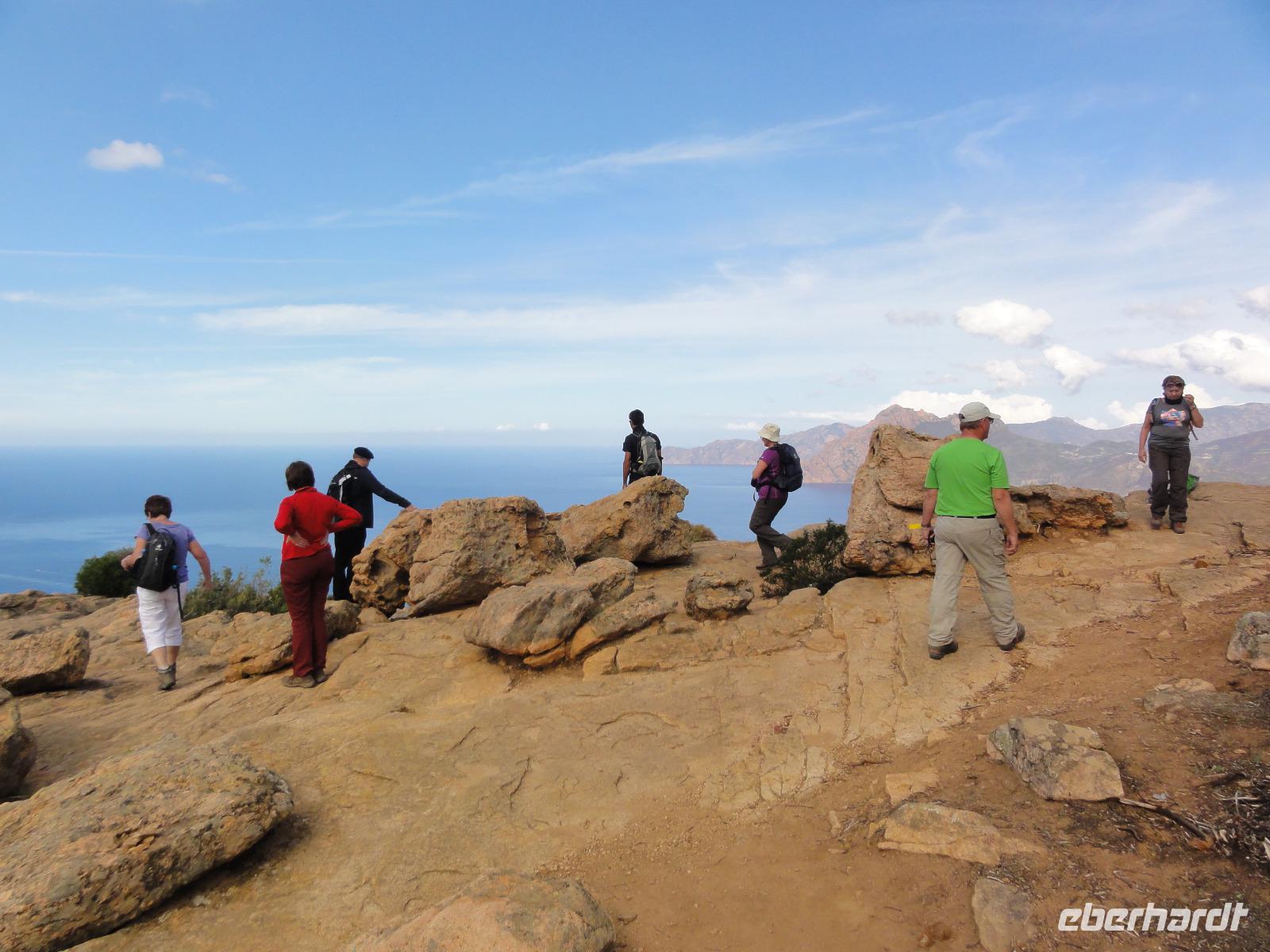Wir machen einen kurzen Halt in Girolata an einem Aussichtspunkt mit fabelhaftem Blick auf den „Golfe de Girolata" mit den rot gefärbten Prophyrfelsen auf der rechten Seite. Und es ist mal wieder Zeit für ein Gruppenbild... :-)