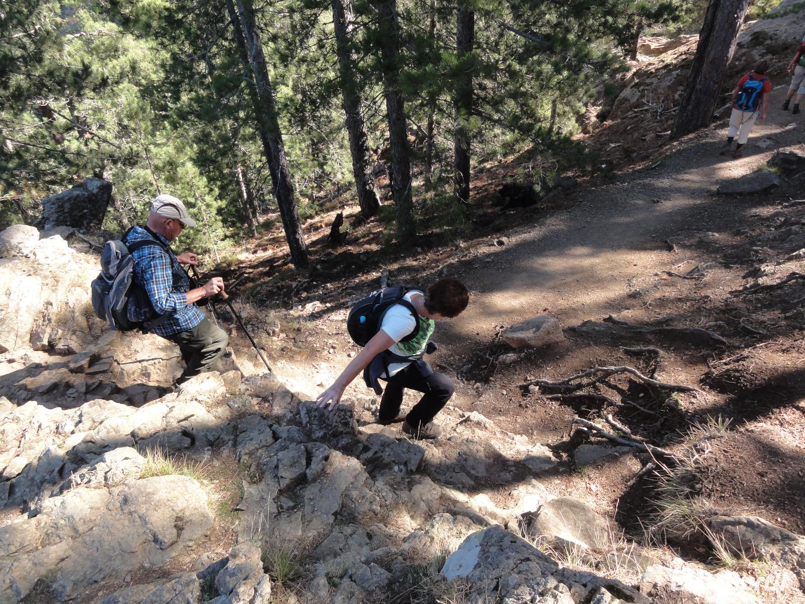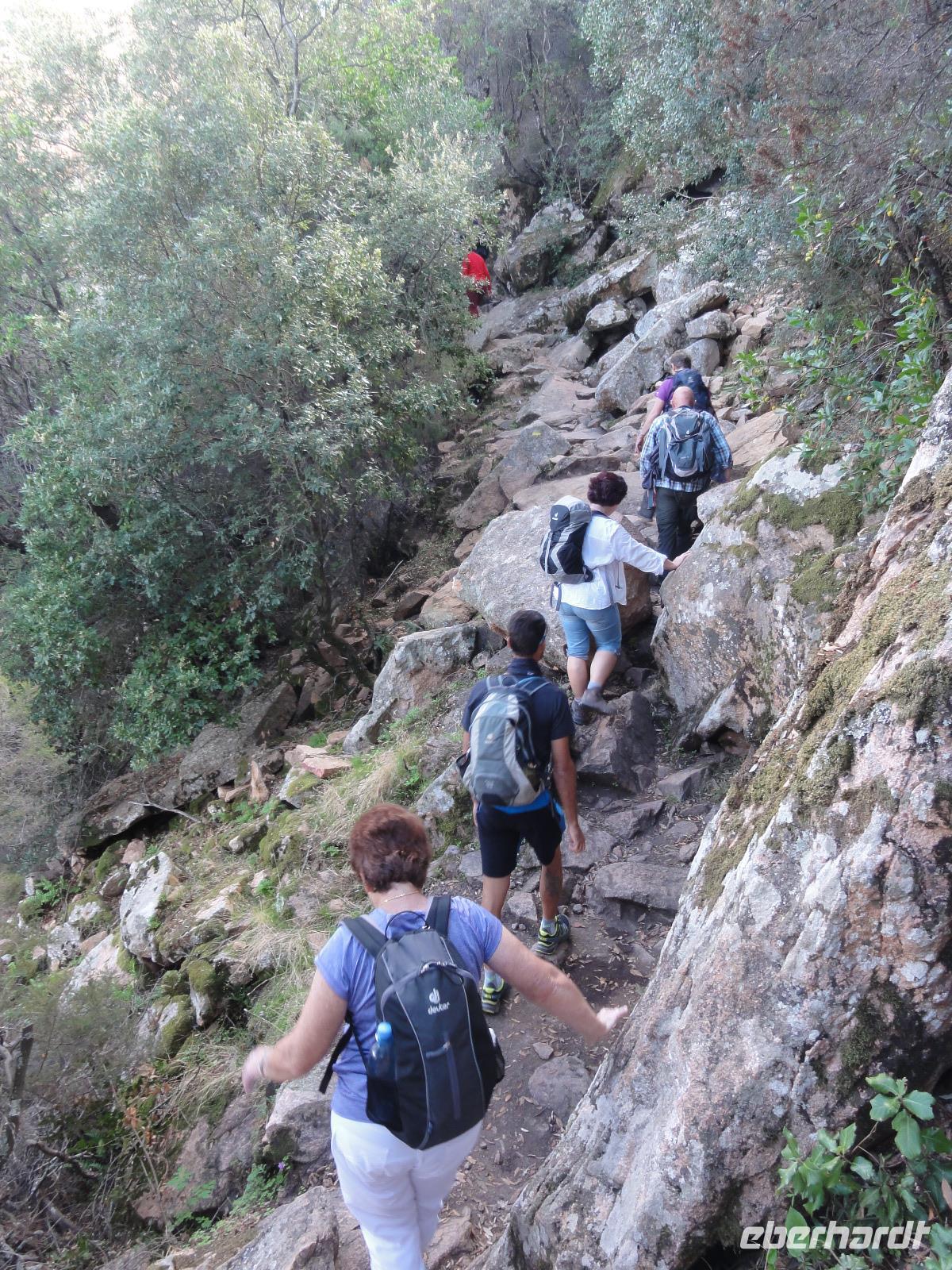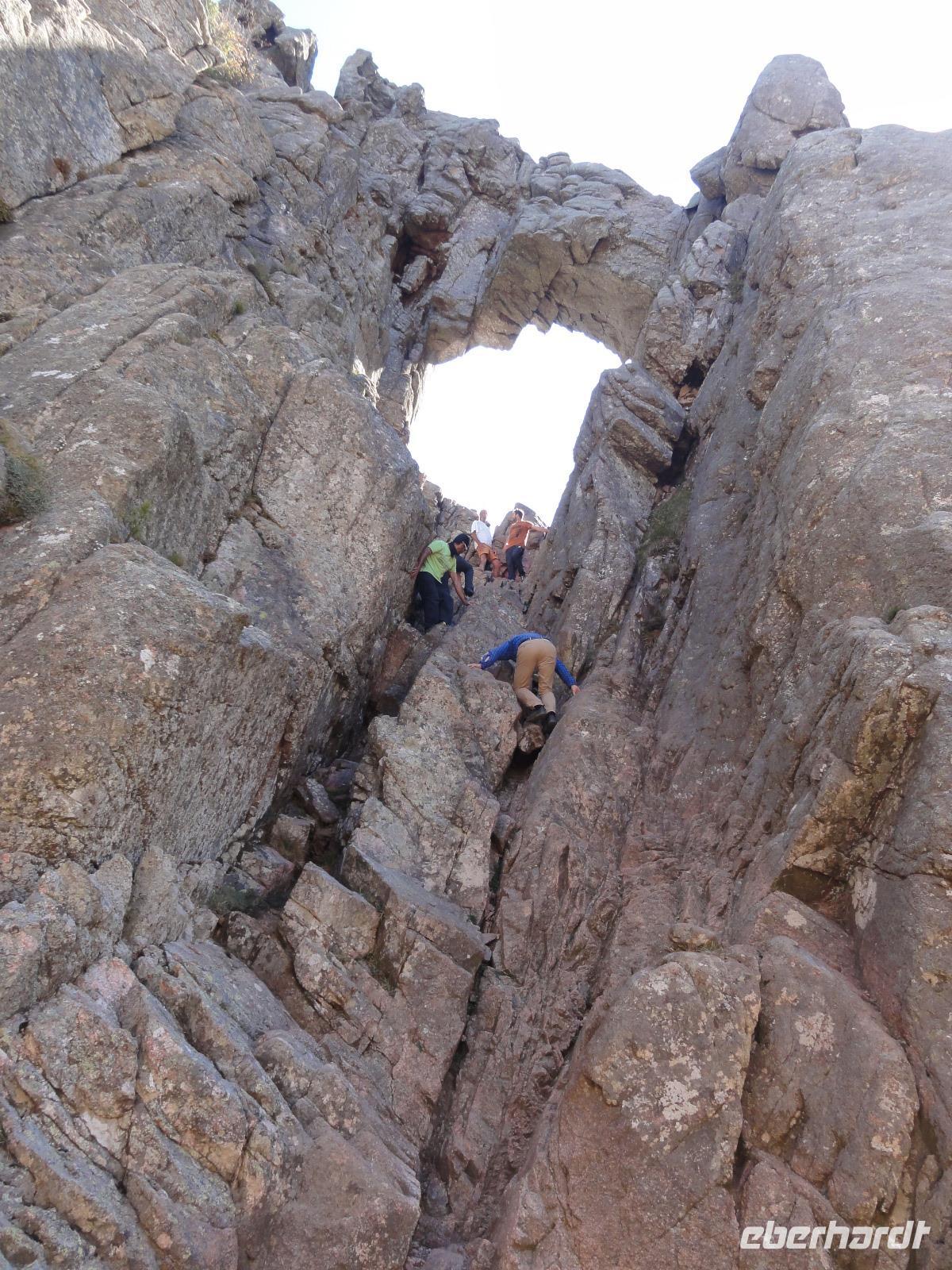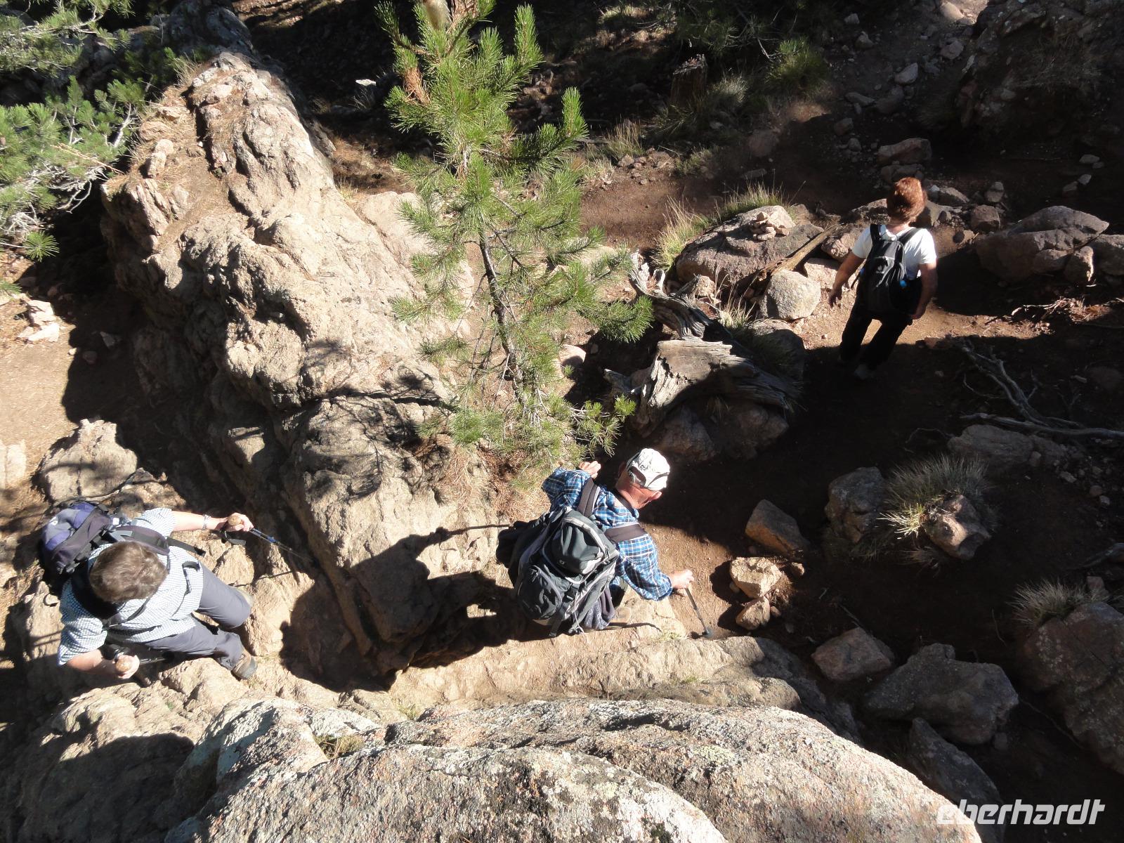 Was man hochklettert muss man auch wieder hinunter klettern, also folgt nun der waghalsige Abstieg, aber es kommen alle unversehrt wieder unten an und die Gruppe ist komplett. Wir wandern zurück Richtung Ausgangspunkt zu Antoine und bemerken währenddessen, das Abhandenkommen einer Jacke. Trotz einer großräumig angelegten Suchaktion mit Helikopter und Spürhunden :-) blieb die Jacke verschollen. Ärgerlich, vielleicht lag es doch am Freitag den 13? @ Ute