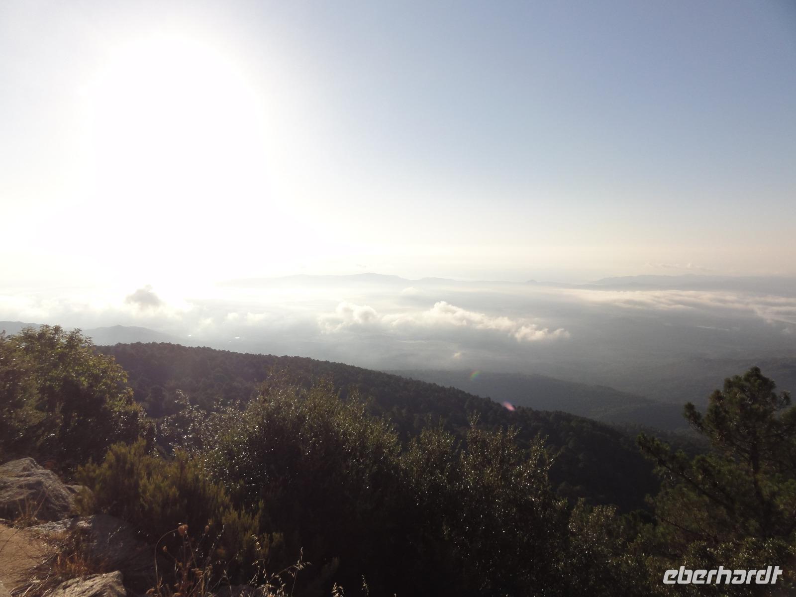 Ab 07.00 Uhr steht das Frühstück für uns bereit. Wir genießen den Blick aufs Meer und den Sonnenaufgang hinter den Bergen.