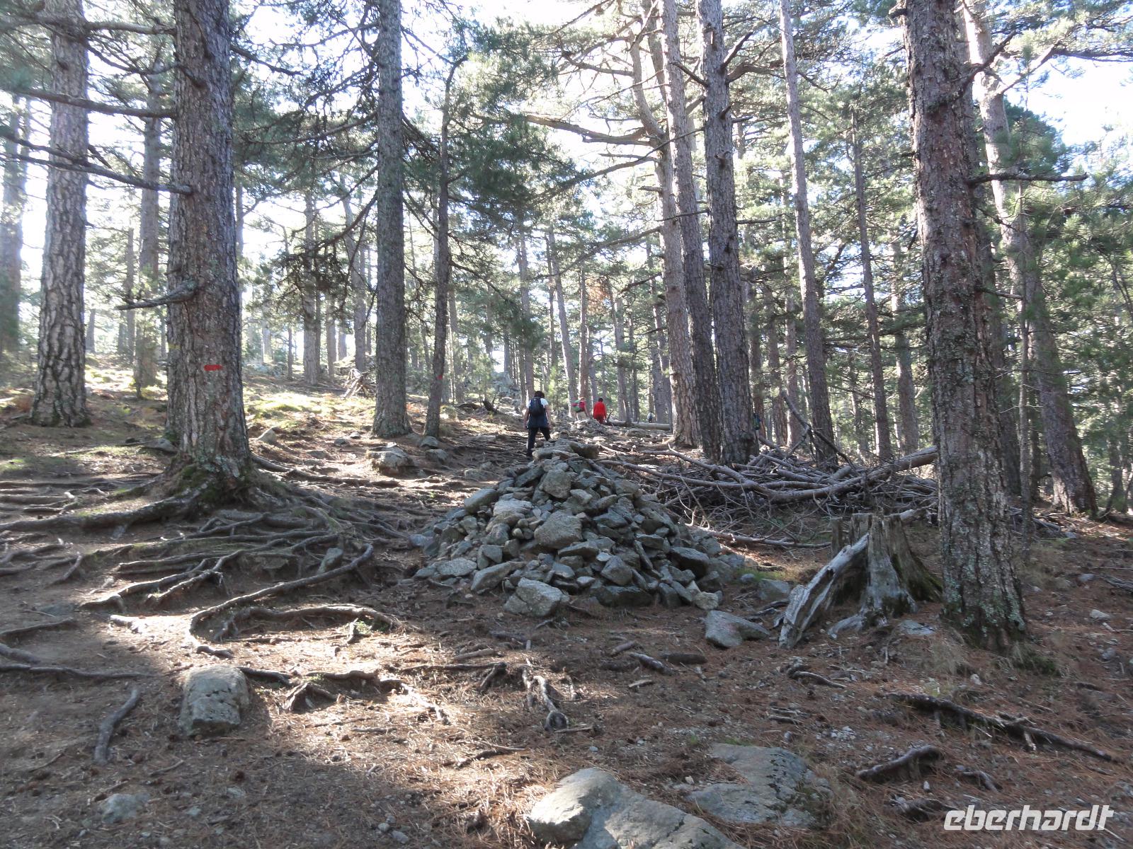 Freitag der 13 !!! Wir genießen unser Frühstück und checken 08.00 Uhr wieder aus. Noch ein kurzer Halt beim Bäcker, Yann besorgt uns noch Baguettes und Croissants für unser Picknick am Nachmittag. Weiter geht's die Ostküste entlang in Richtung Bastia. Unser Hotel für die Nacht wird wieder das „San Pellegrino" in Folleli sein, aber bis dorthin ist es noch ein Stück und es wird ein ereignisreicher Tag werden. Nun beginnt die abenteuerliche Fahrt hinauf zum Col de Bavella. Auf dem Weg dorthin machen wir eine Pause an einem Aussichtspunkt, und stellen fest, dass es ziemlich frisch ist. Die Wolken hängen tief im Tal und wir befinden uns auf Augenhöhe mit ihnen. Vorbei an der höchstgelegenen Pferderennbahn Europas erreichen wir den Col de Bavella bei 1218 m. Jetzt beginnt der Aufstieg zum „Trou de la Bombe" auf 1483 m. Die Wanderung führt uns durch den Wald, an einer kleinen Kapelle vorbei,