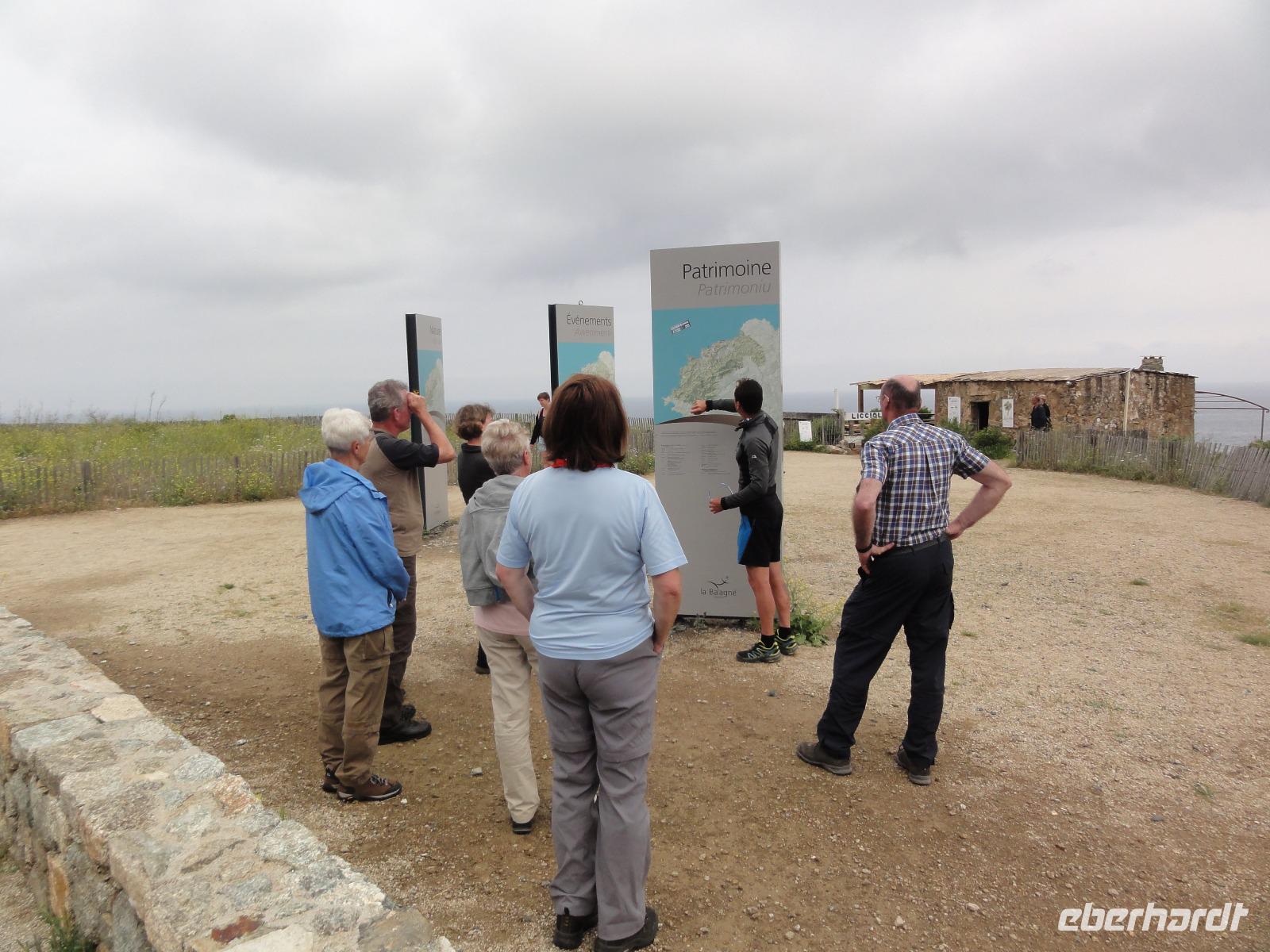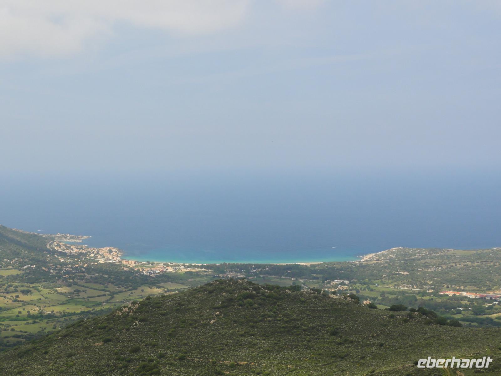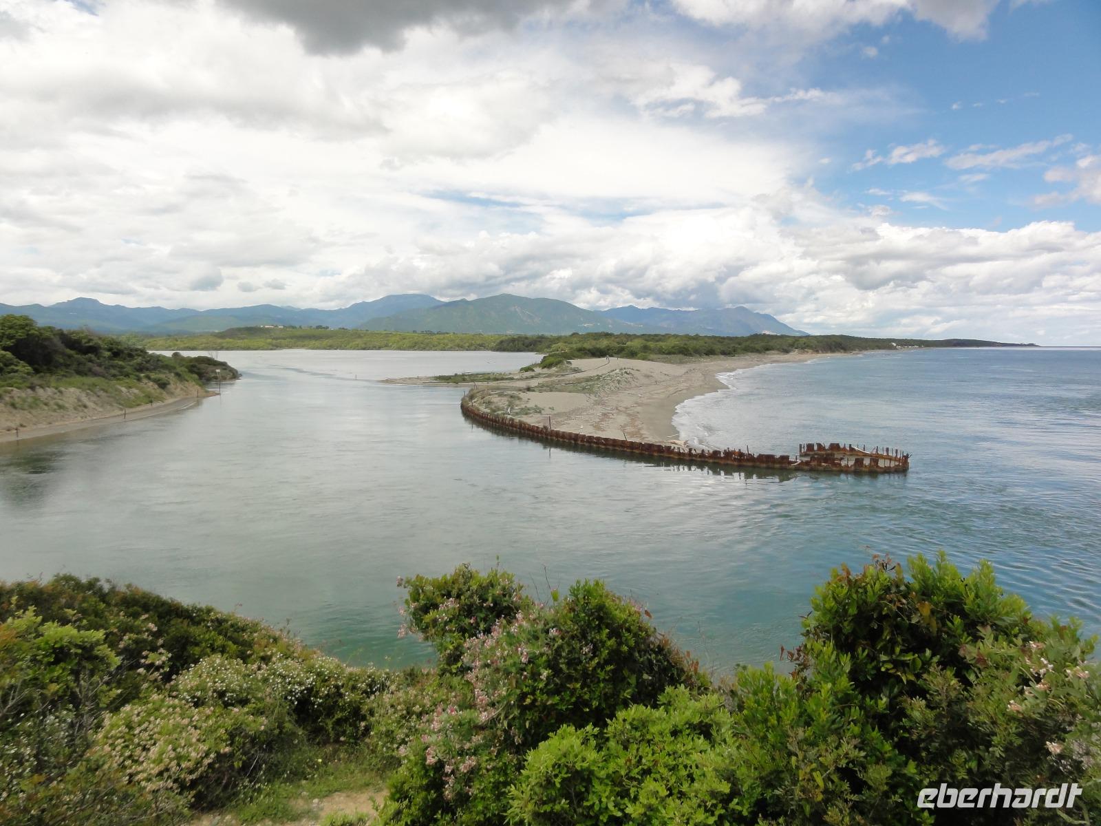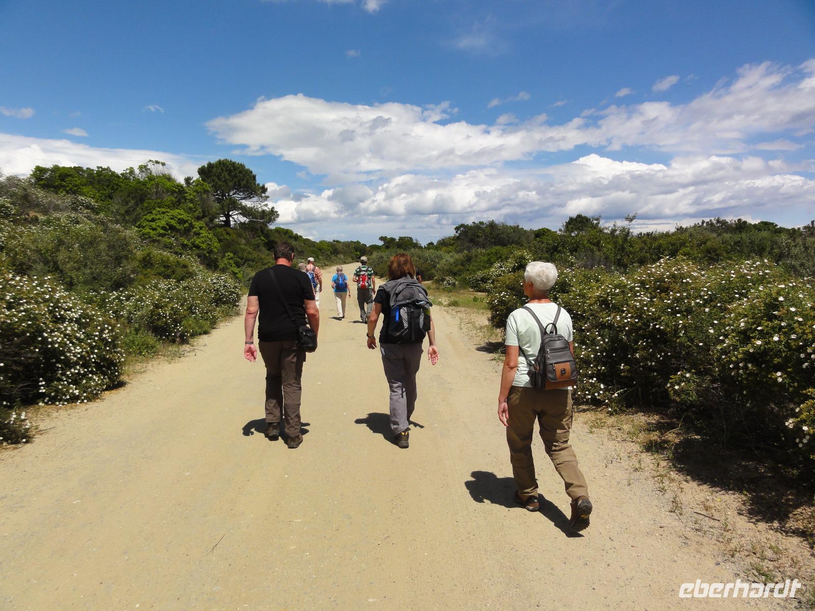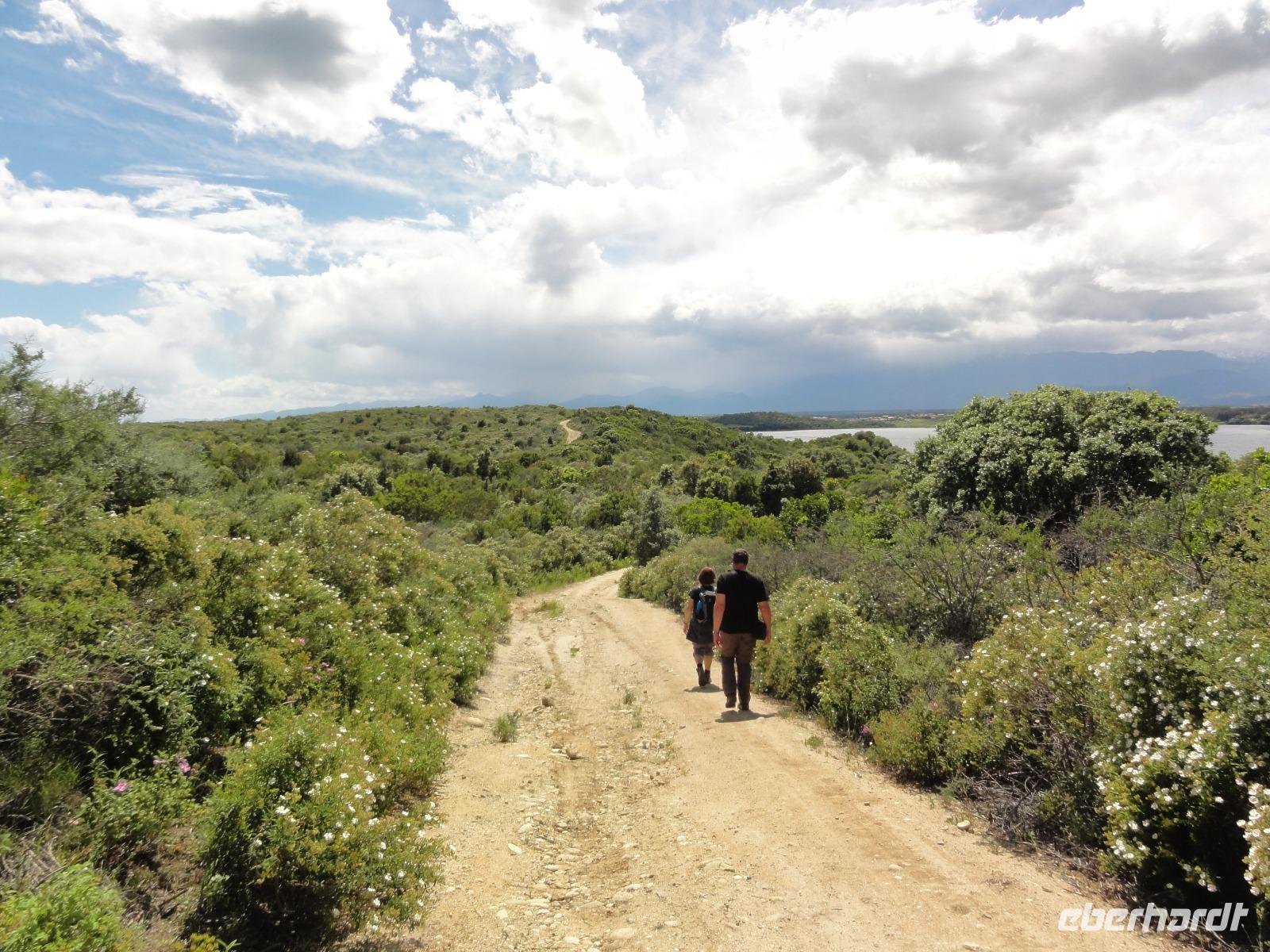 Der Tag heute beginnt mit einem Frühstück auf der Dachterrasse des Hotels. Wahnsinn... was für ein Blick auf die Bucht von Porto-Vecchio bei strahlendem Sonnenschein. Doch leider meint es das Wetter in den Bergen nicht so gut mit uns. Bei nur 2 Grad, Nebel und Regen können wir unsere geplante Wanderung zum Felsloch „Trou de la Bombe" am Col de Bavella aus Sicherheitsgründen nicht stattfinden lassen. Aber unser Yann hat natürlich Plan B parat, und so fahren wir nach Sari-Solenzara. Eric lässt uns an der Kirche in Sari aussteigen und wir begeben uns auf den Abstieg hinunter nach Solenzara. Wir fahren weiter entlang der „Costa Verde" die grüne Ostküste Korsikas, vorbei an riesigen Weinfeldern bis nach Aléria. Dort steigen wir am Lagunensee „Étang de Diane" aus und starten unsere zweite Wanderung für heute. Ein ausgedehnter Rundweg führt uns zum Wachturm „Tour de Diane" aus der Zeit der Genueser an der Mündung des Étang. Die Sicht ist hervorragend, und somit haben wir einen ausgezeichneten Blick auf die Inseln Elba und Monte Cristo. Unser „letztes" Picknick haben wir direkt am Strand unterhalb des Wachturms. Noch schnell ein paar Muscheln gesammelt und schon geht's zurück zum Bus. Auf dem Rückweg sehen wir die Fisch- und Austernzucht mitten auf dem See, und auch der „Christwürger" bietet sich als super Fotomotiv. Angekommen im „San Pellegrino" in Folelli begrüßt uns erneut Chantal und wir können rasch unsere Zimmer beziehen. Einige stürzen sich noch einmal in die Fluten bevor es um 19:00 Uhr zum Abendbrot geht.