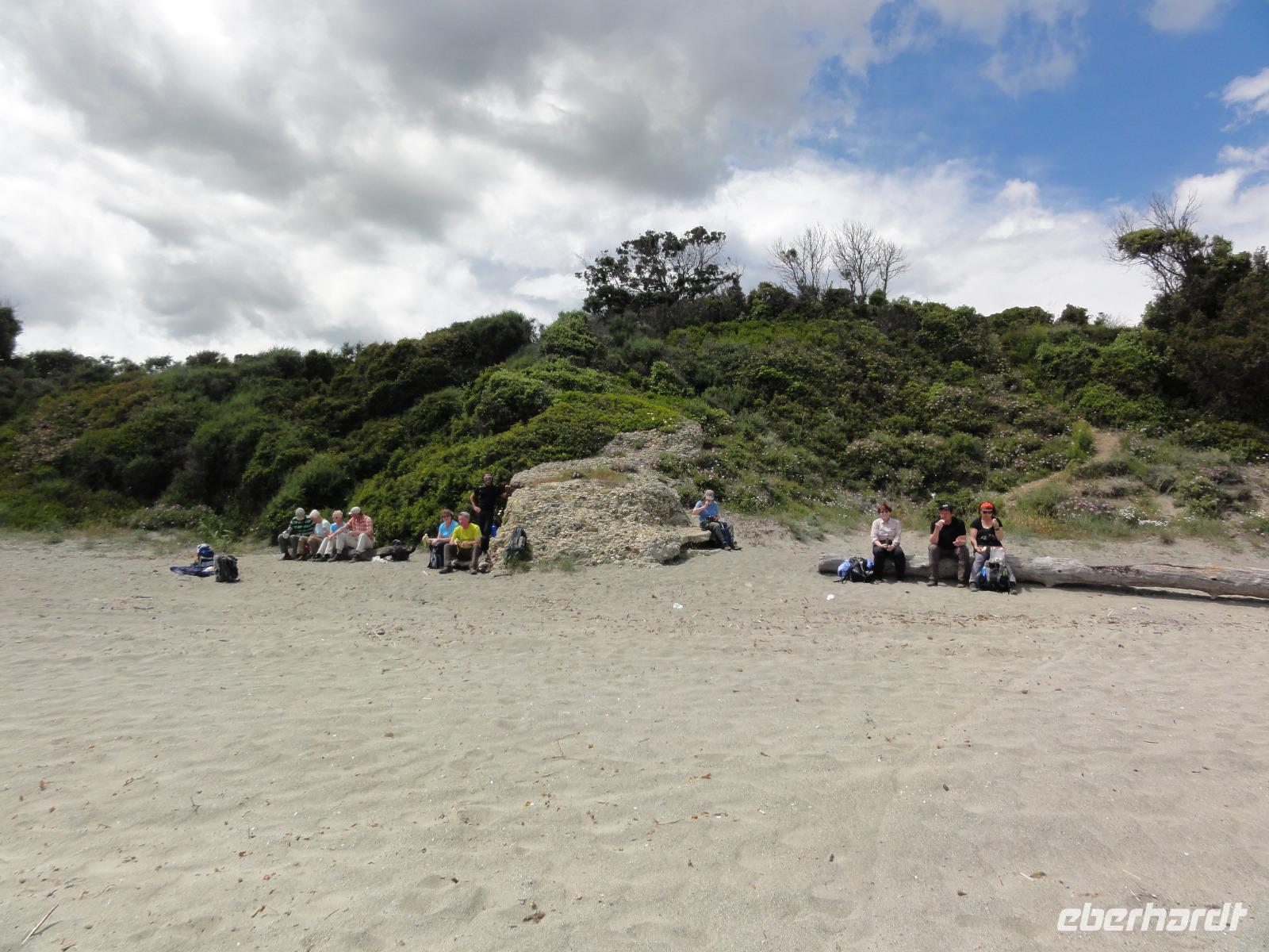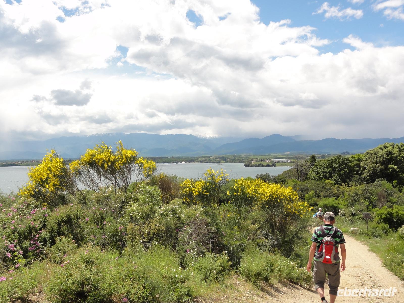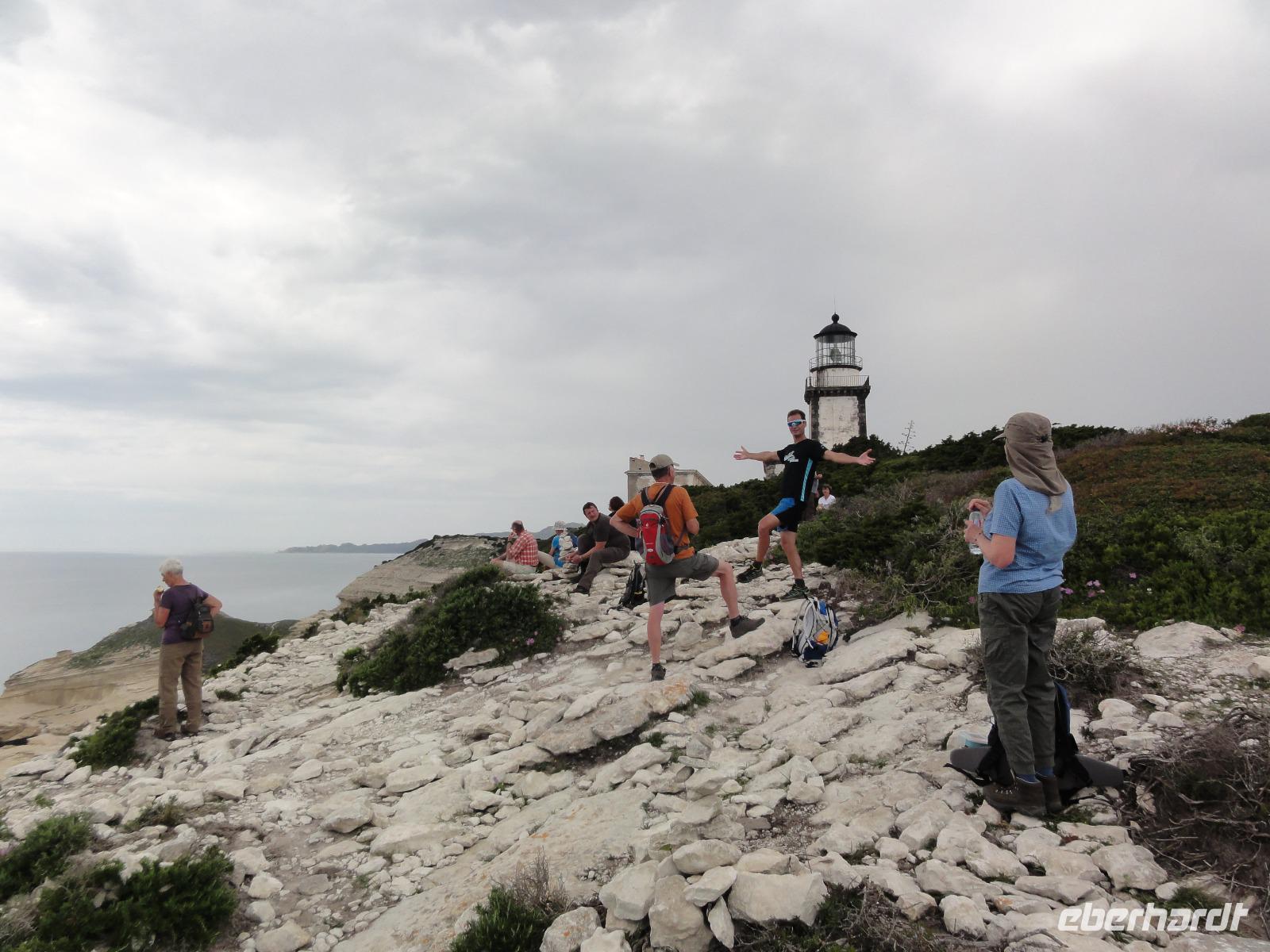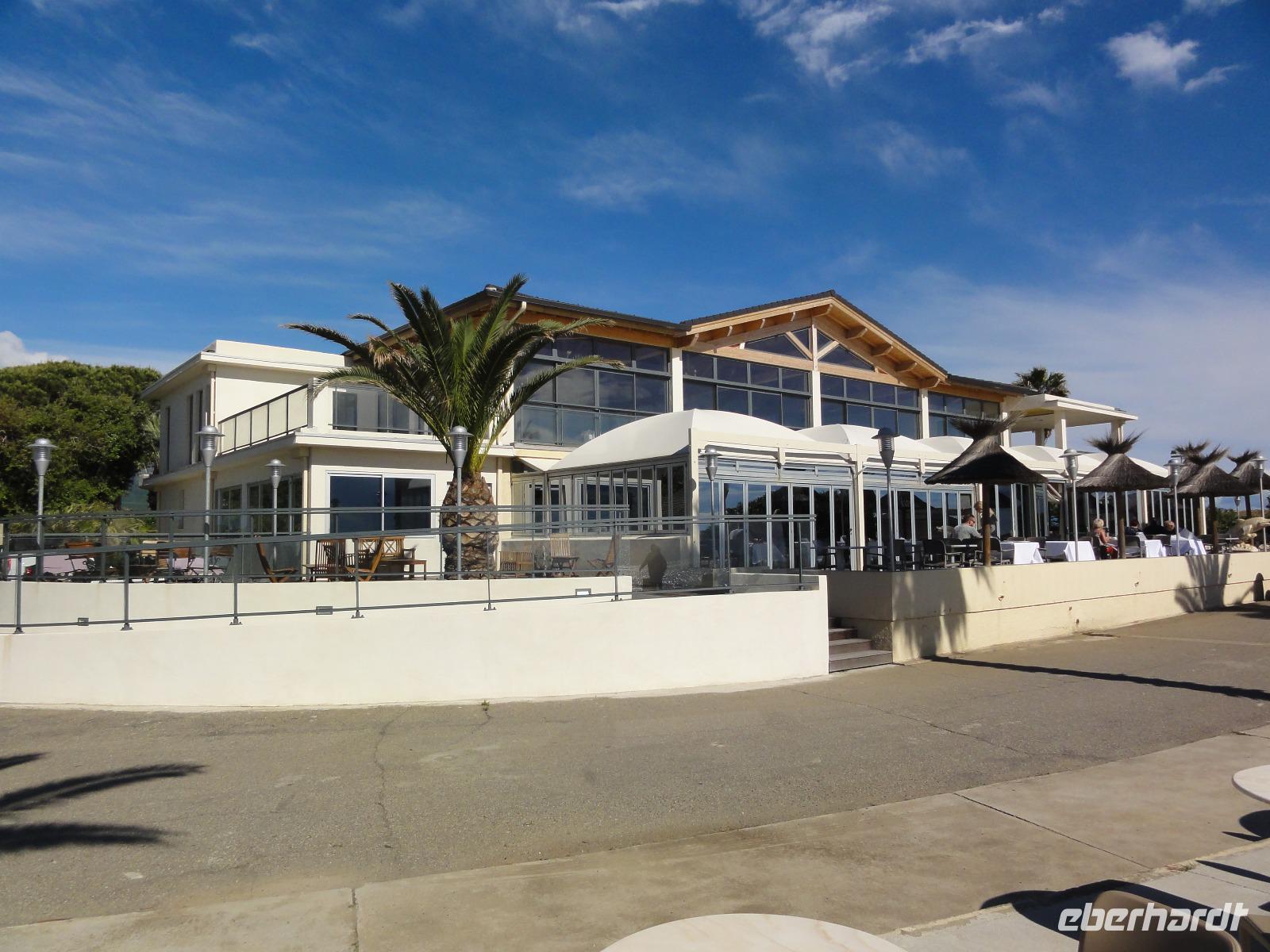 Der Tag heute beginnt mit einem Frühstück auf der Dachterrasse des Hotels. Wahnsinn... was für ein Blick auf die Bucht von Porto-Vecchio bei strahlendem Sonnenschein. Doch leider meint es das Wetter in den Bergen nicht so gut mit uns. Bei nur 2 Grad, Nebel und Regen können wir unsere geplante Wanderung zum Felsloch „Trou de la Bombe" am Col de Bavella aus Sicherheitsgründen nicht stattfinden lassen. Aber unser Yann hat natürlich Plan B parat, und so fahren wir nach Sari-Solenzara. Eric lässt uns an der Kirche in Sari aussteigen und wir begeben uns auf den Abstieg hinunter nach Solenzara. Wir fahren weiter entlang der „Costa Verde" die grüne Ostküste Korsikas, vorbei an riesigen Weinfeldern bis nach Aléria. Dort steigen wir am Lagunensee „Étang de Diane" aus und starten unsere zweite Wanderung für heute. Ein ausgedehnter Rundweg führt uns zum Wachturm „Tour de Diane" aus der Zeit der Genueser an der Mündung des Étang. Die Sicht ist hervorragend, und somit haben wir einen ausgezeichneten Blick auf die Inseln Elba und Monte Cristo. Unser „letztes" Picknick haben wir direkt am Strand unterhalb des Wachturms. Noch schnell ein paar Muscheln gesammelt und schon geht's zurück zum Bus. Auf dem Rückweg sehen wir die Fisch- und Austernzucht mitten auf dem See, und auch der „Christwürger" bietet sich als super Fotomotiv. Angekommen im „San Pellegrino" in Folelli begrüßt uns erneut Chantal und wir können rasch unsere Zimmer beziehen. Einige stürzen sich noch einmal in die Fluten bevor es um 19:00 Uhr zum Abendbrot geht.