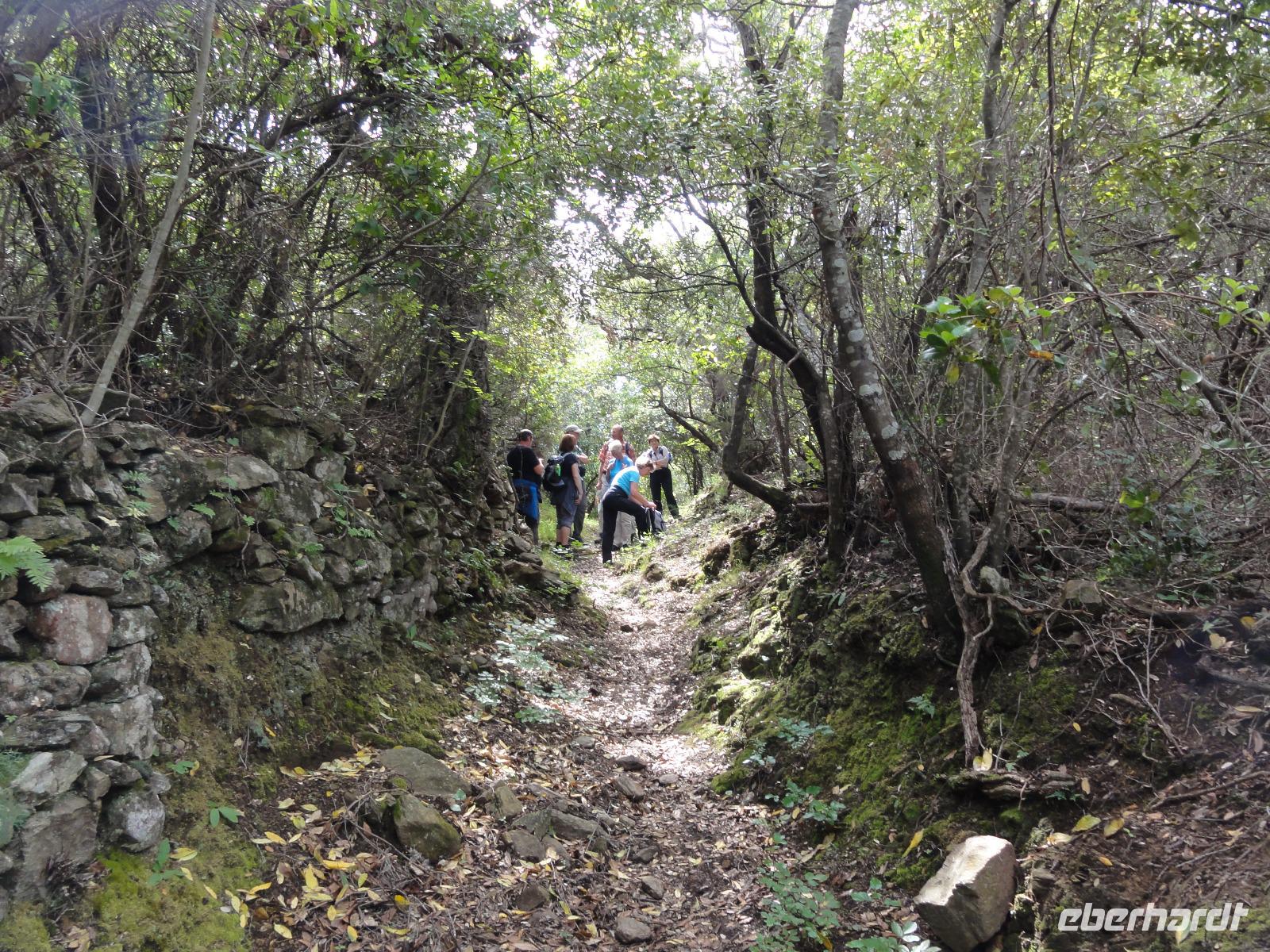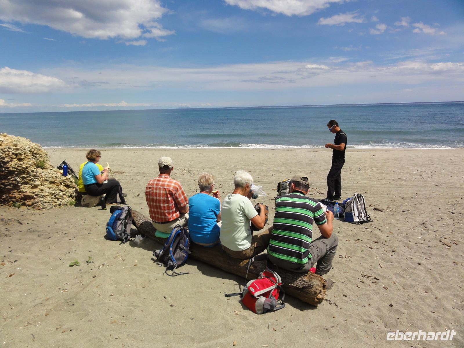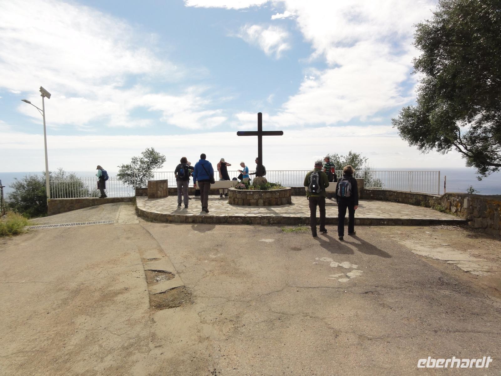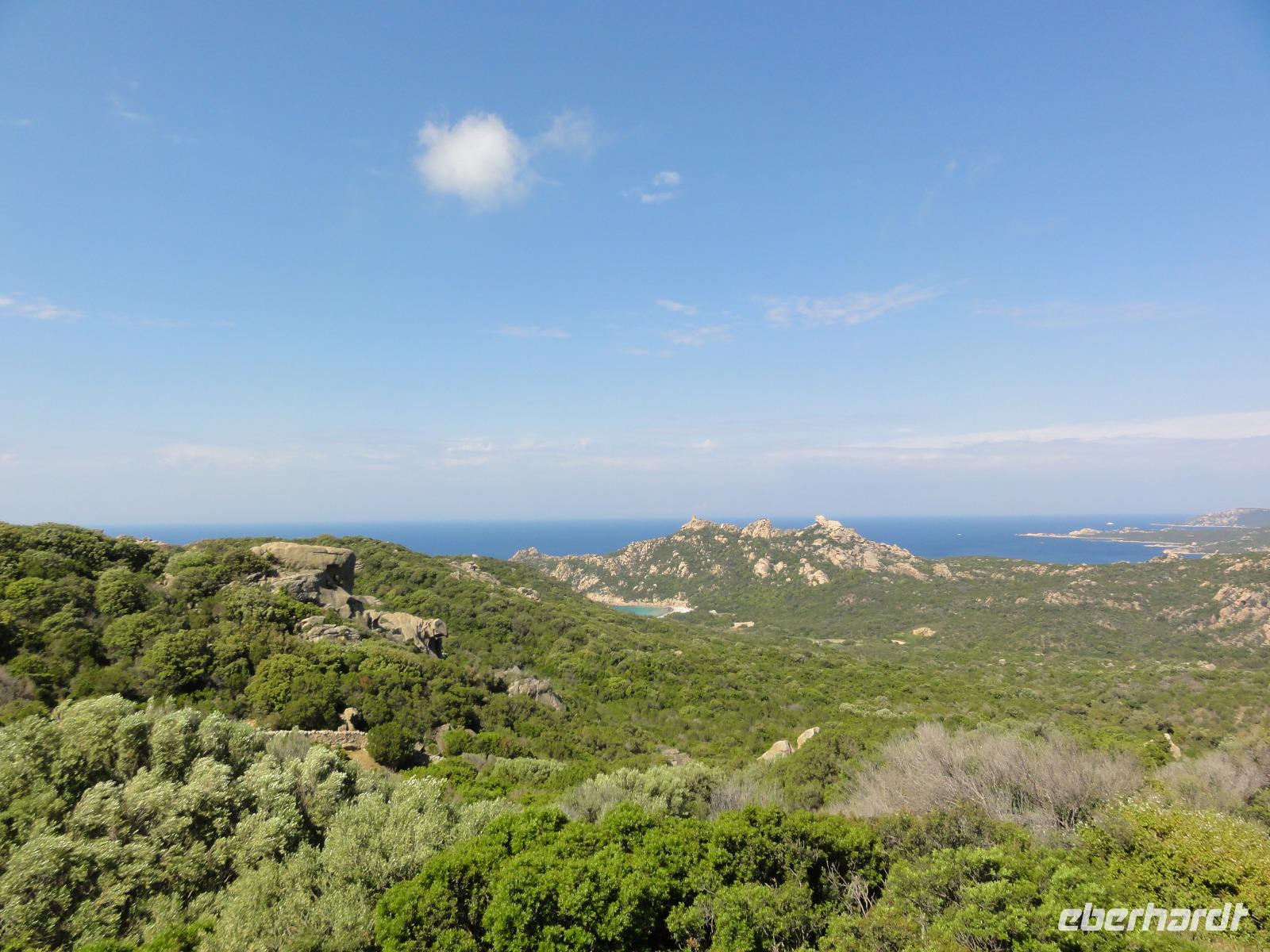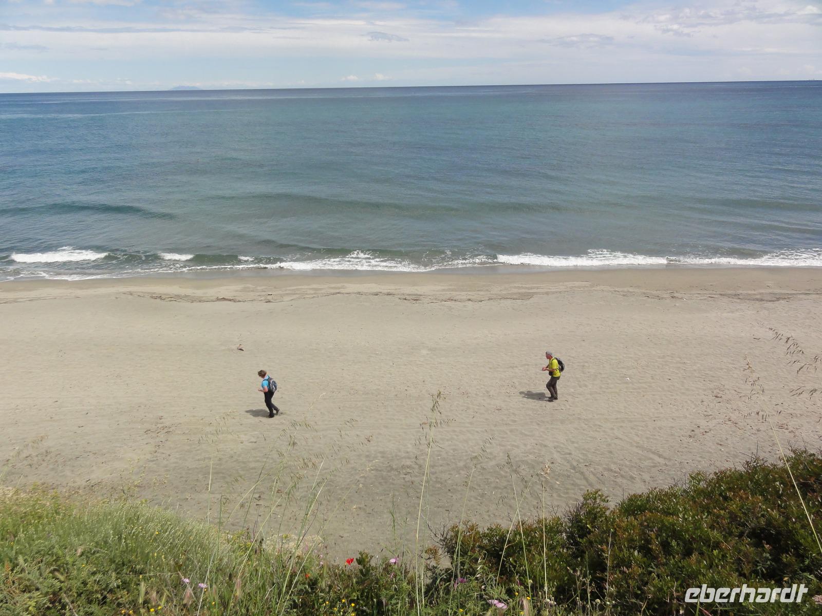 Der Tag heute beginnt mit einem Frühstück auf der Dachterrasse des Hotels. Wahnsinn... was für ein Blick auf die Bucht von Porto-Vecchio bei strahlendem Sonnenschein. Doch leider meint es das Wetter in den Bergen nicht so gut mit uns. Bei nur 2 Grad, Nebel und Regen können wir unsere geplante Wanderung zum Felsloch „Trou de la Bombe" am Col de Bavella aus Sicherheitsgründen nicht stattfinden lassen. Aber unser Yann hat natürlich Plan B parat, und so fahren wir nach Sari-Solenzara. Eric lässt uns an der Kirche in Sari aussteigen und wir begeben uns auf den Abstieg hinunter nach Solenzara. Wir fahren weiter entlang der „Costa Verde" die grüne Ostküste Korsikas, vorbei an riesigen Weinfeldern bis nach Aléria. Dort steigen wir am Lagunensee „Étang de Diane" aus und starten unsere zweite Wanderung für heute. Ein ausgedehnter Rundweg führt uns zum Wachturm „Tour de Diane" aus der Zeit der Genueser an der Mündung des Étang. Die Sicht ist hervorragend, und somit haben wir einen ausgezeichneten Blick auf die Inseln Elba und Monte Cristo. Unser „letztes" Picknick haben wir direkt am Strand unterhalb des Wachturms. Noch schnell ein paar Muscheln gesammelt und schon geht's zurück zum Bus. Auf dem Rückweg sehen wir die Fisch- und Austernzucht mitten auf dem See, und auch der „Christwürger" bietet sich als super Fotomotiv. Angekommen im „San Pellegrino" in Folelli begrüßt uns erneut Chantal und wir können rasch unsere Zimmer beziehen. Einige stürzen sich noch einmal in die Fluten bevor es um 19:00 Uhr zum Abendbrot geht.