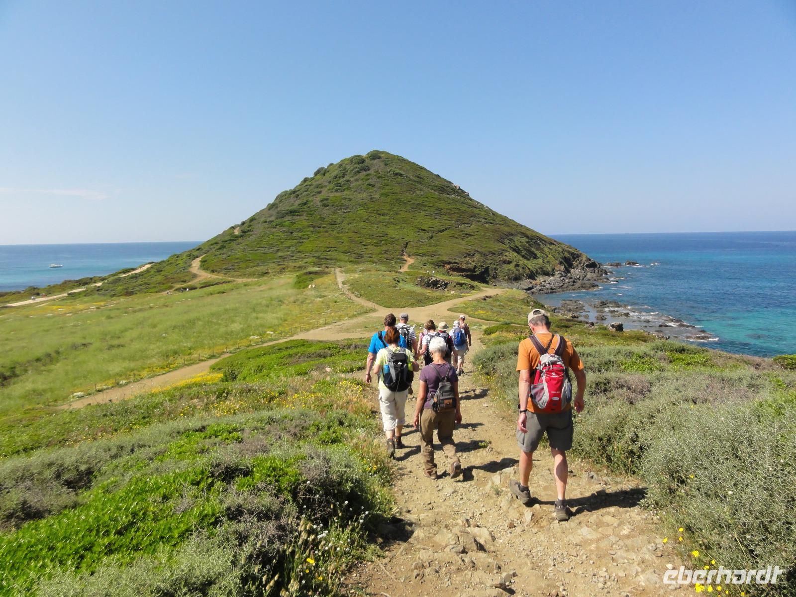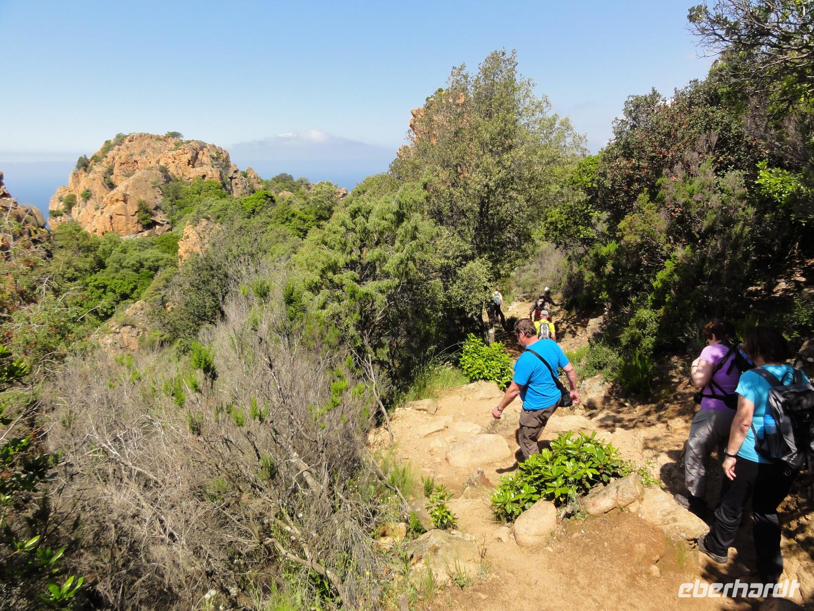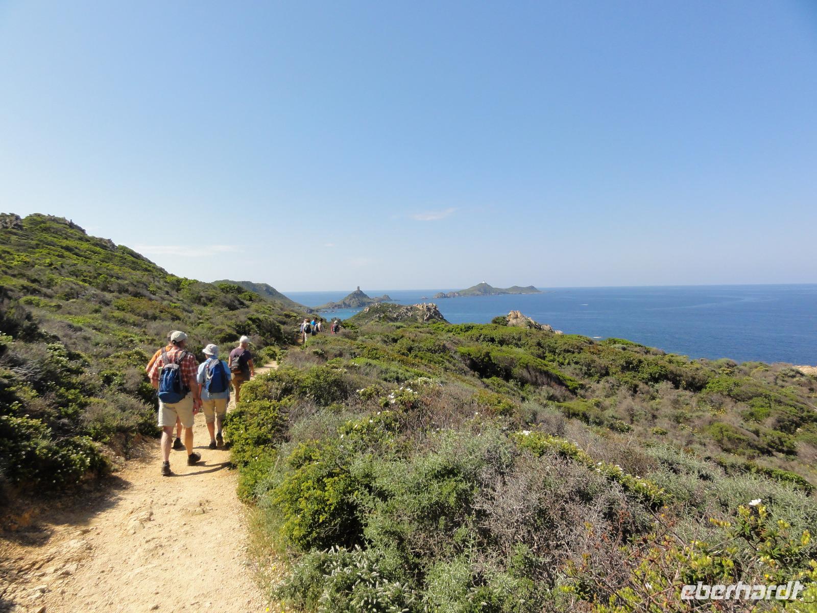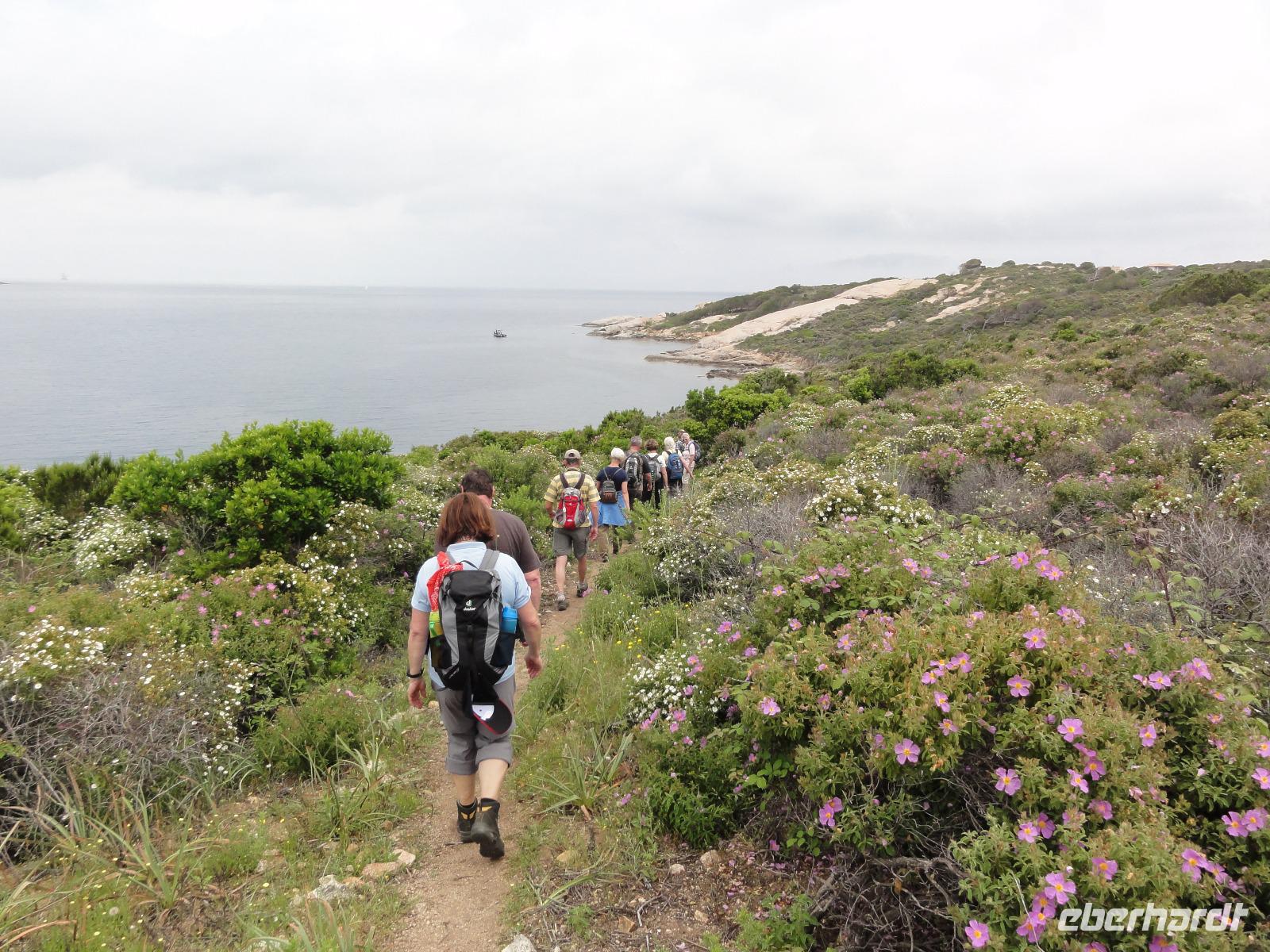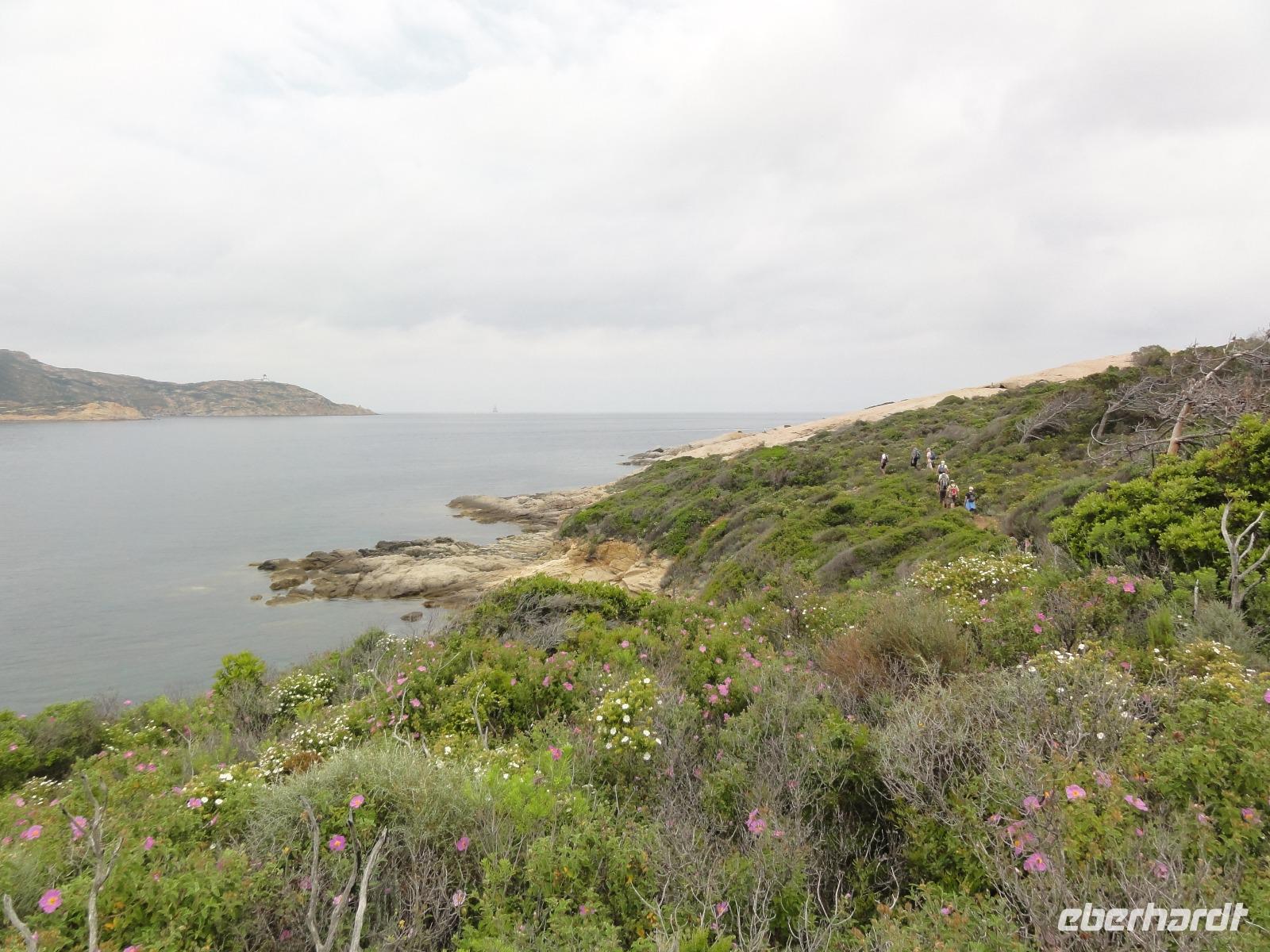 Der Tag beginnt heute um 07:00 Uhr bei einem Frühstück mit Blick auf das Meer. Wir stärken uns bei leckeren Croissants und frisch gepressten Orangensaft. Nun begrüßen wir unseren Yann, der uns die Insel in der kommenden Woche näher zeigen wird. Die Koffer sind gepackt und wir checken aus. Unser Busfahrer Eric holt uns 08:00 Uhr ab und Chantal wünscht uns eine schöne Wanderwoche. Nun fahren wir nach Calvi. Auf dem Weg dorthin halten wir an einem Supermarkt und decken uns mit Wasser, Brot und Obst ein. Angekommen in Calvi wandern wir die Küste entlang durch die duftende Macchia und haben einen fabelhaften Blick auf den Leuchtturm der „Revellata". Die dominierende Pflanze in der Macchia, vor allem in Küstennähe, ist im Mai die Zistrose. Sie blüht weiß und rosa, bringt das Buschwerk zum Leuchten und ist auch noch Namensgeber der Macchia. Denn Zistrose heißt auf korsisch „mucchiu". Die wohl prägendste Pflanze für den Geruch der Macchia ist die Immortelle, das "Currykraut". Durch das Trocknen dieser Pflanze behält sie ihre Farbe, duftet auch nach 10 Jahren noch und erhielt deshalb ihren Namen „Die Unsterbliche". Auch Mittelmeerstrohblume genannt, schmückt sie als goldene Sonne die Macchia. Nach unserer Wanderung haben wir noch knapp zwei Stunden für die Stadtbesichtigung mit der eindrucksvollen Zitadelle Calvis. Im Anschluss fahren wir mit dem Zug nach Algajola und beziehen unser Hotel „Serenada" für die nächsten zwei Nächte. Um 19:30 Uhr treffen wir uns zum Abendessen im Restaurant und lassen den ersten Wandertag bei einem Glas Wein ausklingen.