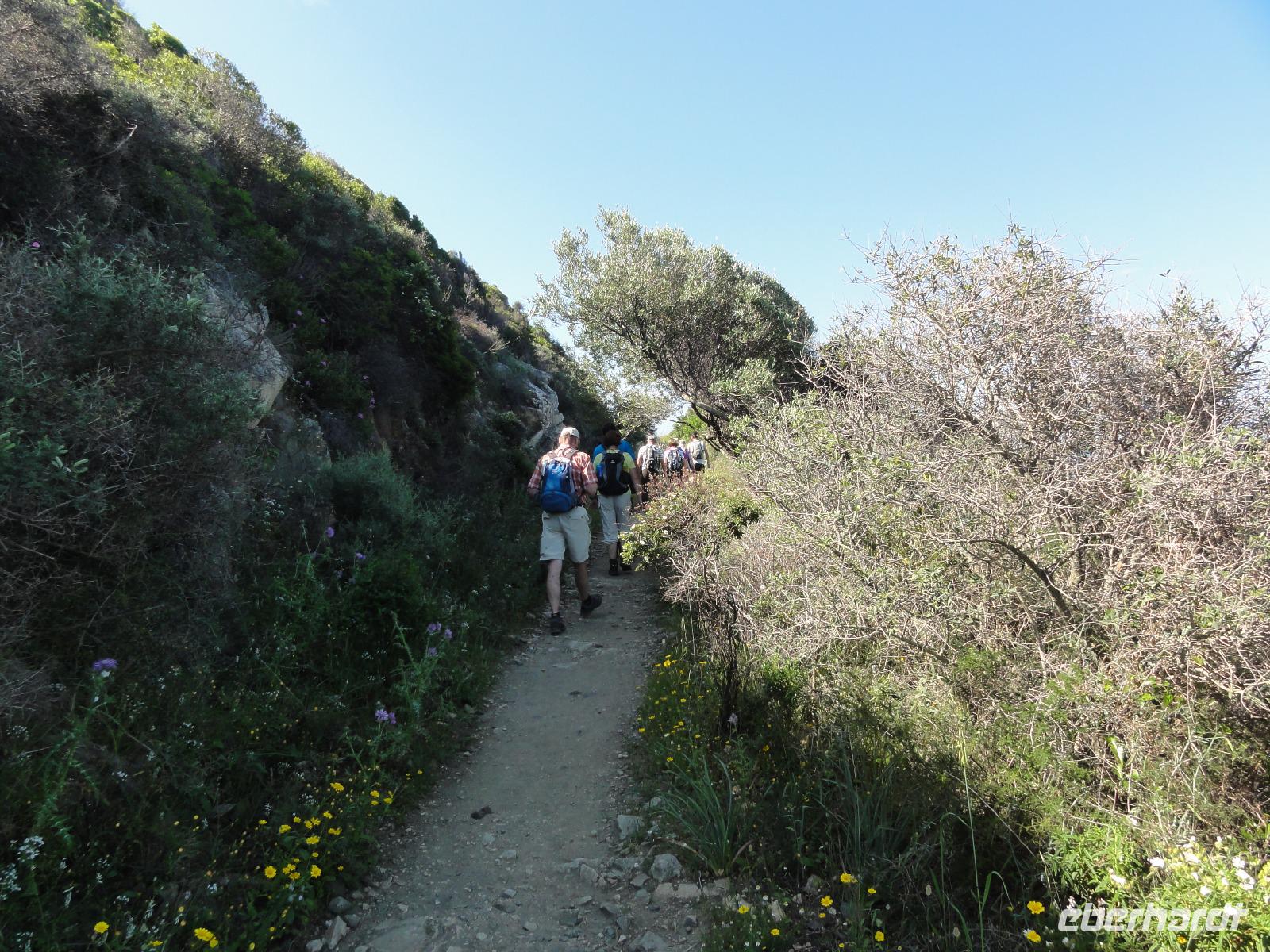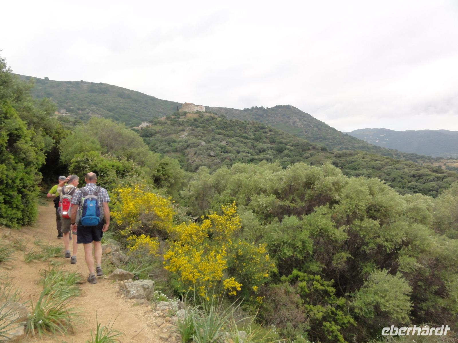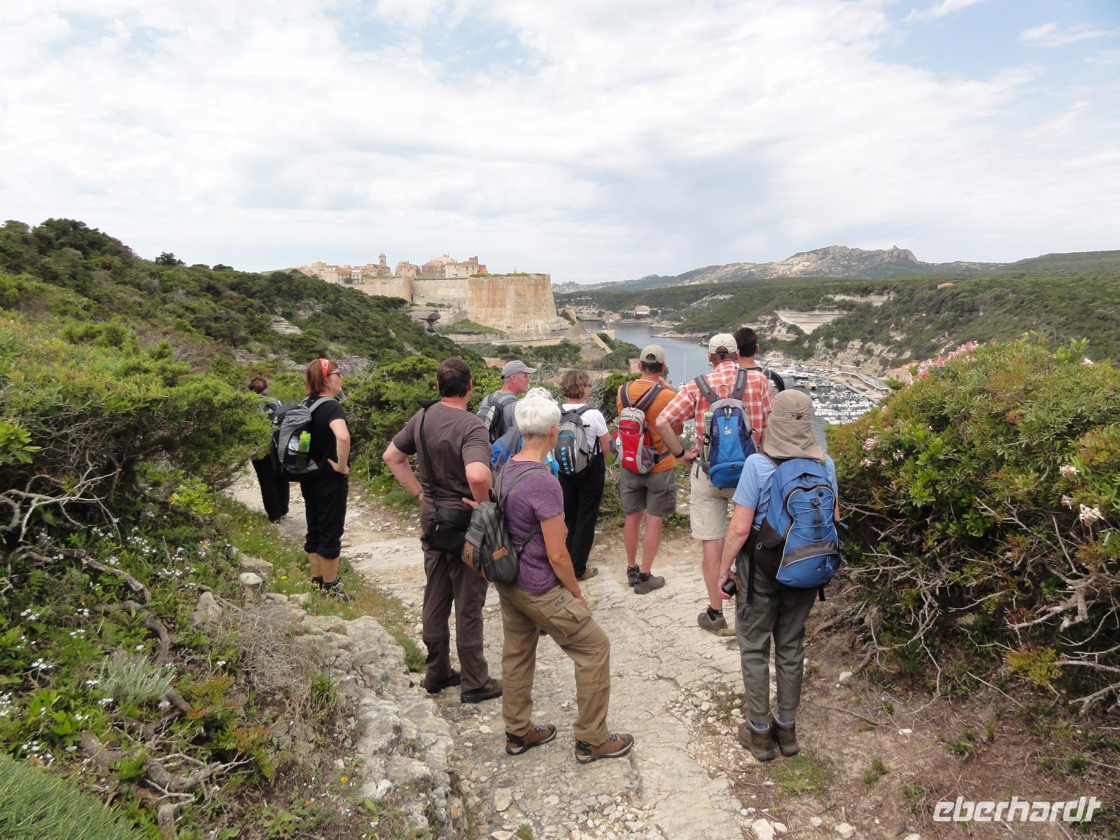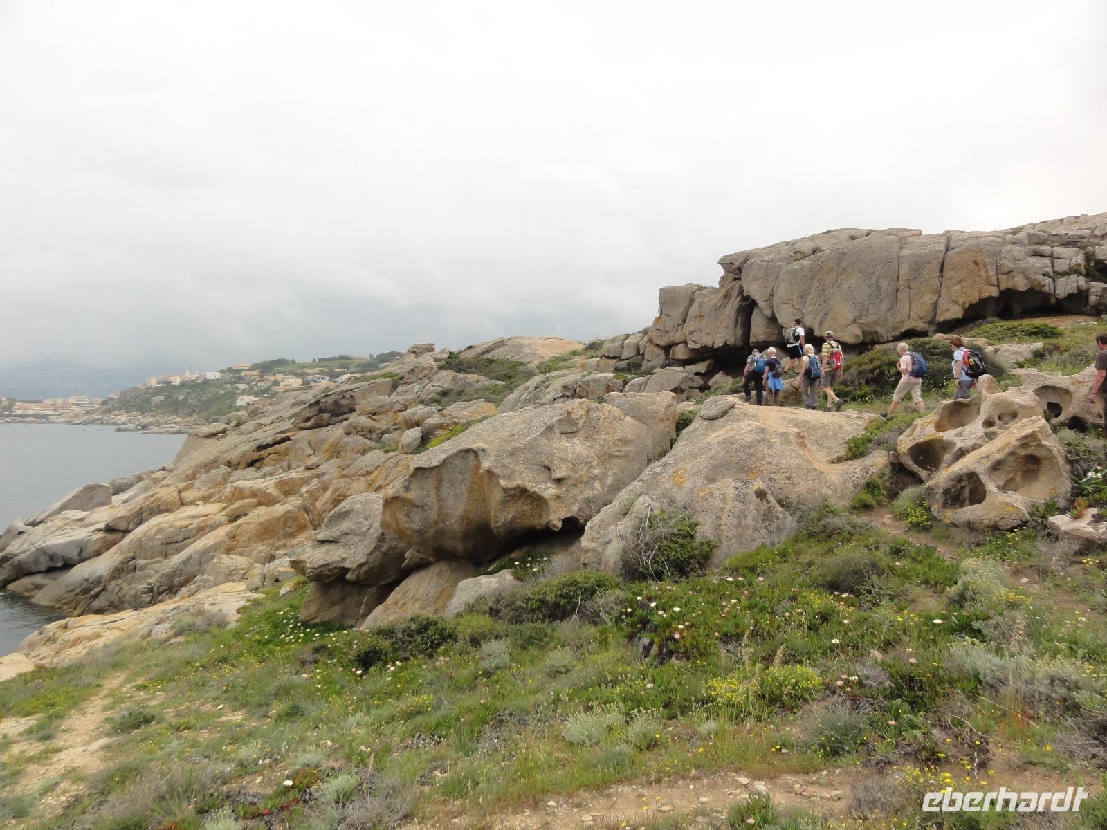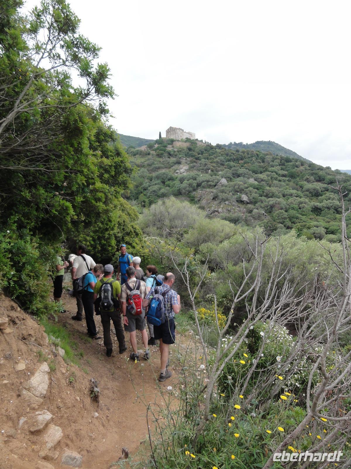 Der Tag beginnt heute um 07:00 Uhr bei einem Frühstück mit Blick auf das Meer. Wir stärken uns bei leckeren Croissants und frisch gepressten Orangensaft. Nun begrüßen wir unseren Yann, der uns die Insel in der kommenden Woche näher zeigen wird. Die Koffer sind gepackt und wir checken aus. Unser Busfahrer Eric holt uns 08:00 Uhr ab und Chantal wünscht uns eine schöne Wanderwoche. Nun fahren wir nach Calvi. Auf dem Weg dorthin halten wir an einem Supermarkt und decken uns mit Wasser, Brot und Obst ein. Angekommen in Calvi wandern wir die Küste entlang durch die duftende Macchia und haben einen fabelhaften Blick auf den Leuchtturm der „Revellata". Die dominierende Pflanze in der Macchia, vor allem in Küstennähe, ist im Mai die Zistrose. Sie blüht weiß und rosa, bringt das Buschwerk zum Leuchten und ist auch noch Namensgeber der Macchia. Denn Zistrose heißt auf korsisch „mucchiu". Die wohl prägendste Pflanze für den Geruch der Macchia ist die Immortelle, das "Currykraut". Durch das Trocknen dieser Pflanze behält sie ihre Farbe, duftet auch nach 10 Jahren noch und erhielt deshalb ihren Namen „Die Unsterbliche". Auch Mittelmeerstrohblume genannt, schmückt sie als goldene Sonne die Macchia. Nach unserer Wanderung haben wir noch knapp zwei Stunden für die Stadtbesichtigung mit der eindrucksvollen Zitadelle Calvis. Im Anschluss fahren wir mit dem Zug nach Algajola und beziehen unser Hotel „Serenada" für die nächsten zwei Nächte. Um 19:30 Uhr treffen wir uns zum Abendessen im Restaurant und lassen den ersten Wandertag bei einem Glas Wein ausklingen.