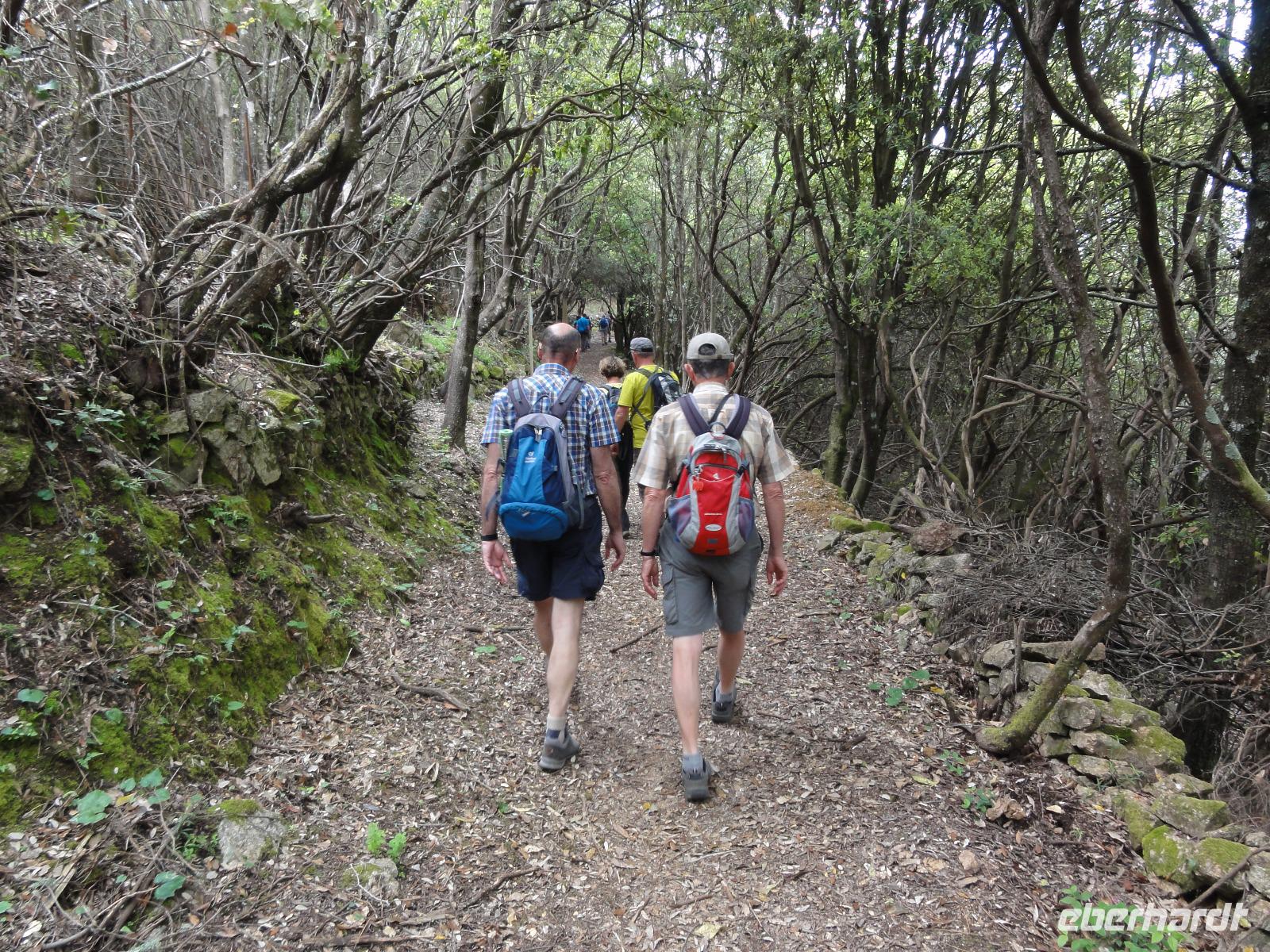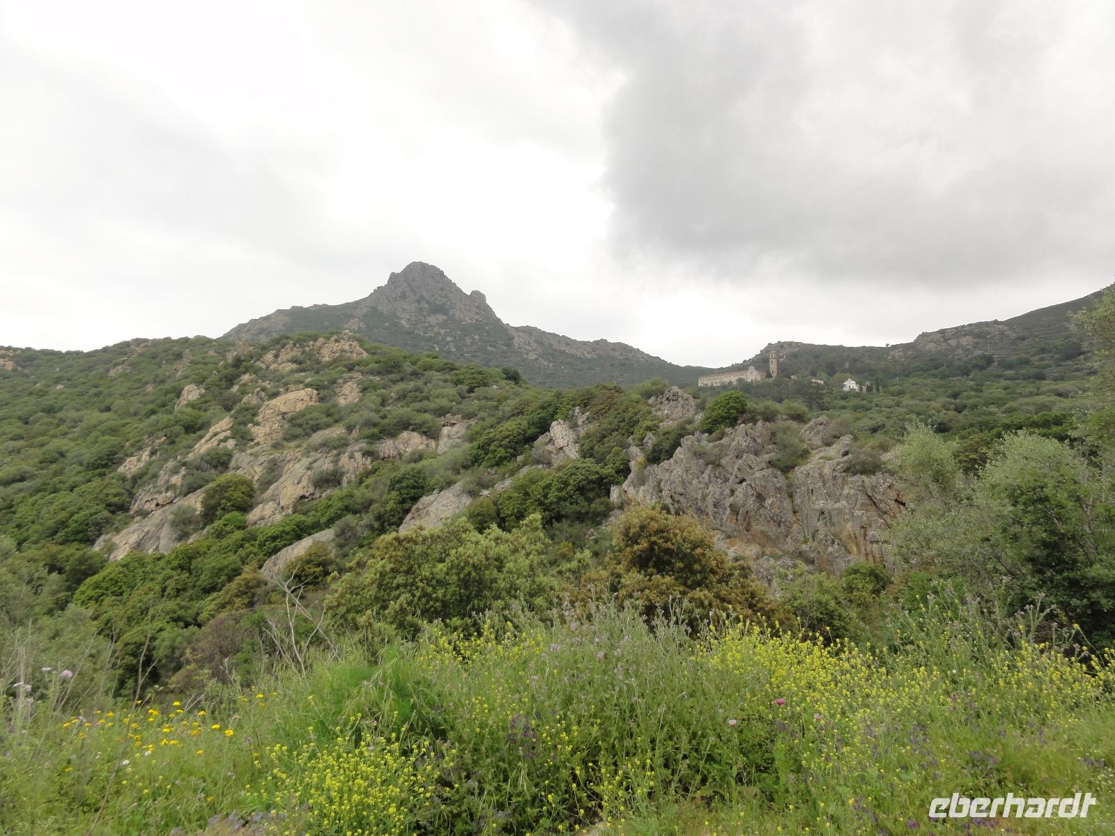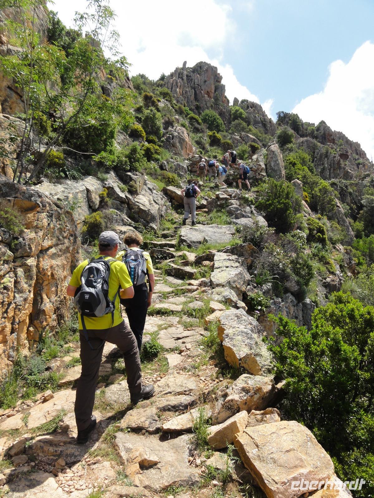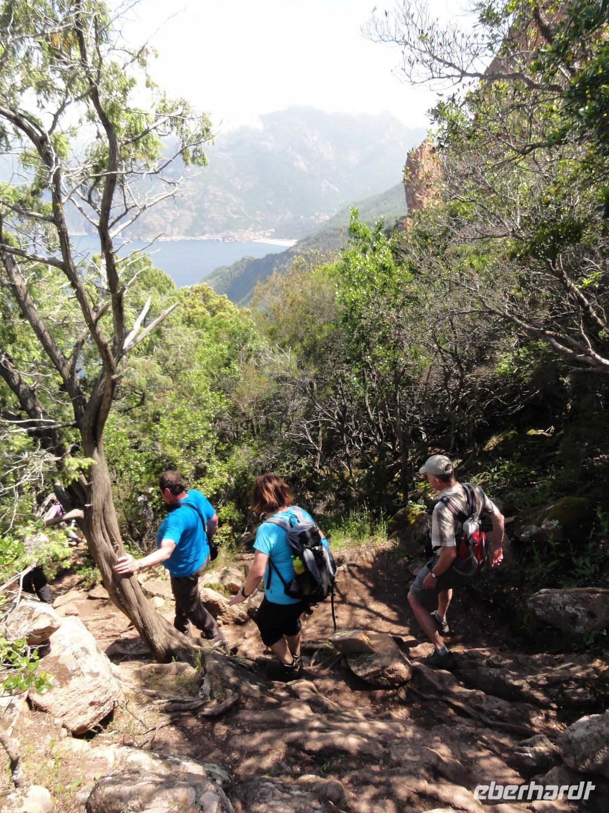 Bei schönstem Wetter treffen wir uns 06:15 Uhr auf dem Flughafen in Dresden. Einige von uns nehmen den Haustürtransfer in Anspruch. Nachdem die Gruppe vollzählig ist, machen wir uns auf den Weg zum Germanwings-Schalter um unser Gepäck aufzugeben. Eingecheckt sind wir bereits, und so ist es eine Sache von Sekunden, bis alle Ihre Koffer abgeben haben. Auf geht's zur Sicherheitskontrolle und wie immer wird die Reisebegleitung komplett gescannt :-) Aber nach einem intensiven Check des Flughafenpersonals nehmen wir in der Nähe das Gate 4 Platz und warten bis die Anzeige „Boarding EW 27" auf dem Bildschirm erscheint. Um 07:45 Uhr ist es soweit und wir können unsere Plätze im Airbus beziehen. Nach nur 50 Minuten landen wir auf dem Flughafen Köln-Bonn. Wir verlassen den Flieger und begeben uns direkt zum Anschlussgate C30. Von hier fliegen wir 11:20 Uhr zum endgültigen Zielort Bastia auf Korsika. Bei strahlendem Sonnenschein landen wir überpünktlich um 13:00 Uhr auf dem Flughafen Bastia-Poretta. Schnell durch die Passkontrolle und ab zum Kofferband wo bereits unser „Chauffeur" Eric auf uns wartet. Eric wird uns die komplette Woche begleiten und fährt uns, nachdem jeder seinen Koffer hat, direkt nach Folelli in unser Hotel „San Pellegrino". Hier werden wir die erste und die letzte Nacht auf unserer Wanderreise übernachten. Unsere liebe Chantal begrüßt uns im Bus und verteilt die Zimmerschlüssel. Um 14:00 Uhr hat jeder sein Quartier bezogen und verbringt individuell seine Zeit bis zum Abendbrot 19:00 Uhr. Wer mutig ist testet das Mittelmeer direkt vor seiner Tür, unternimmt einen Spaziergang in die Stadt oder macht eine „Siesta" :-)