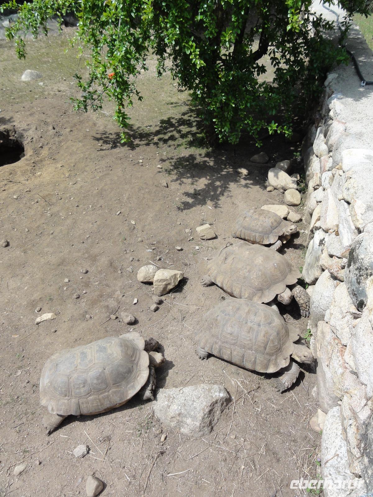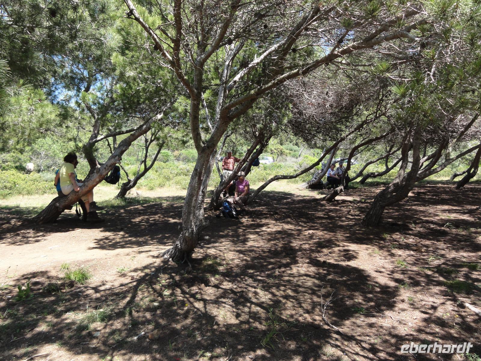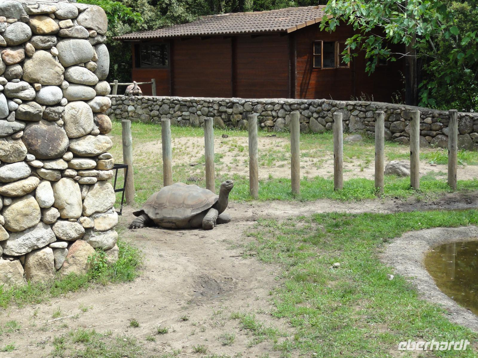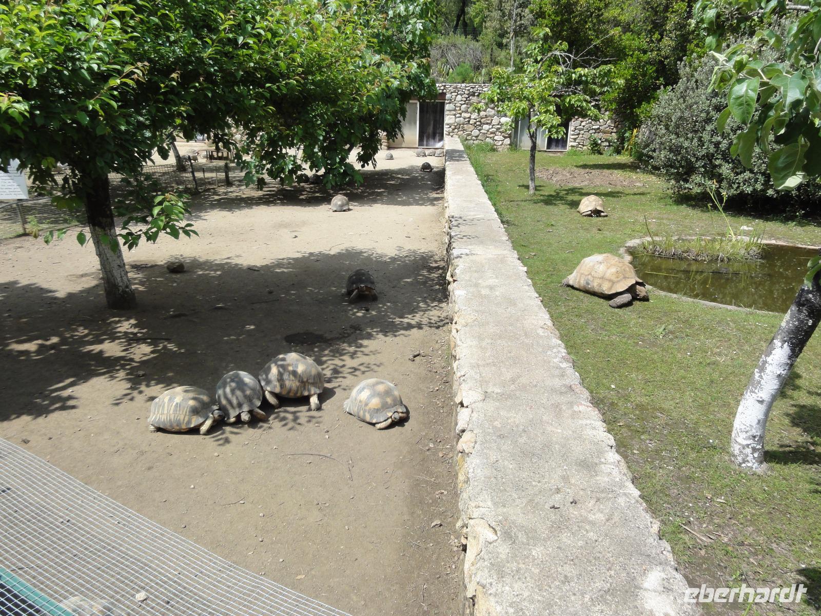 Nach dem Frühstück fahren wir ein kurzes Stück in eine Bucht Ajaccios und beginnen am Strand die Wanderung zum „Tour de la Parata". Ziel ist der Wachturm mit Blick auf die „Îles Sanguinaires", die vier Blutinseln, am nördlichen Ende des Golf von Ajaccio. Der Name rührt von den farbenprächtigen Sonnenuntergängen her. Oft verschwindet die Sonne als blutroter Ball im Meer und taucht die bereits rötlichen Felsen in ein tiefes Rot, das die Inseln von der Küste aus wie Blutstropfen im Meer erscheinen lässt. Am Ende der Wanderung um 12:00 Uhr machen wir ein ausgedehntes Picknick im Pinienwald. Die gebogen Stämme der Bäume bieten uns einen fabelhaften Sitzplatz und Schatten zugleich. Im Anschluss holt uns Eric ab und fährt uns in den Schildkrötenpark „A Cupulatta", hier sind über 150 verschiedene Schildkrötenarten untergebracht und man trifft auf exotische Bewohner wie die Riesenschildkröten von den Seychellen und Galapagos-Inseln. Das „wilde Treiben" der Schildis treibt uns ein Lächeln ins Gesicht :-)