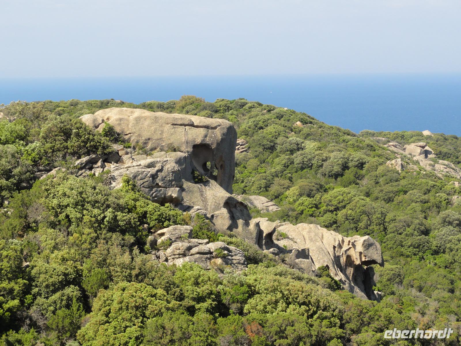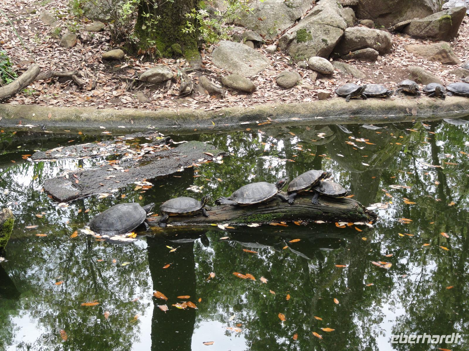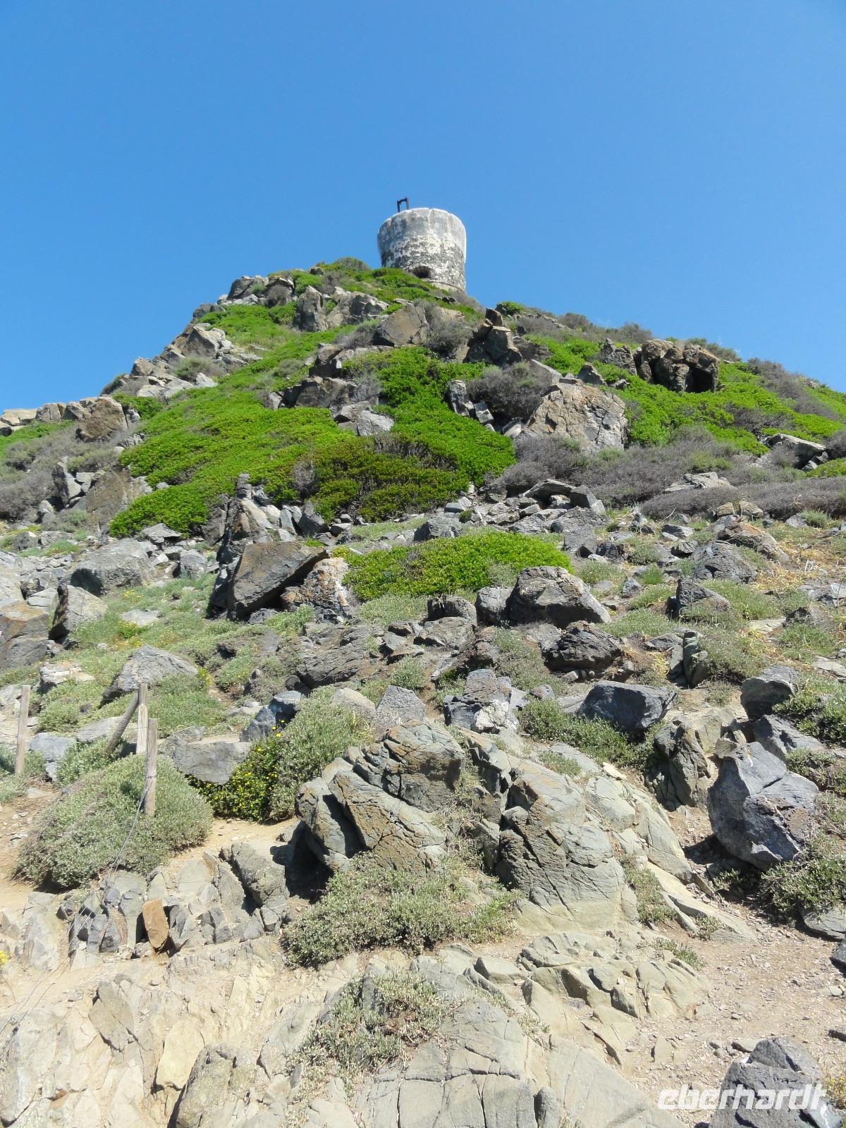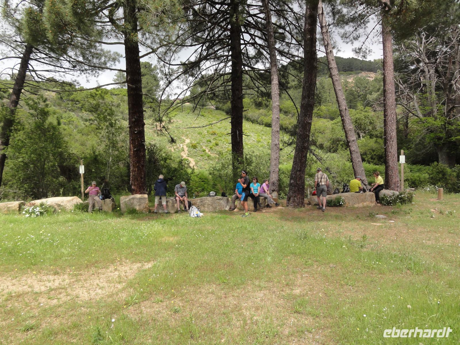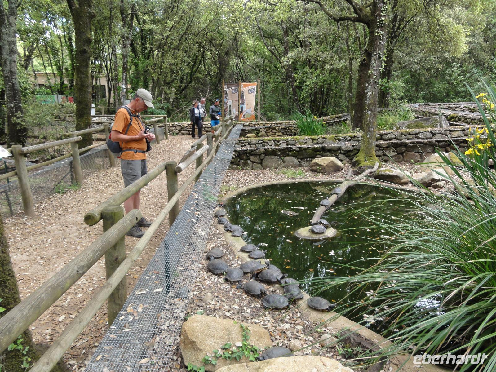 Nach dem Frühstück fahren wir ein kurzes Stück in eine Bucht Ajaccios und beginnen am Strand die Wanderung zum „Tour de la Parata". Ziel ist der Wachturm mit Blick auf die „Îles Sanguinaires", die vier Blutinseln, am nördlichen Ende des Golf von Ajaccio. Der Name rührt von den farbenprächtigen Sonnenuntergängen her. Oft verschwindet die Sonne als blutroter Ball im Meer und taucht die bereits rötlichen Felsen in ein tiefes Rot, das die Inseln von der Küste aus wie Blutstropfen im Meer erscheinen lässt. Am Ende der Wanderung um 12:00 Uhr machen wir ein ausgedehntes Picknick im Pinienwald. Die gebogen Stämme der Bäume bieten uns einen fabelhaften Sitzplatz und Schatten zugleich. Im Anschluss holt uns Eric ab und fährt uns in den Schildkrötenpark „A Cupulatta", hier sind über 150 verschiedene Schildkrötenarten untergebracht und man trifft auf exotische Bewohner wie die Riesenschildkröten von den Seychellen und Galapagos-Inseln. Das „wilde Treiben" der Schildis treibt uns ein Lächeln ins Gesicht :-)
