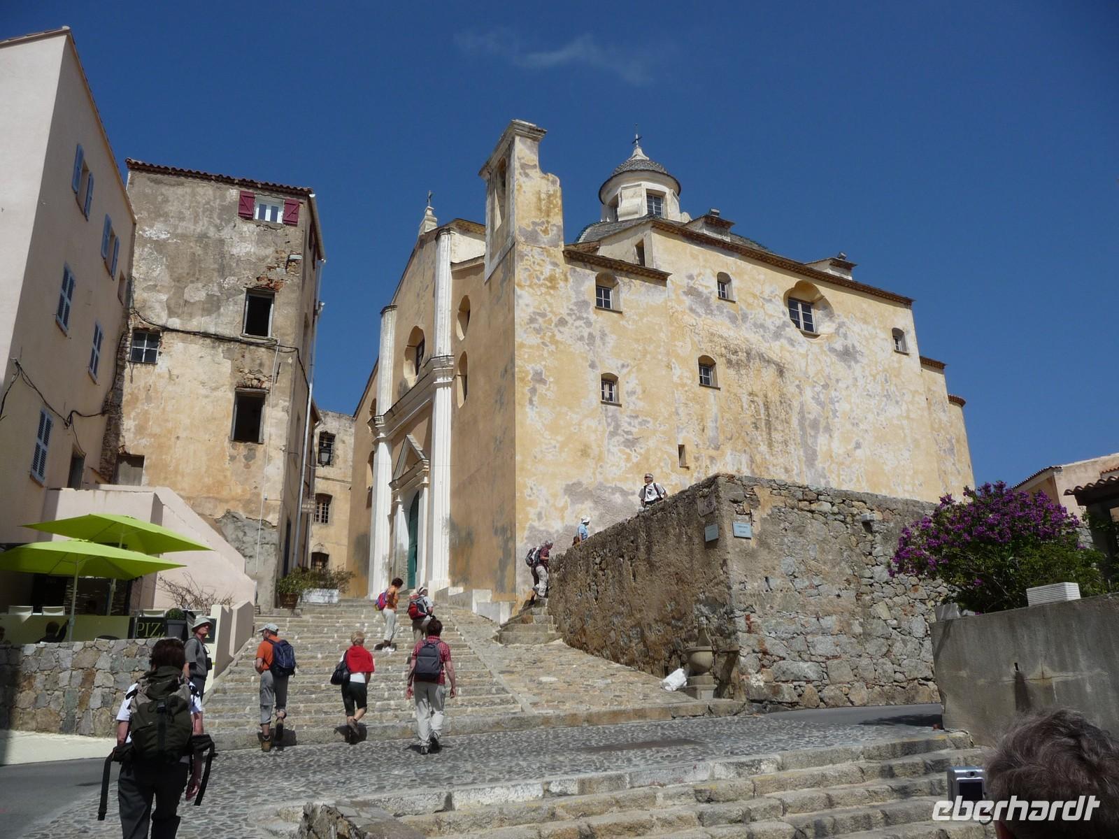 Bevor wir unsere Wanderung in der Nähe von Calvi beginnen können, müssen wir noch eine Fahrtstrecke von etwa 120 km zurücklegen. Daher verlassen wir das Hotel auch heute wieder bereits um 08:00 Uhr. Kurz vor Calvi steigen wir aus unserem Bus und wandern durch Macchiahänge - zum Teil relativ steil bergauf und bergab - bis zur Kapelle Notre Dame de la Serra. Während die Reisegäste die grandiose Aussicht auf die Bucht von Calvi genießen, bereiten der örtliche Wanderreiseleiter, der Buschauffeur und ich gemeinsam das Picknick mit korsischen Leckereien vor. Besonders Käse und Brot munden uns sehr. Dazu noch ein Schlückchen Wein, was will man mehr. Der Rückweg führt etwas steil, aber größtenteils schattig in das Zentrum nach Calvi. Hier führt uns unser örtlicher Reiseleiter Michel noch durch die Zitadelle, bevor wir anschließend Zeit haben, das Städtchen individuell zu erkunden.