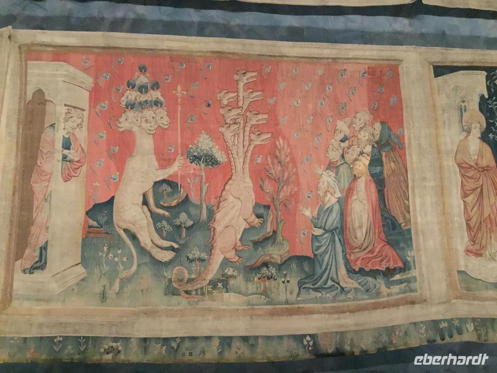 Nach unserem Frühstück wechseln wir die Flussseite. Wir legen in Bouchemaine an. Wieder einmal zaubert die Küche und wohl gestärkt, brechen wir zu unserer Stadtbesichtigung auf. In Angers wollen wir das Schloss, den Wandteppich mit dem Zyklus der Apokalypse und nun endlich unseren Stadtführer Jürgen kennenlernen.