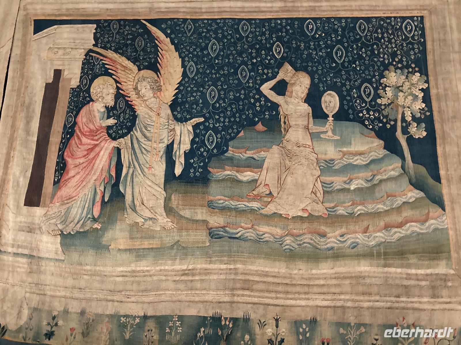 Zum Frühstück hat die Loire Princesse Nantes verlassen und macht eine kleine Rundtour auf der Loire im Gebiet von Nantes. Ein bisschen Frühsport wird gefolgt von einem spannenden Vortrag über die Loire und ihre Schlösser. Pünktlich zu unserem Ausflug und dem Mittagessen legt unser Schiff wieder in Nantes an. Ein weiteres Schloss werden wir heute besichtigen. Aber zugegeben, es hat mit den prachtvollen Schlösser im Loiretal wenig gemein. Dafür befindet sich in seinen Mauern ein einzigartiges Kunstwerk: der Wandteppich der Apokalypse. Vollendet wurdet dieser wohl um das Jahr 1382. Heute sind nicht mehr alle urspünglichen Teile erhalte. Denn die Bilder umfassten einen Gesamtlänge von mehr als 140 m. Erzählt wird die Johannes Offenbarung. Doch es ist weniger die Darstellung des biblischen Textes, sondern vielmehr die Verbildlichung der Geschichte: die stete Bedrohung durch die Engländer. Ein wirkmächtiges Kunstwerk, was immer wieder in seinen Bann zieht.