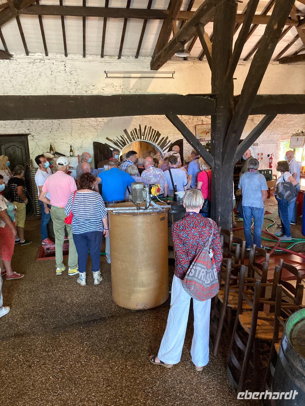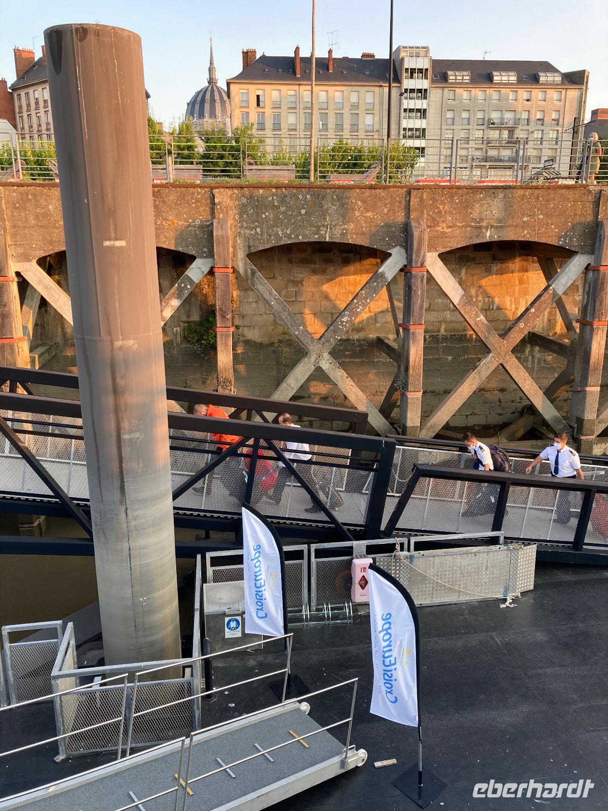 Die einstige Hauptstadt der Bretagne steht am Vormittag auf dem Programm. Mit einer Kombination aus Stadtrundfahrt und Rundgang wollen wir diese wachsende Stadt kennenlernen. Wir tauchen in die Geschichte der Bretagne ein und lernen eine bedeutende Frau kennen, Anne de Bretagne. Sie hat beim Zusammenkommen mit Frankreich Privilegien ausgehandelt, was sie für die Bretonen so bedeutsam macht, dass viele bretonische Mädchen ihren Vornamen dieser Frau zu verdanken haben. Aber Nantes hat noch so viel mehr zu bieten. Jules Vernes ist ein Sohn dieser Stadt und mit Les Machines werden seine Geschichten erlebbar. Nantes ist aber auch eine Stadt, die durch den Sklavenhandel reich wurde und es hat bis in unsere Zeit gedauert, dass sich die Bewohner diesem Teil ihrer Geschichte stellten und stellen. So viele Eindrücke machen hungrig und so kehren wir zum Essen auf das Schiff zurück. Hier angekommen, teilt mir die Zahlmeisterin mit, dass das Schiff wegen des Niedrigwassers bis zu unserer Abreise in Nantes verbleiben wird. Normalerweise reicht die Flut aus, um die Loire Princesse flussaufwärts in Richtung Ancenis zu bringen. Doch dieses Mal kommen zwei Faktoren ungünstigerweise zusammen: Zum einen hat die Loire selbst sehr wenig Wasser zu dieser Jahreszeit. Zum hat die Flut nicht die gewünschte Stärke. Nach dem Essen starten wir zu unserer Weinprobe, die uns sogar noch nach Italien führt.
