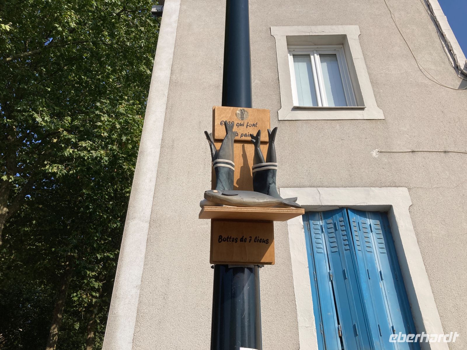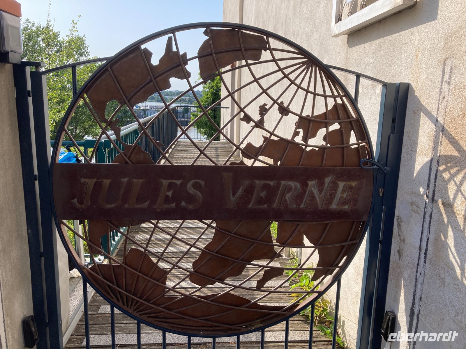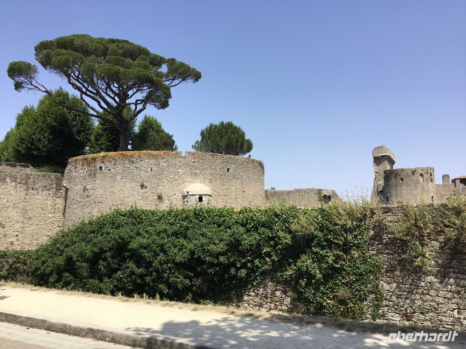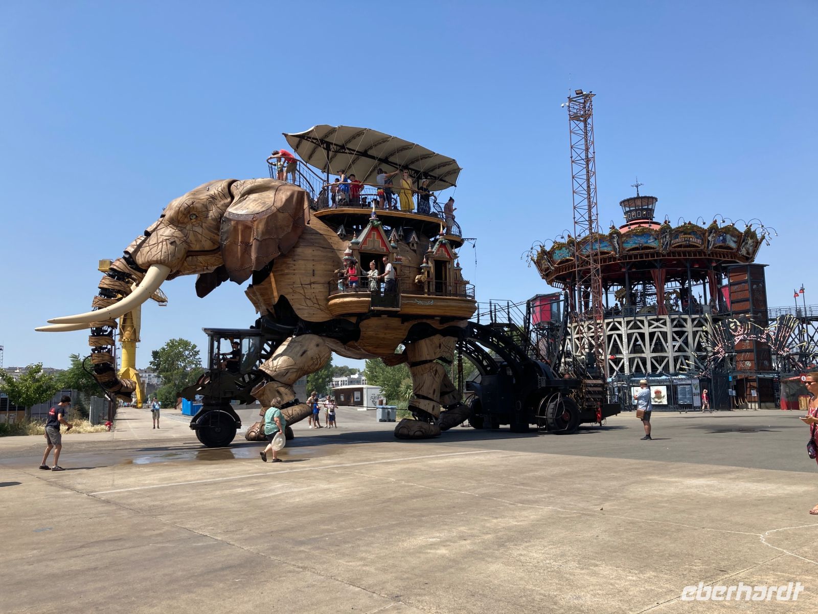 Mit dem Monument gegen die Sklaverei haben wir dann die Brücke der Anne de Bretagne erreicht. Diese müssen wir noch überqueren. Auf der anderen Flussseite begrüßt uns nun auch das Wahrzeichen Nantes: der Elefant. Auf dem Schiff gönnen wir uns eine kleine Pause und Abkühlung beim Mittagessen, bevor wir zum Nachmittagsausflug nach Clisson und zur Weinprobe aufbrechen. Da unser Thermometer mittlerweile stattlich 40 Grad anzeigt, passen wir das Programm der Hitze an und laufen heute etwas anders durch Clisson. Die Weinprobe, bei der wir den Muscadet, den Begleiter für Austern und Meeresfrüchte in Frankreich probieren, sitzen wir im Kühlen sehr angenehm. Den Abend in Nantes verbringen die meisten auf dem Deck oder in der klimatisierten Bar. Der Hochsommer hat nun wirklich begonnen.