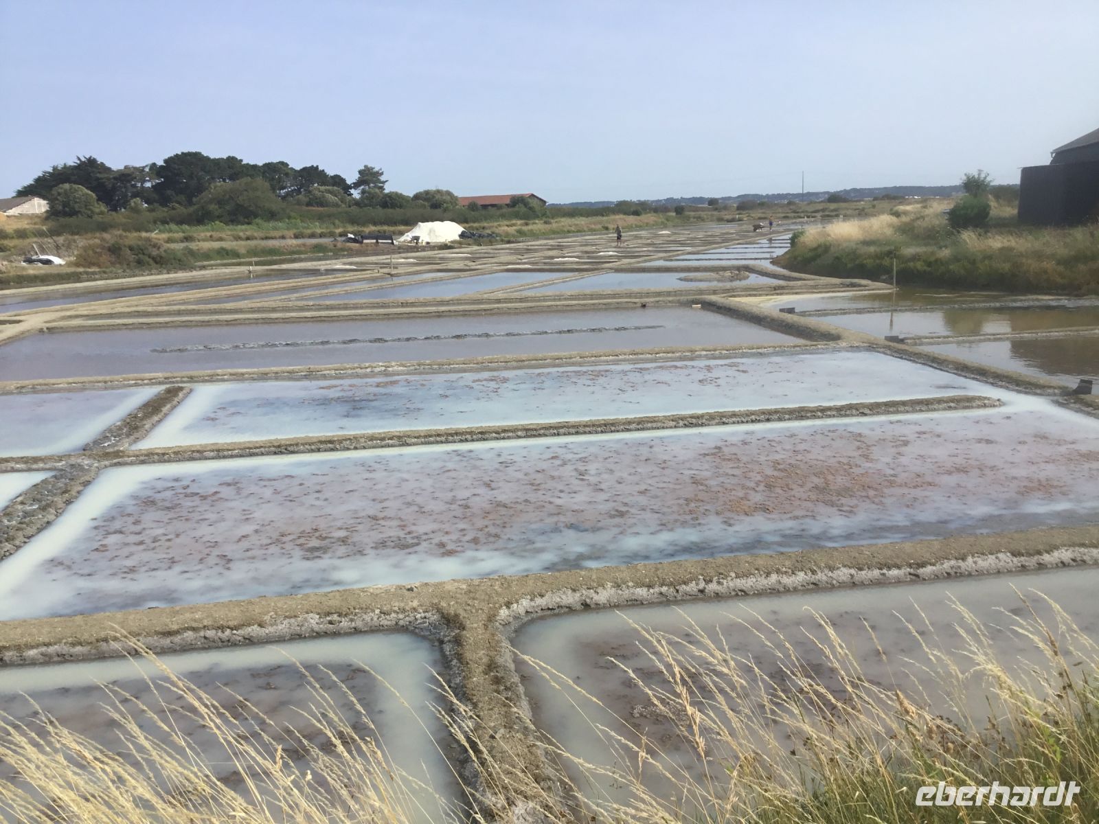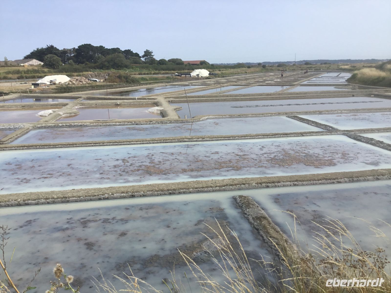 Wir besteigen jedoch unseren Bus und fahren ein wenig die Küste entlang, um dann einen Blick auf die Salzgewinnung zu werfen. Die Paludiers, die Salzbauern, sind schon sehr aktiv. Juli und insbesondere der August ist die Hochzeit der Ernte des weißen Goldes der Bretagne.