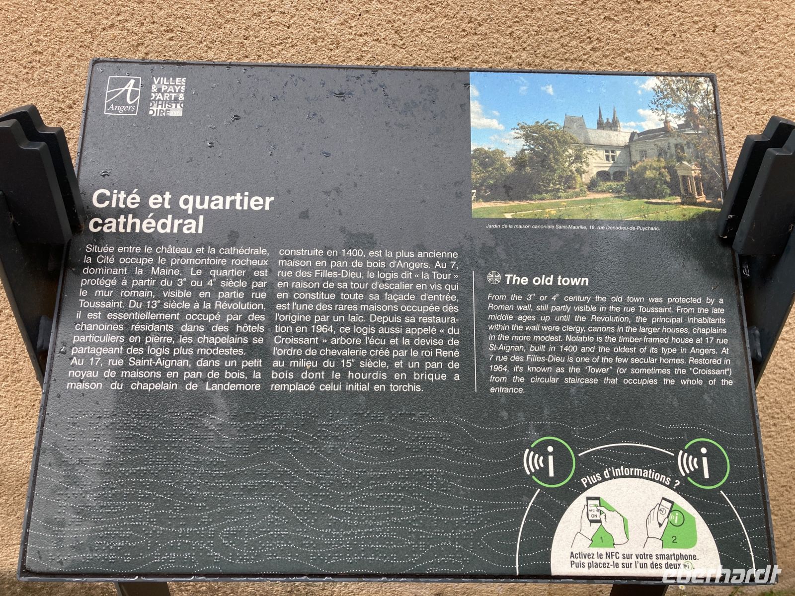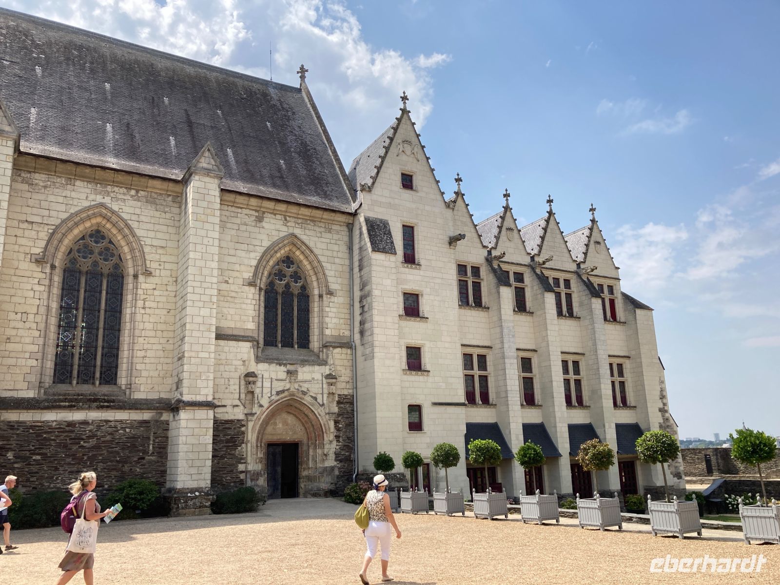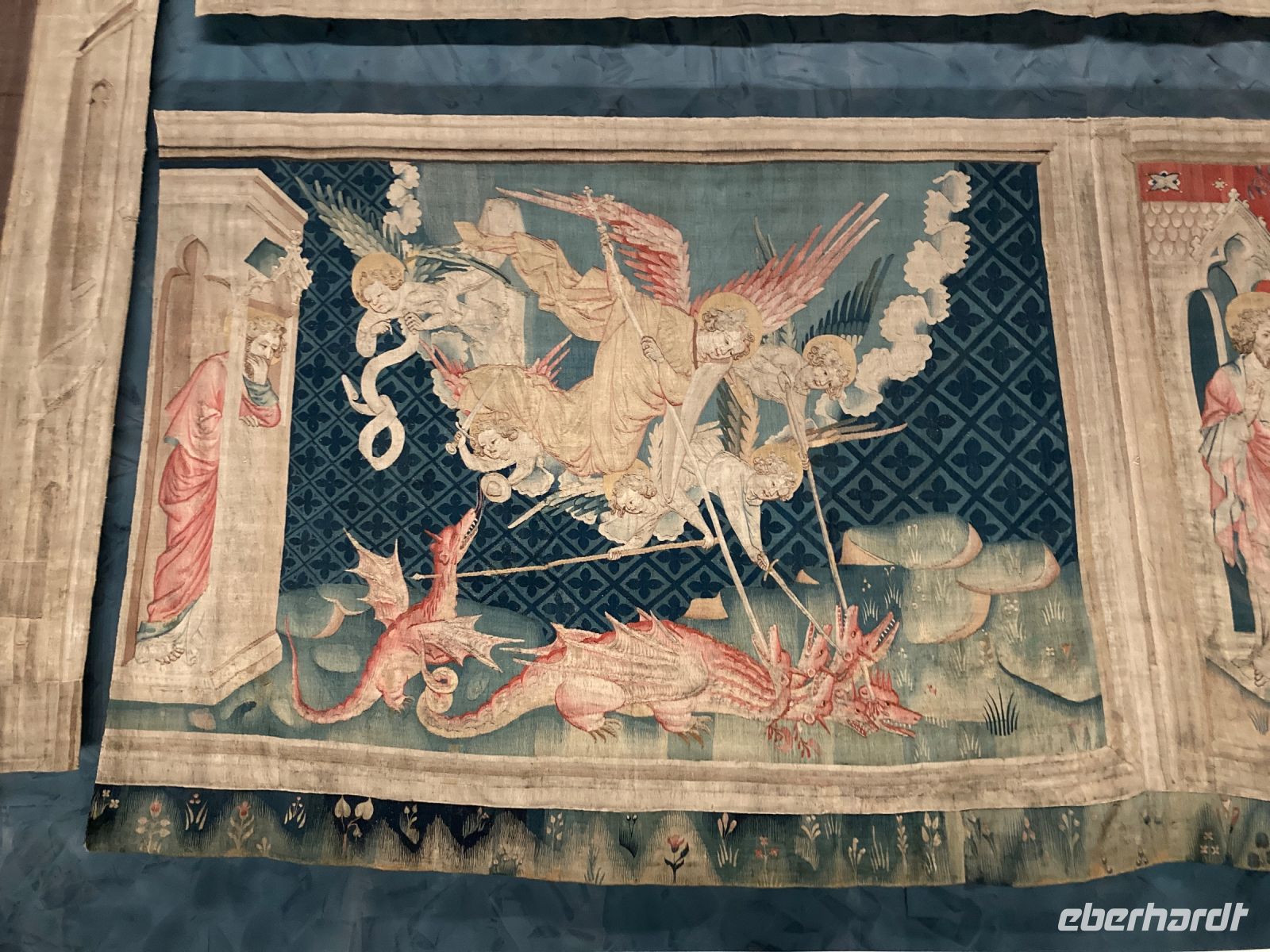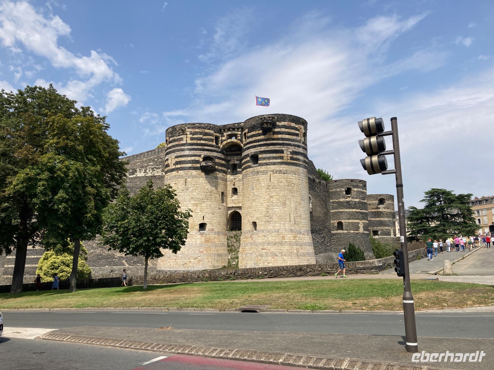Wir genießen umso mehr die Zeit an Bord und erreichen gegen Mittag Ancenis, von wo wir unseren Ausflug nach Angers starten. Angers gehört nicht nur zu den Städten mit der höchsten Lebensqualität aus Sicht der Franzosen, sie weist darüber ein mächtiges Schloss und einen Kulturschatz ersten Ranges auf: den Wandteppich der Apokalypse. Dass dieser Zyklus gerade im Schloss von Angers aufbewahrt wird, ist kein Zufall. Das Schloss von Angers war der Sitz der Herzöge von Anjou. Diese waren reich und mächtig. Der König Frankreichs Charles V. lieh in den 1370er Jahren ein Manuskript, nach dem Louis I. d’Anjou die Teppiche in Auftrag gab. Eine wechselvolle Geschichte könnten die Teppiche erzählen, denn nicht immer wurden sie ihrem Rang angemessen gepflegt. Dies ist auch der Grund, warum leider nicht mehr alle Teile vorhanden sind. Eindrücklich sind die verbliebenen 103 Meter Länge und 4,50 Meter Höhe allemal. Uns reicht noch die Zeit für einen Rundgang durch die Altstadt von Angers, bevor wir dann unseren Rückweg zum Schiff antreten, wo uns heute der Galaabend erwartet.