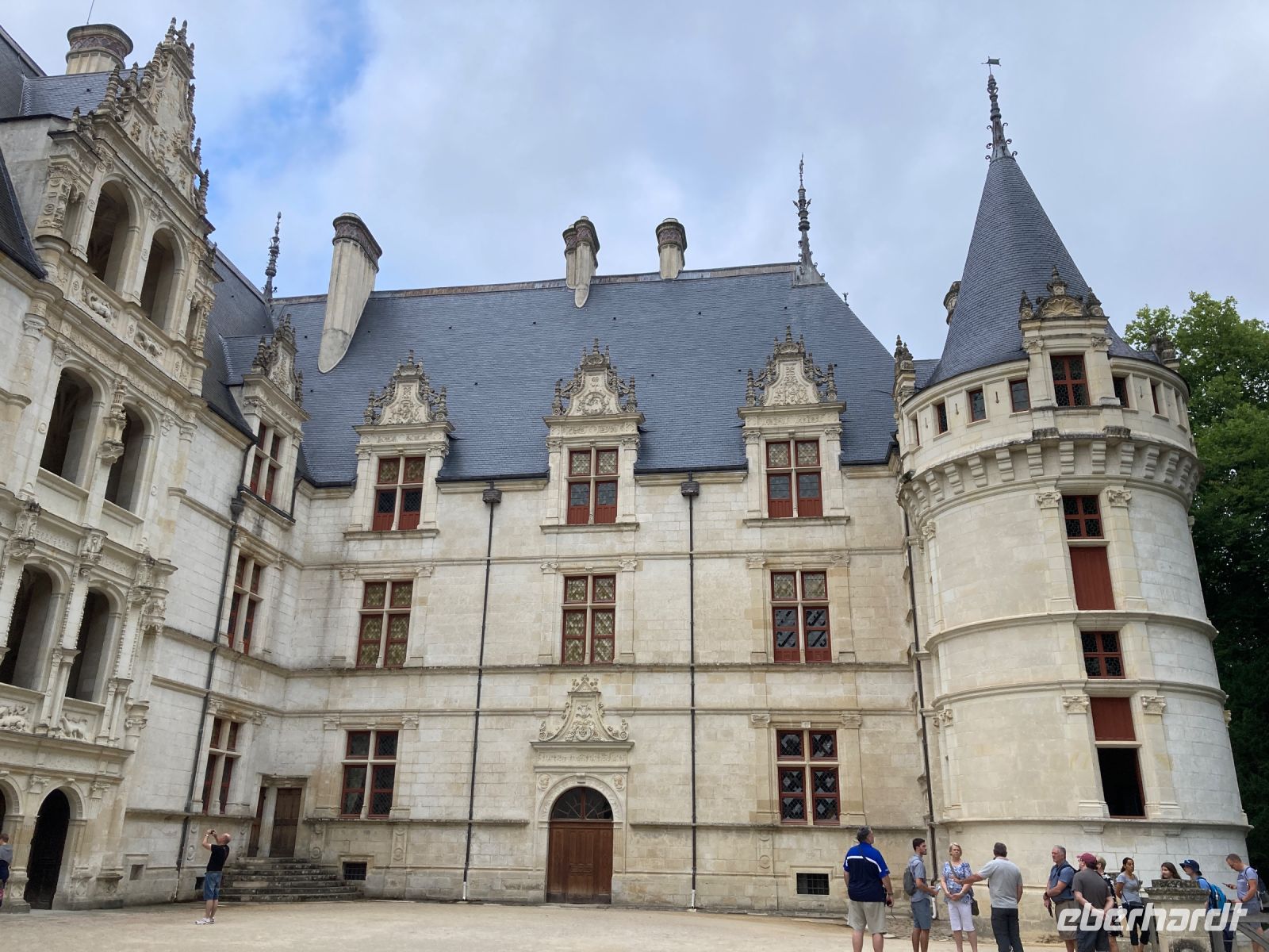 Chenonceau - das Damenschloss wie häufig zu lesen ist, ein Wasserschloss und neben Chambord das meistbesuchte Schloss des Loiretals. Dabei liegt es gar nicht an der Loire, sondern an dem Fluss Cher. Dieser gehört jedoch wie einige andere zum Flusssystem der Loire. Dass dieses Schloss so viele Besucher anzieht, kommt nicht von ungefähr, denn die Architektur und die Lage lassen es zum echten Blickfang werden, außen wie innen. Dazu kommt noch eine echte Liebesgeschichte und die Rivalität zweier starker Frauen und schon ist der Stoff für viele Geschichten und Anekdoten gefunden. Leider ist es hier aber mittlerweile wieder sehr voll, was vor allem die Innenbesichtigung nicht ganz einfach macht. Glücklicherweise sind wir kurz nach dem Öffnen der Pforten hier, weshalb es noch etwas entspannter zugeht. Bevor wir endgültig unseren Weg nach Nantes antreten, wollen wir uns noch stärken. Schließlich gehen wir langsam auf die Mittagszeit zu.