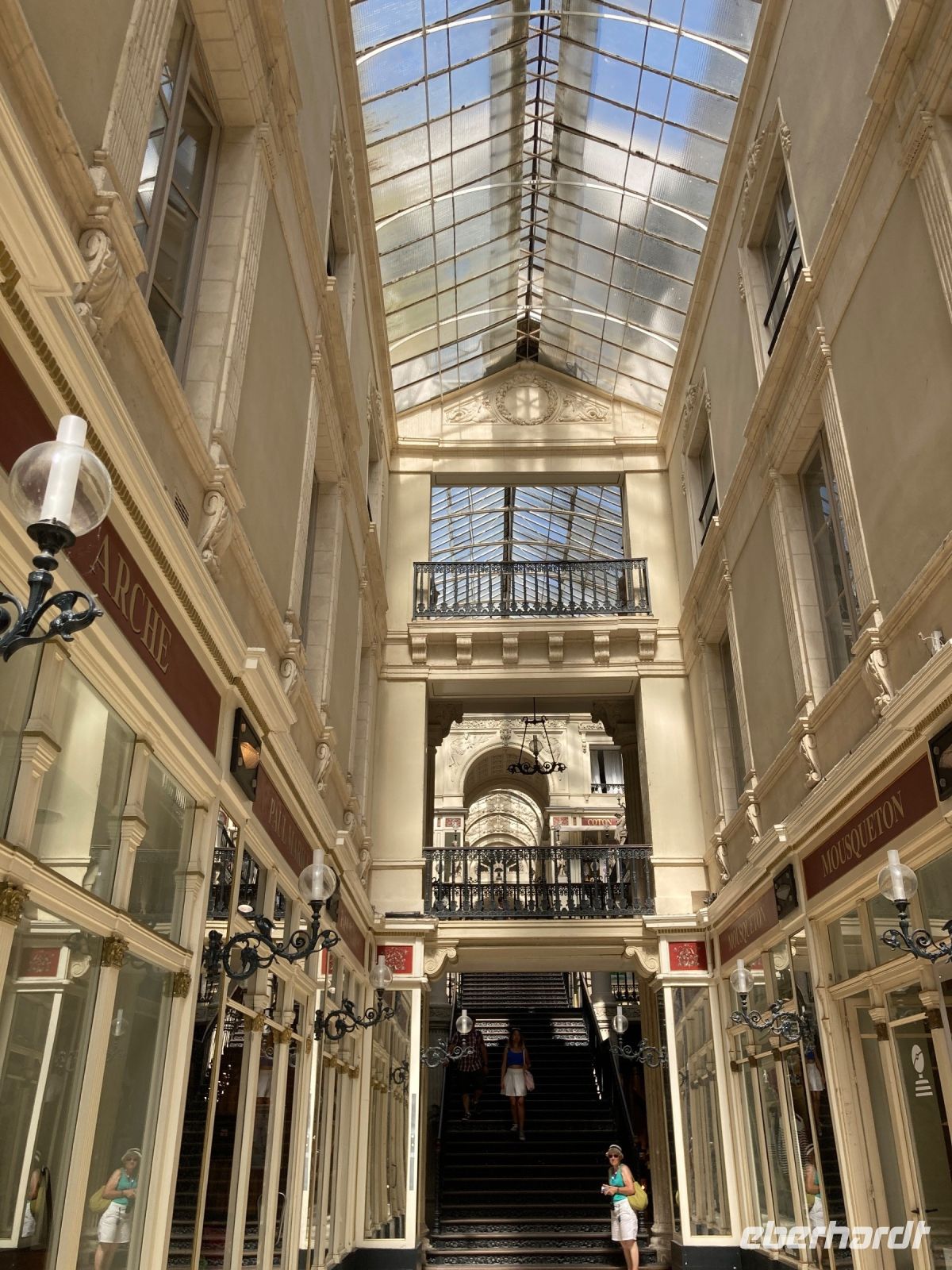 Wir widmen uns deshalb dem Schloss, welches lange Zeit Sitz der Herzöge der Bretagne war. Von außen gleicht es mehr einer Festung denn einem Schlösser. Im Innenhof werden dann aber die unterschiedlichen Bauphasen und damit auch die Baustile deutlich. Und aus dieser Perspektive sieht es wie ein bewohnbares Schloss aus. Für einige Gäste endet das Kennenlernen von Nantes hier. Sie werden mit dem Bus zum Schiff fahren. Eine Gruppe möchte noch ein wenig mehr von der Stadt sehen und dies geht am besten zu Fuß. Über die Place Royale gelangen wir zur Passage Pommeraye. Diese Einkaufspassage sucht in Frankreich ihresgleichen, weshalb sie auch Ende 1976 als historisches Monument klassifiziert wurde. Einkaufspassage gibt es in Frankreich einige, doch diese geht über mehrere Etage und nutzt so das unterschiedliche Niveau der Stadt aus.