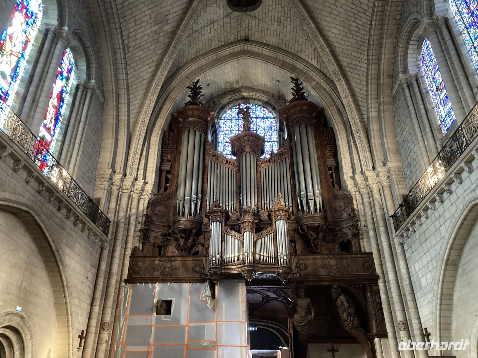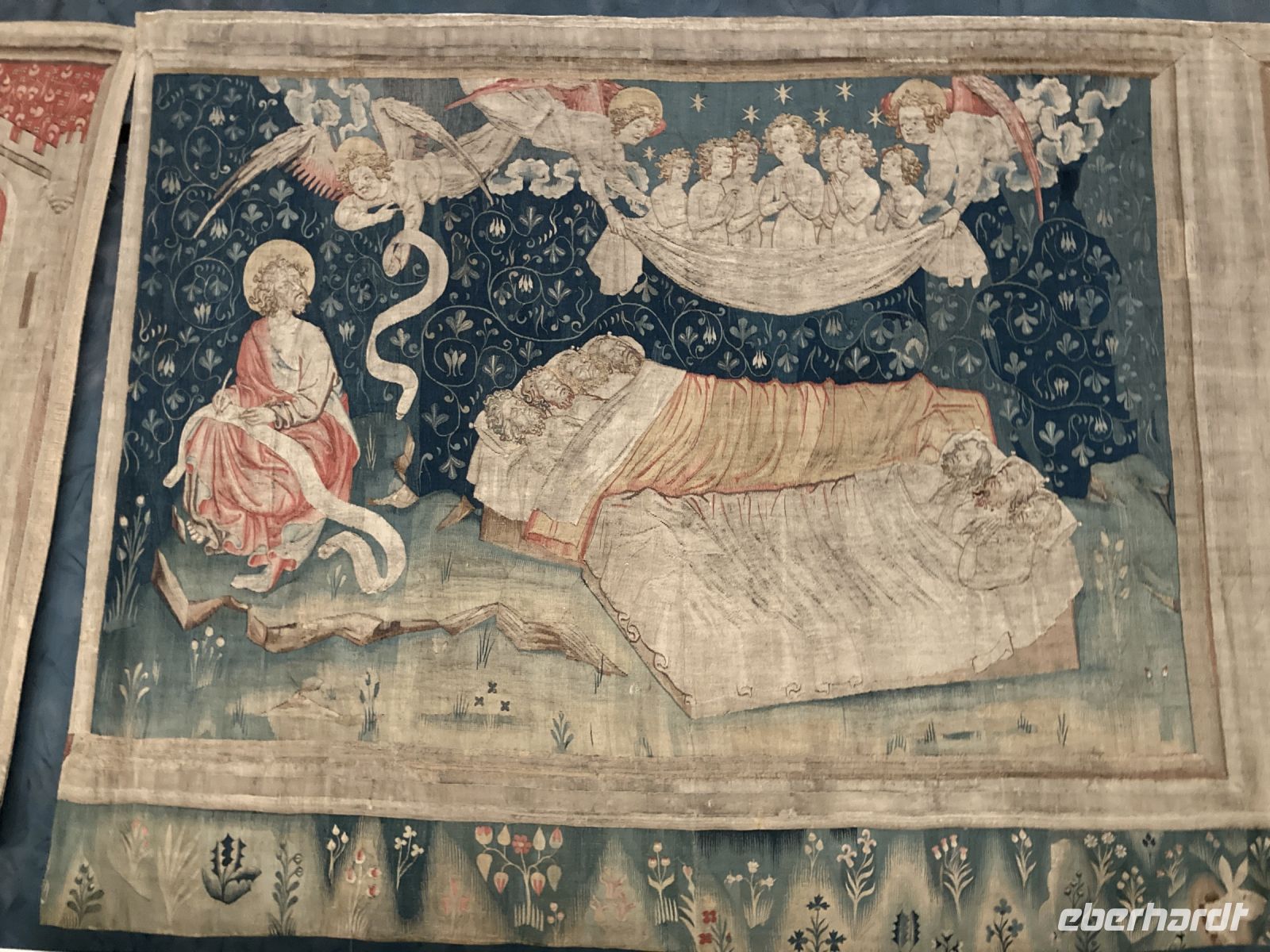 In der Nacht haben wir in Ancenis angelegt. Und nun um 8 Uhr heißt es erneut Leinen los, denn wir werden noch weiter flussaufwärts fahren. In Chalonnes-sur-Loire haben wir unseren Endpunkt erreicht. Von hier aus starten wir nach Angers. Im Ranking der Franzosen gehört Angers nicht nur zu den Städten mit der höchsten Lebensqualität, sie weist darüber ein mächtiges Schloss und einen Kulturschatz ersten Ranges auf: den Wandteppich der Apokalypse. Dass dieser Zyklus gerade im Schloss von Angers aufbewahrt wird, ist kein Zufall. Das Schloss von Angers war der Sitz der Herzöge von Anjou. Diese waren reich und mächtig. Der König Frankreichs Charles V. lieh in den 1370er Jahren ein Manuskript, nach dem Louis I. d’Anjou die Teppiche in Auftrag gab. Eine wechselvolle Geschichte könnten die Teppiche erzählen, denn sie wurden wahrlich nicht immer ihrem Rang angemessen aufbewahrt und gepflegt. Aus diesem Grund sind leider nicht mehr alle Teile vorhanden. Eindrücklich sind die verbliebenen 103 Meter Länge und 4,50 Meter Höhe allemal. Uns reicht noch die Zeit für einen Rundgang durch die Altstadt und einen Café, bevor wir unseren Rückweg zum Schiff antreten, wo heute des Galadiner auf uns wartet.