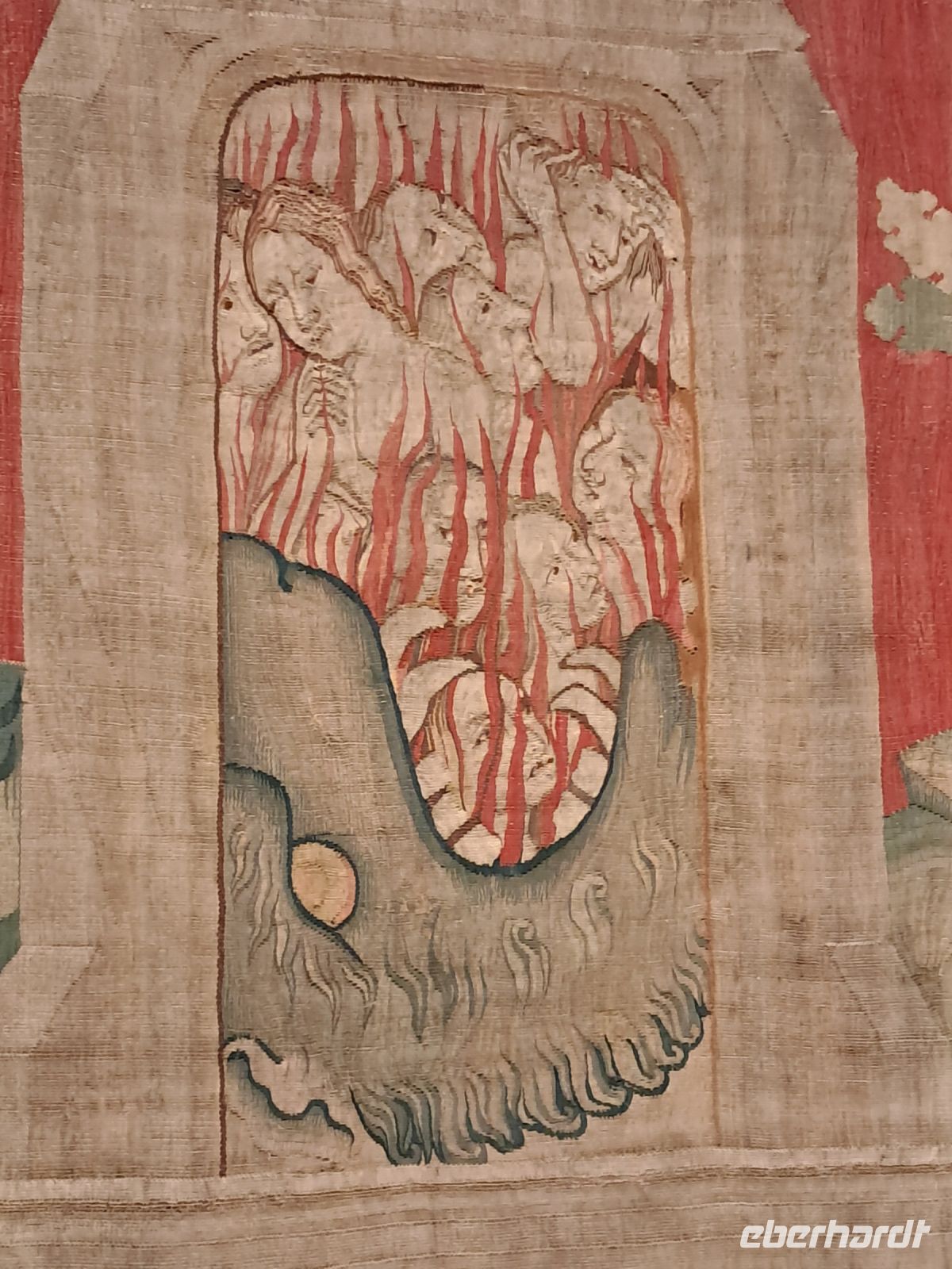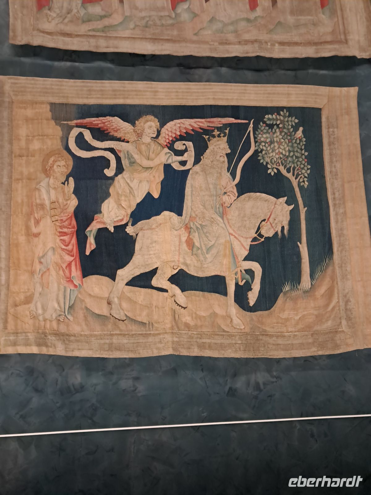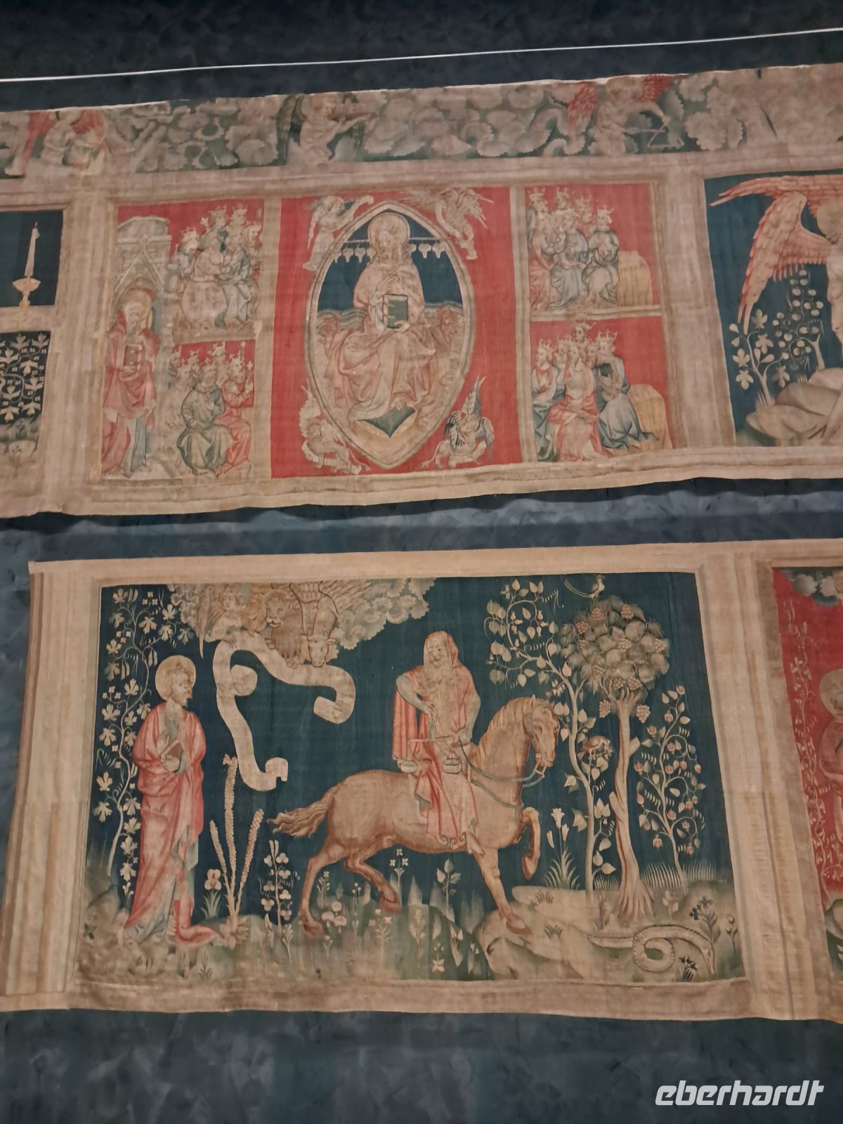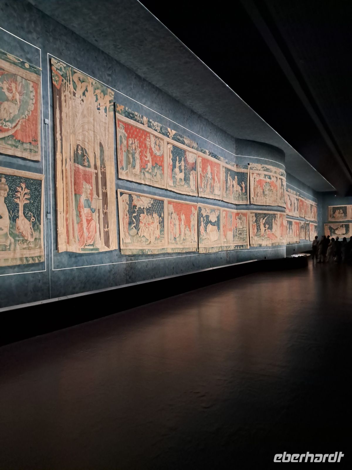 Die Apokalypse ist heute auf dem Programm, keine Sorge, das ist der Name eines Kunstwerks, das im Zentrum unseres heutigen Besuchs in Angers steht. Es handelt sich dabei um den größten Wandteppich, den Europa je gesehen hat. Eigens zu diesem Zweck wurde ein Gebäude errichtet. Der Teppich stellt die Visionen aus der Offenbarung des Johannes dar und hat eine Länge von 103 Metern und eine Höhe von 4,3 Metern. Ursprünglich war das Werk noch größer: jedes seiner sechs Elemente war 6 Meter hoch und über 23 Meter lang, was eine Gesamtlänge von über 140 Metern ergab.