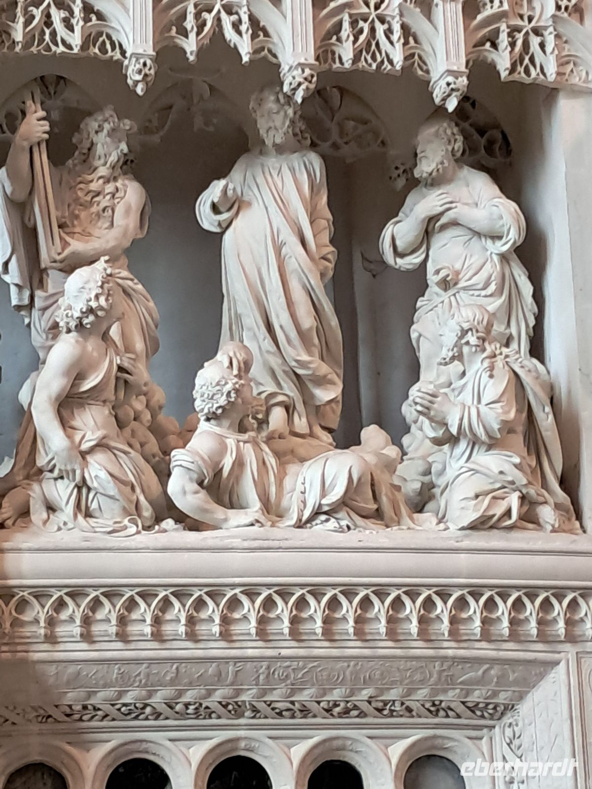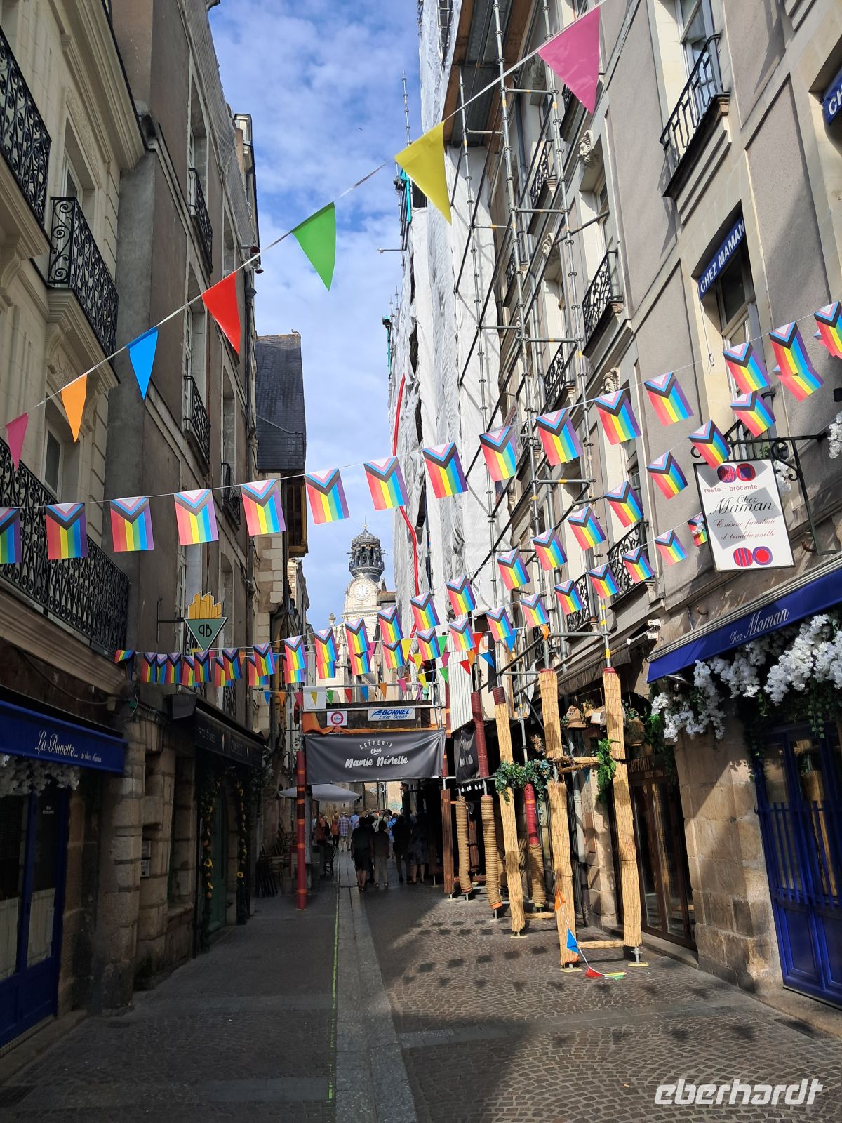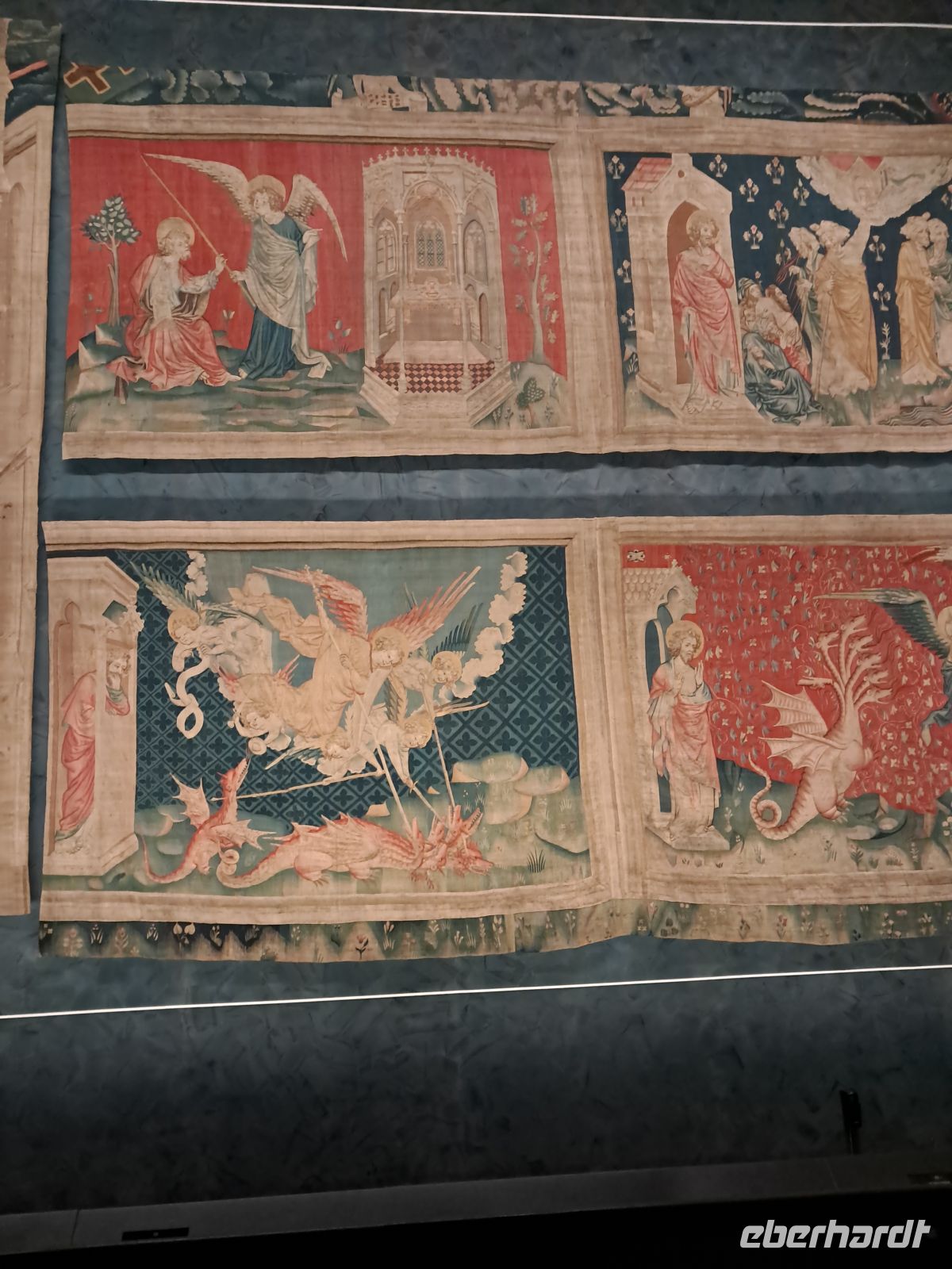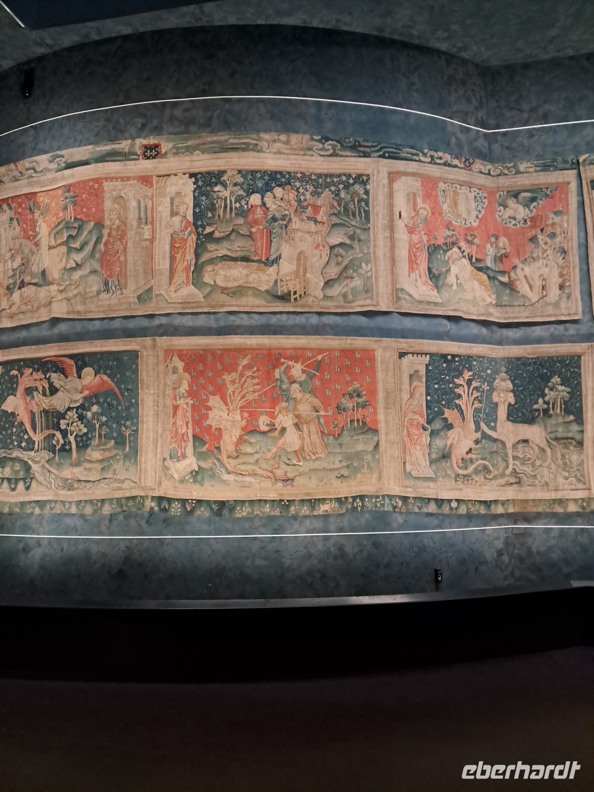 Die Apokalypse stand am Nachmittag an. Keine Sorge, die Prinzessin ging nicht unter, aber die Offenbarung des Johannes auf über 100 Teppichen im Schloss von Angers musste besichtigt werden. Die einzigartige Werk aus dem 14. Jahrhundert steht natürlich unter dem Schutz des Unesco-Weltkkulturerbes und glücklicherweise hatten wir einen fachkundigen Mann aus Hessen engagiert, der alles dazu wusste. Zum Abschluss führte er uns noch zu einer besonders prominenten Person in Angers, die nicht nur mit nacktem Hintern von sich zu reden macht. Alles Weitere behalten wir für uns.