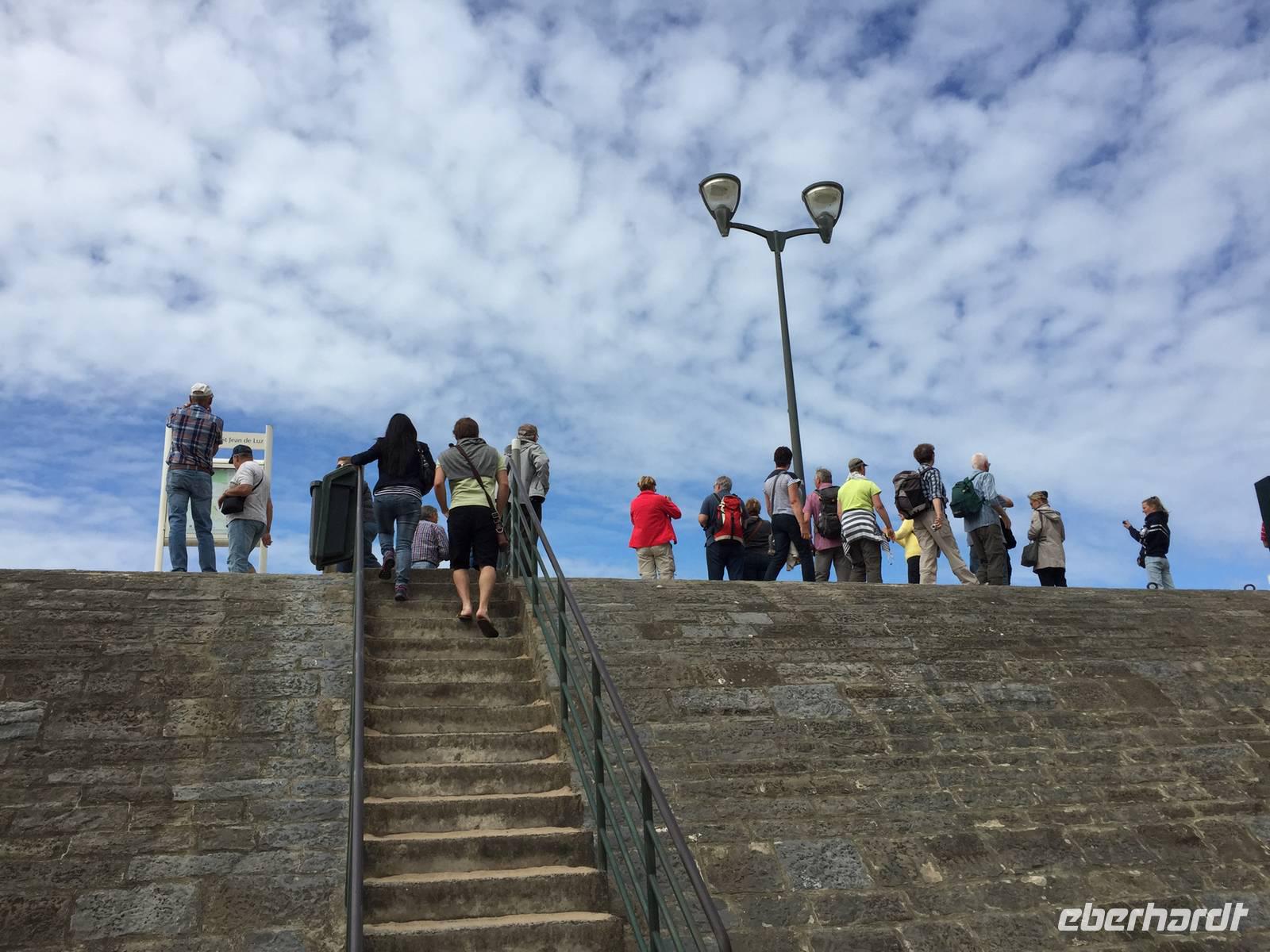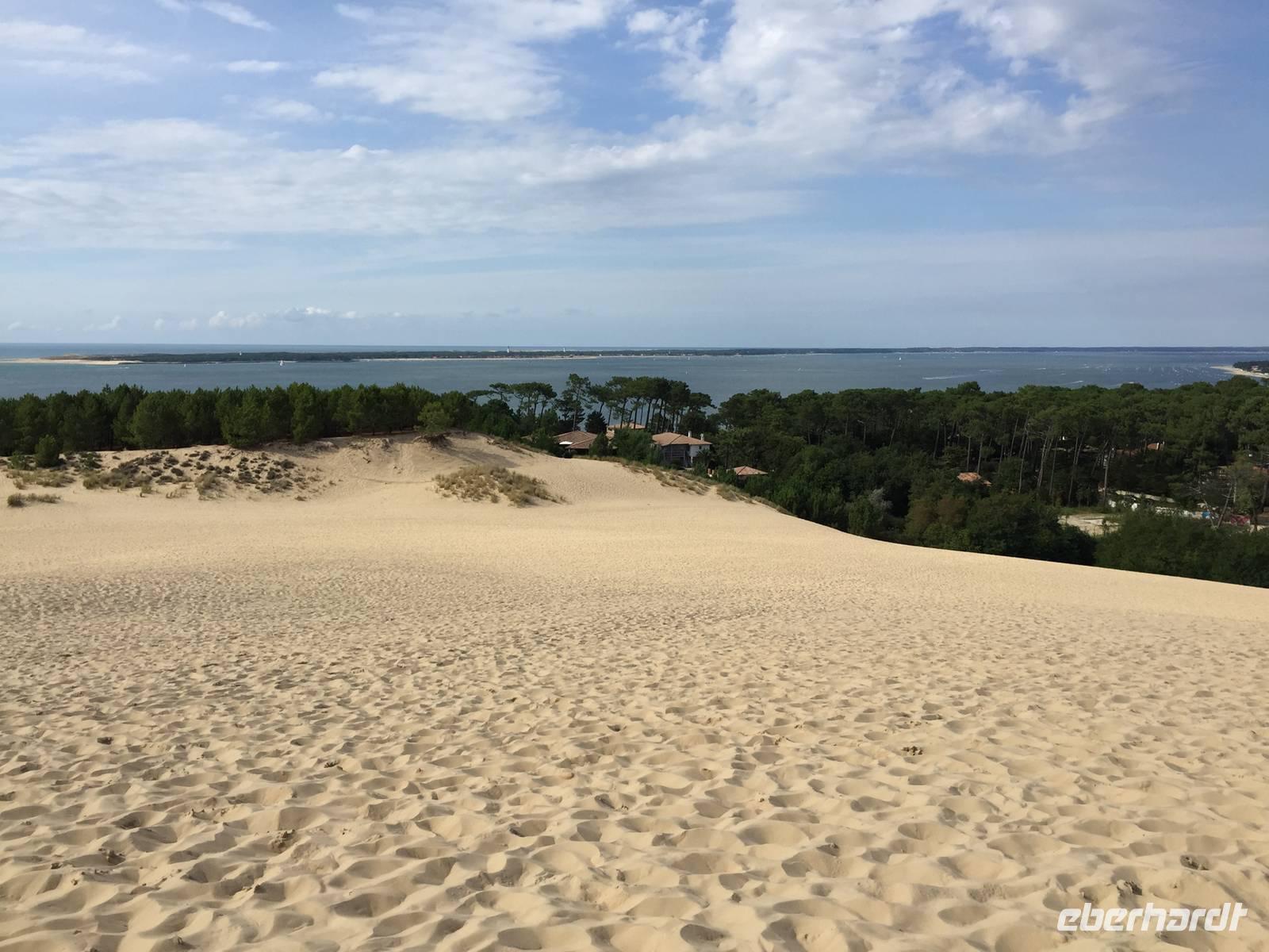 Die Düne von Pilat im Becken von Arcachon ist die höchste Düne Europas: Ein gigantischer, etwa drei Kilometer langer, fünfhundert Meter breiter und über hundert Meter hoher Sandberg, entstanden durch das Zusammenspiel der Winde und der Meeresströmungen motiviert uns zum nicht ganz mühelosen Aufstieg. Belohnt werden wir durch einen imposanten Ausblick über die Bucht bis zum unendlich scheinenden Strand der Landes.