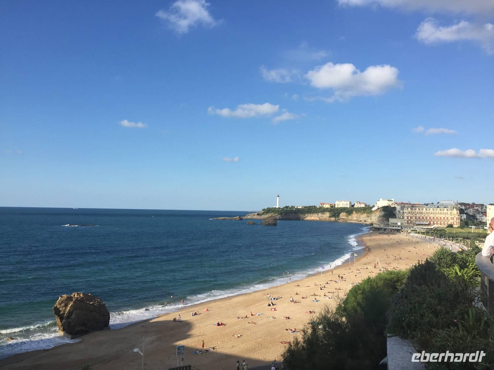 Den heutigen busfreien Tag nutzten wir zum Besuch des benachbarten Biarritz. Dank des gut ausgebauten Linienbusnetzes erreichen wir schnell das mondäne Seebad am Golf von Biskaya. Die herrliche Lage an der zerklüfteten Felsküste, die langen Sandstrände und das wintermilde Seeklima lockten schon Kaiser Napoléon III. und seine Frau Eugénie in das ehemalige Zentrum des Walfangs, welches zu einem der berühmtesten Seebäder wurde. Zahlreiche Villen und Hotels des 19. Jahrhunderts und der Belle Epoche sind Zeugnis der Zeit, als Biarritz zum Magneten für die gesamte europäische Aristokratie und im Anschluss zum Tummelplatz für die Reichen wurde. Bismarck wäre hier fast ertrunken, denn Wellen und Strömung werden hier oft unterschätzt. Noch heute ist das Seebad äußerst populär und gehört zu den meistbesuchten Orten der südfranzösischen Atlantikküste - nicht zuletzt, weil sich der Ort seit den fünfziger Jahren auch zur Hochburg für Wellenreiter entwickelt hat. Am idyllischen Port des Pêcheurs (Fischereihafen) schlemmen wir Muscheln oder Langusten, unternehmen einen Spaziergang zum Rocher de la Vierge mit herrlichem Blick auf die gesamte baskische Küste oder verschaffen uns im Musée de la Mer einen interessanten Einblick in die Fischwelt und die Geschichte des Fischfangs der Biskaya.Bayonne, die Hauptstadt des französischen Baskenlandes liegt am Zusammenfluss von Adour und Nive, welche die Stadt in drei Teile gliedern. Architektonisches Herz der Altstadt ist die Kathedrale Sainte-Marie, der erste Sakralbau südlich der Loire, der dem Vorbild der nordfranzösischen Gotik folgt. Die malerischen Gassen rings um das Gotteshaus sind vor allem von Fassaden des 18. Jahrhunderts gesäumt, aber auch einige mittelalterliche Fachwerkbauten auf massivem Steinsockel prägen das Stadtbild.