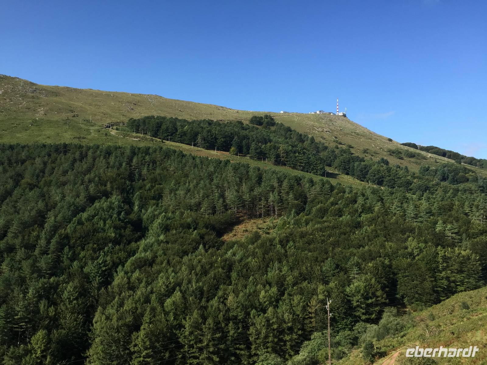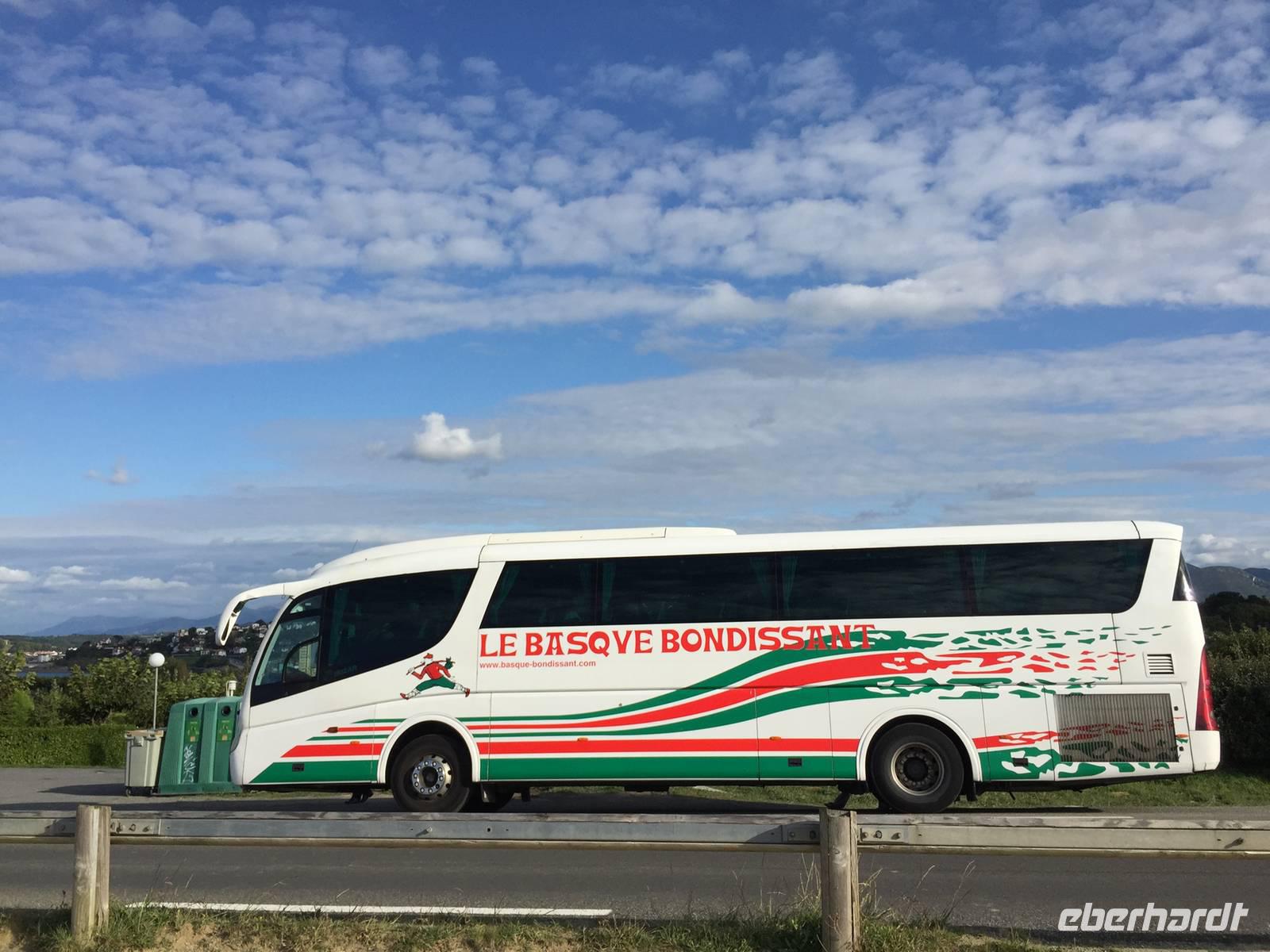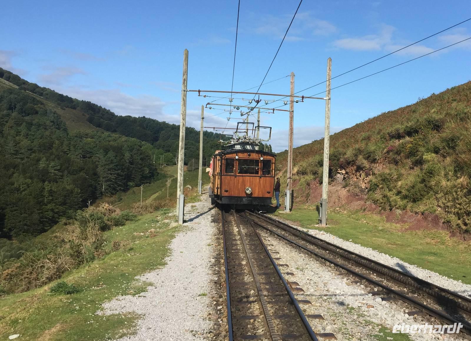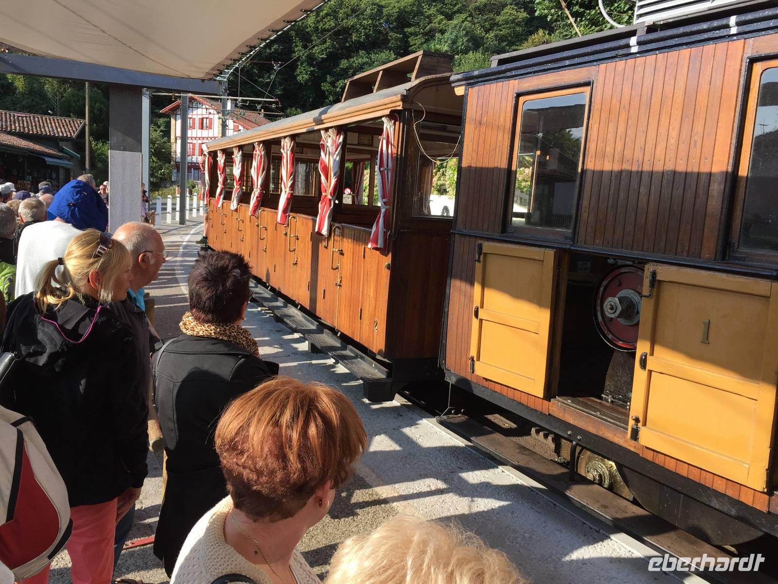 Die Hinweisschilder sind gespickt mit Zungenbrechern und selbst die Schrift weist einige eigenwillige Varianten des lateinischen Alphabets auf: Die baskische Sprache müssen wir zum Glück nicht beherrschen, wir haben eine örtliche Reiseleiterin und einen lokalen Busfahrer, da unser Fahrer Peter heute einen Ruhetag einlegen muss und darf. Nach einer kurzen Anfahrt gelangen wir mit der nostalgischen Zahnradbahn von 1924 auf den 900 Meter hohen Pyrenäengipfel La Rhune, welcher das Wahrzeichen des französischen Teils des Baskenlandes ist. Der Name "Iarrun" bedeutet "gutes Weideland" und auf den sogenannten „Touyas", der Heidelandschaft mit Steckginster und Farn, welche wir bei der Zugfahrt passieren, grasen die Pottok-Ponys. Ein herrlicher Rundblick über das Meer, die baskischen Pyrenäen und im Süden in das Tal der Bidassoa erwartet uns auf dem Gipfel .