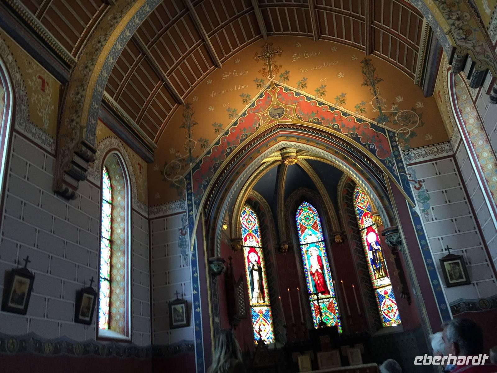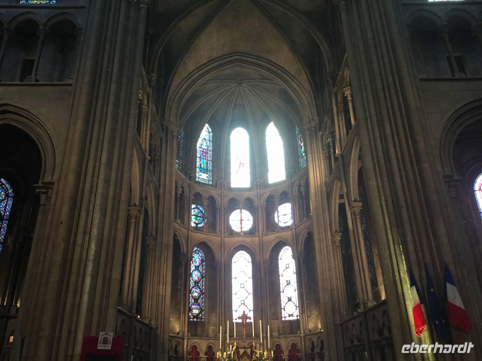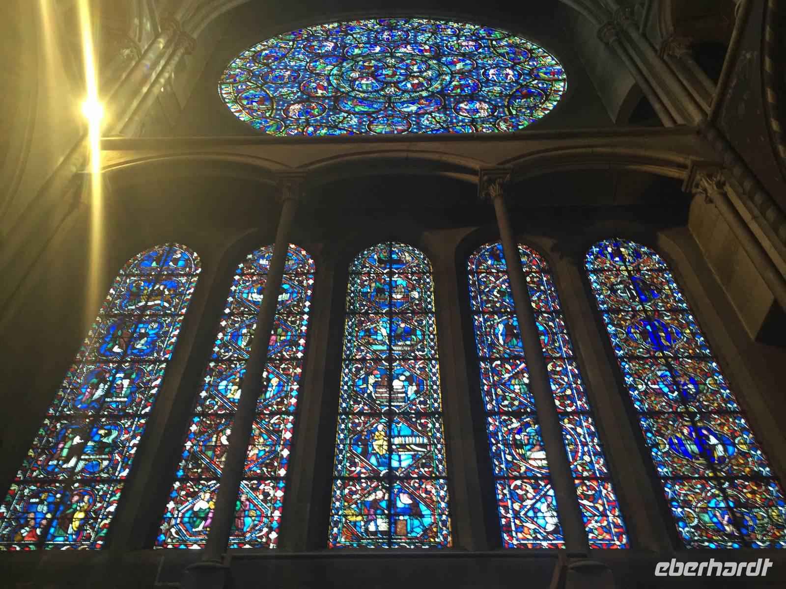 Wir bewundern die Innenwand der Westfassade, die einmalig in der Geschichte der gotischen Architektur ist. Auch die berühmten Fenster von Marc Chagall in der Scheitelkapelle des Chores sorgen mittlerweile für neuzeitliche Pilgerströme in dieses Gotteshaus.