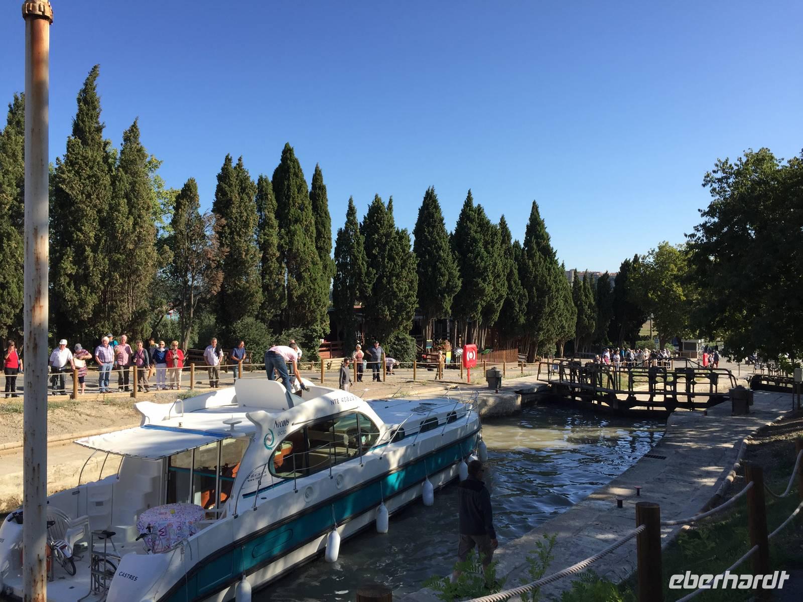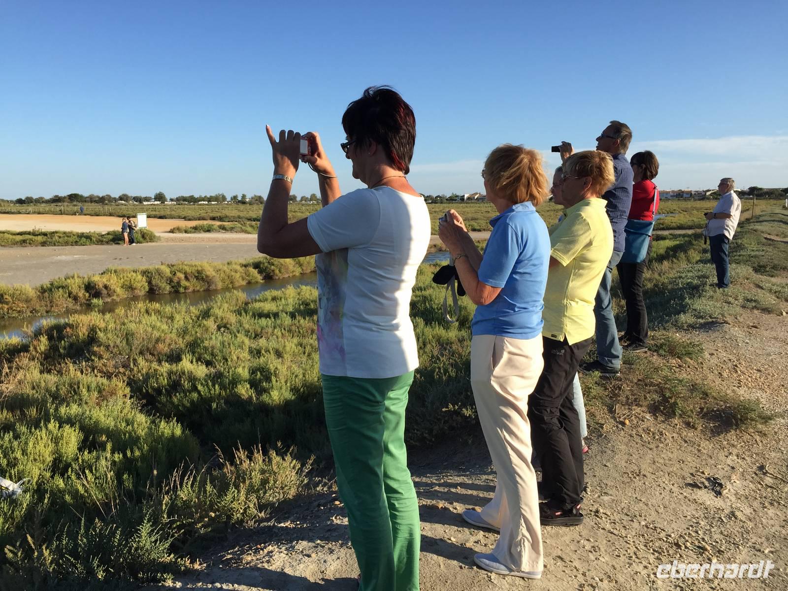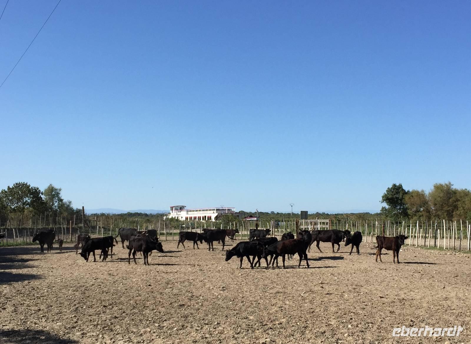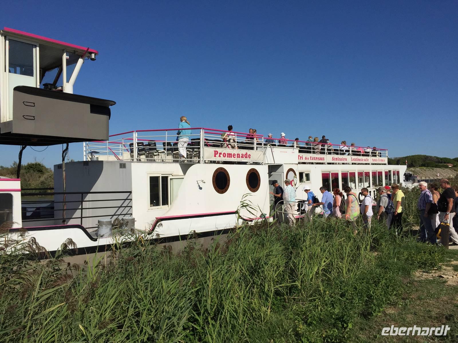 Nachdem wir in der von Ludwig IX. erbauten Festungsstadt Aigues Mortes unsere Mittagspause genossen haben, finden wir uns auf einem Ausflugsboot ein, welches uns über den Canal zu einer Stieraufzuchtsfarm, einer Manarde, bringt. Wir sehen eine Gardian-Vorführung - so heißen die Männer mit breitkrempigen, schwarzen Hüten, die vom Rücken ihrer Pferde aus die Stierherden zusammenhalten.? Beim Stierkampf der Camargue wird der Stier nicht getötet! Vielmehr geht es darum, ihm die Trophäen von seinen Hörnern zu reißen, wofür der Torero mit einem speziellen Kamm ausgestattet ist.