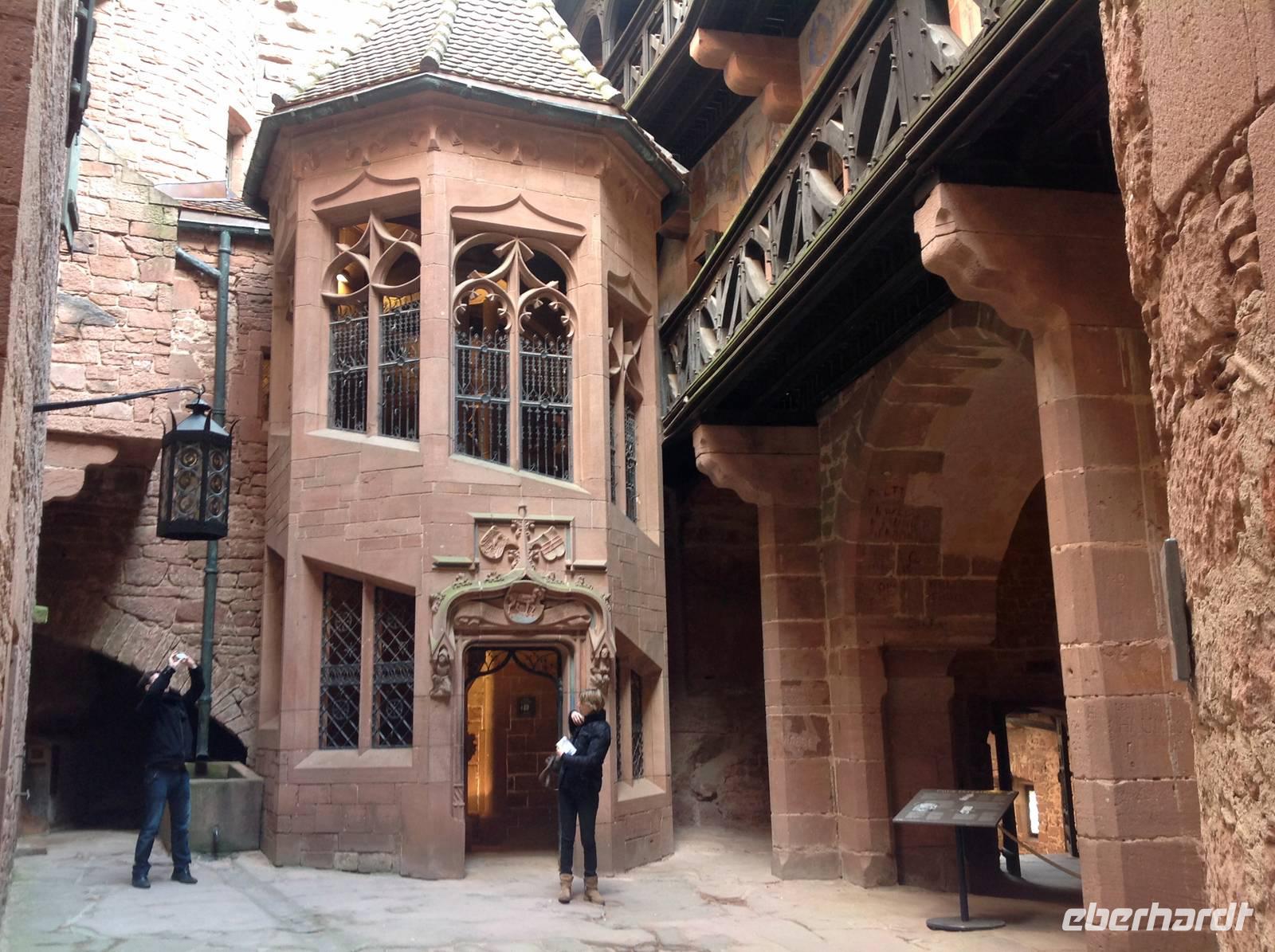 Vorbei an den Weinbergen des Elsass und durch malerische Städtchen mit farbenfrohen Fachwerkhäusern gelangen wir zur größten Burg des Elsass, der Hoch-Koenigsburg. Sie war schon fast verfallen, als Kaiser Wilhelm II die Ruine von Schlettstadt als Geschenk erhielt. Der letzte Deutsche Kaiser ließ den Komplex wieder aufbauen, wobei er dem Berliner Architekten Bodo Ebhardt die Federführung übergab. Den Apéritif müssen wir leider unter Regenschirmen einnehmen, was jedoch niemanden stört, denn es sind die ersten und einzigen Tropfen auf der gesamten Reise.