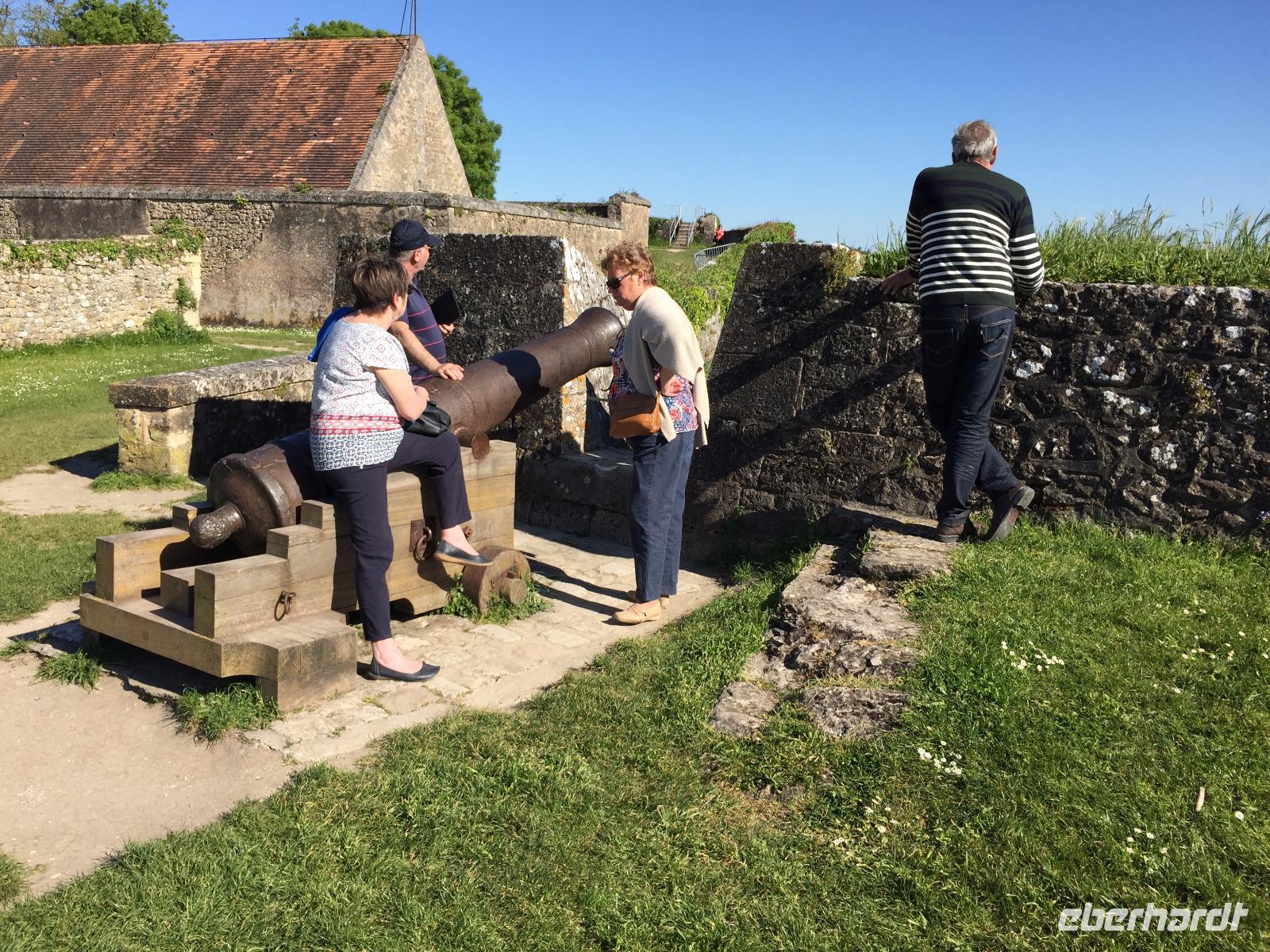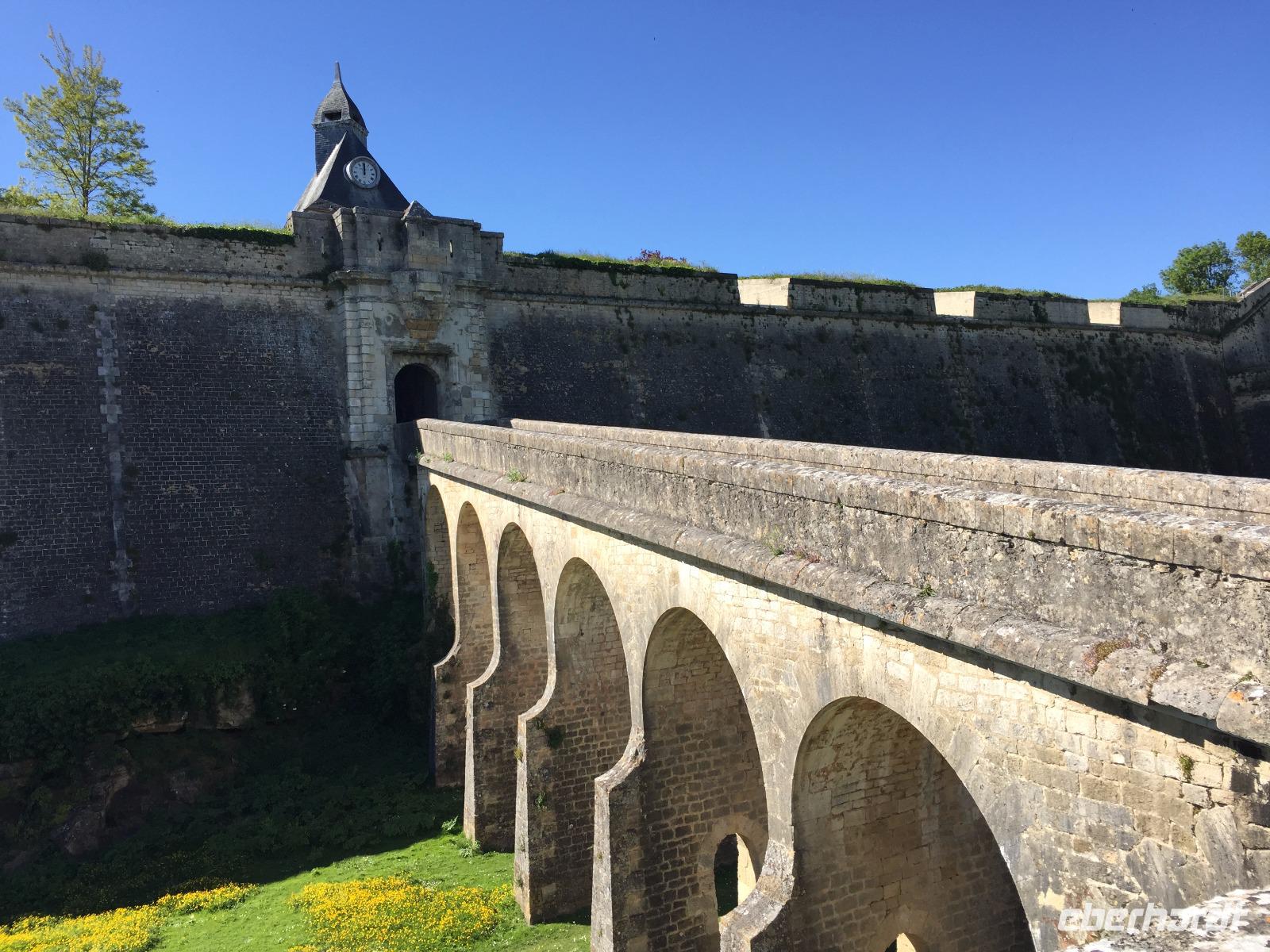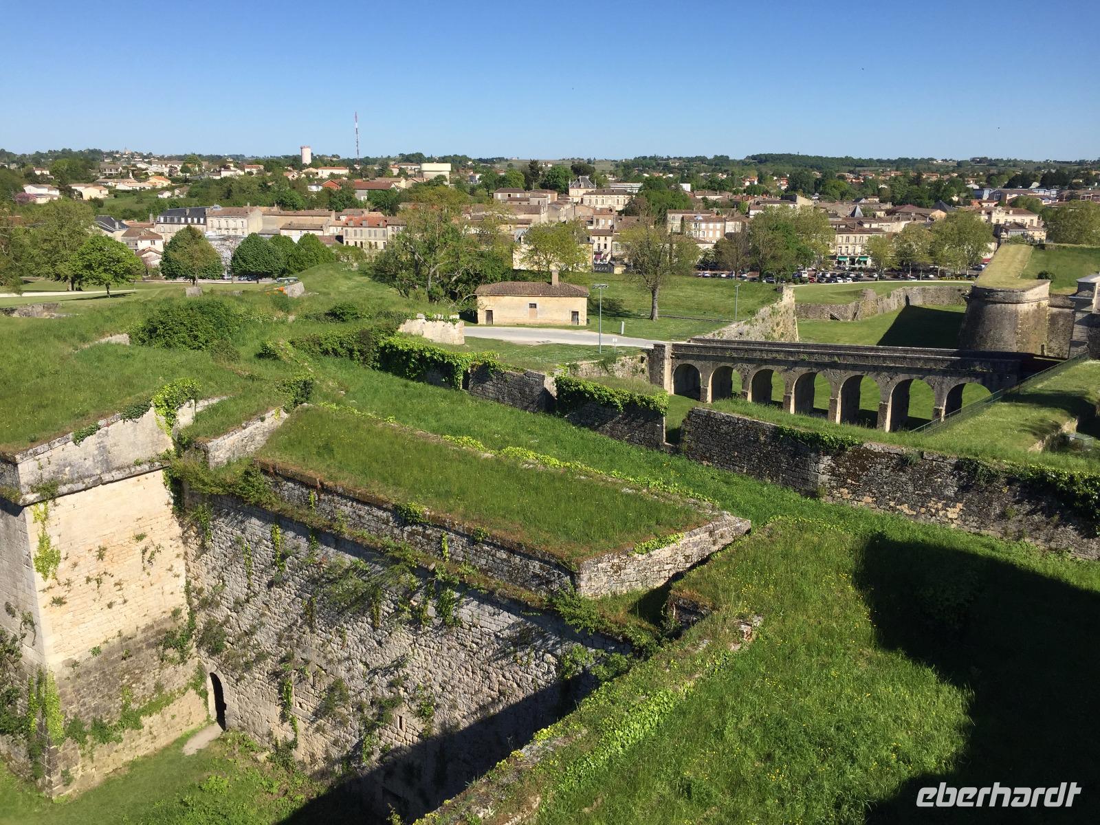 Am späten Nachmittag erreichen wir die beeindruckende Festung Blaye, welche die Gironde einst beschützte und noch immer imposant überragt. Sie bildet ein ausgedehntes, von Kurtinen umgebenes Befestigungssystem, dessen Planung auf den bekanntesten Festungsbaumeister Frankreichs, auf Sébastien Le Prestre Marquis de Vauban, zurückgeht. Mit Blaye und zwei weiteren gegenüber gelegenen Forts war die Gironde-Mündung bestens abgesichert.