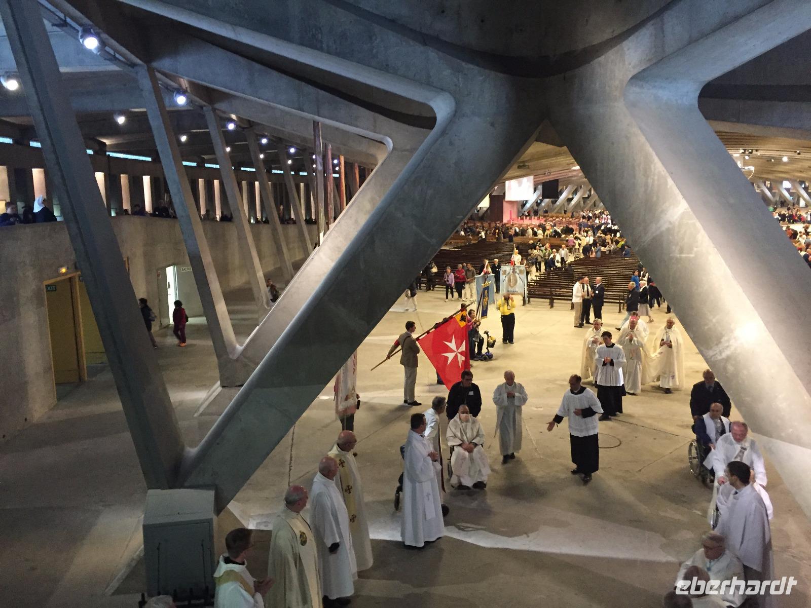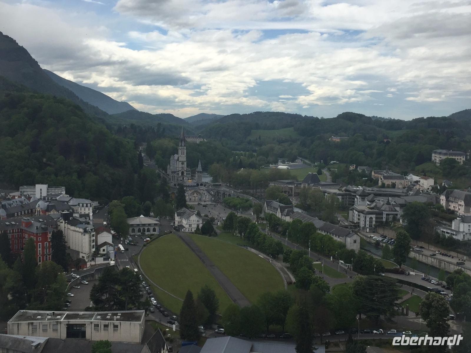 Am frühen Nachmittag erreichen wir Lourdes, den berühmten katholischen Wallfahrtsort in den Ausläufern der Pyrenäen. Vom Hotel Stella Matutina gelangen wir in wenigen Minuten in den Wallfahrtsbezirk. Eine freiwillige Helferin führt uns zu den Lebensstationen des Hirtenmädchens Bernadette Soubirous (1844 - 1879) und zum Wallfahrtsbezirk mit der im neobyzantinischen Stil erbauten Rosenkranzbasilika. Einige besuchen die Prozession der Pilger und den anschließenden Gottesdienst in der riesigen unterirdischen Kirche. Das ovale Kirchenschiff von zweihundert Metern Länge und achtzig Metern Breite ist eine Stahlbetonkonstruktion aus dem Jahr 1958 und kann bis zu 20 000 Pilger aufnehmen.?Am Abend findet die tägliche Lichterprozession von der Grotte zur Esplanade du Rosaire mit hunderten -manchmal tausenden- schwerkranker Menschen voller Hoffnung auf Besserung ihrer Leiden statt.