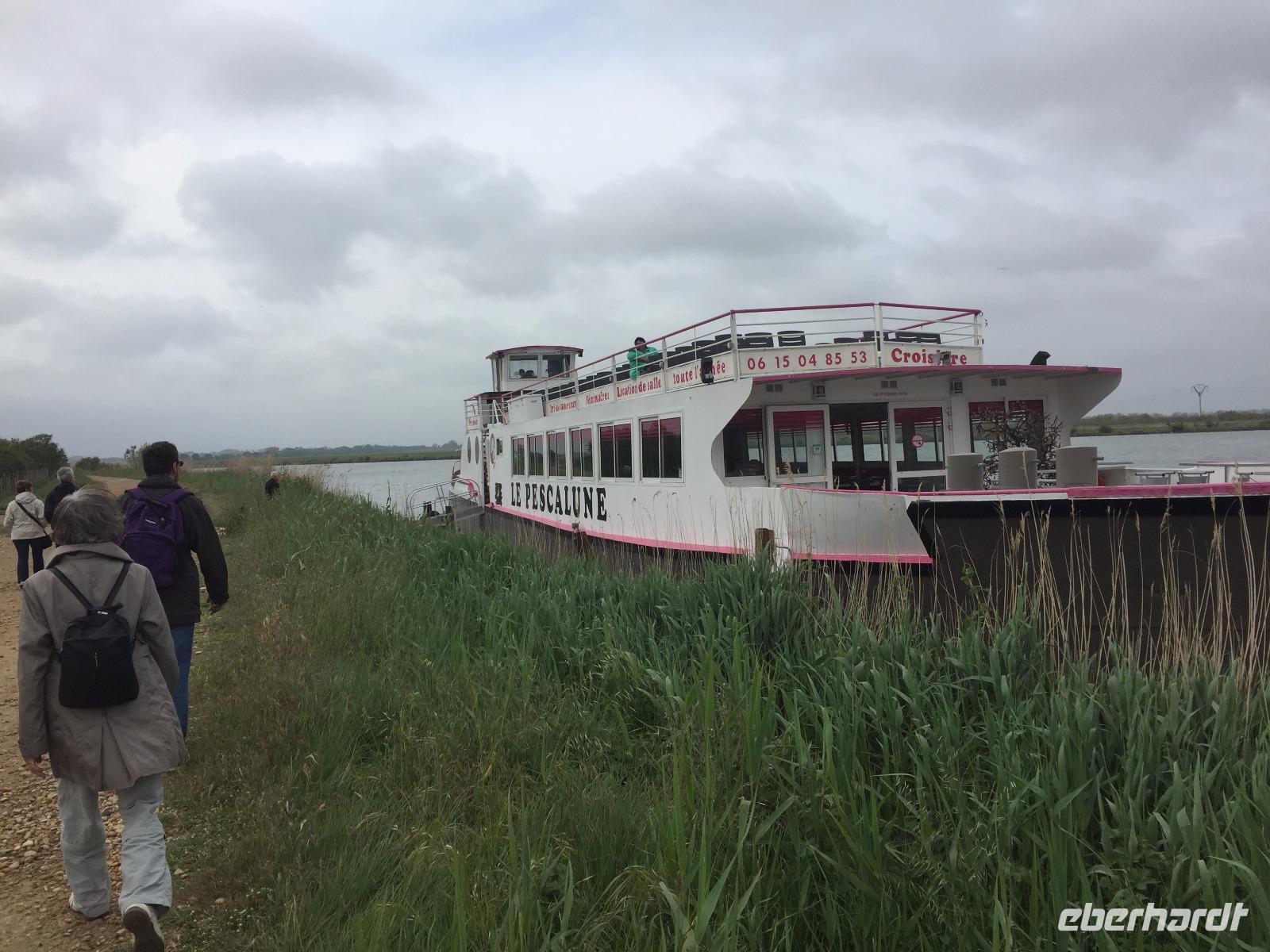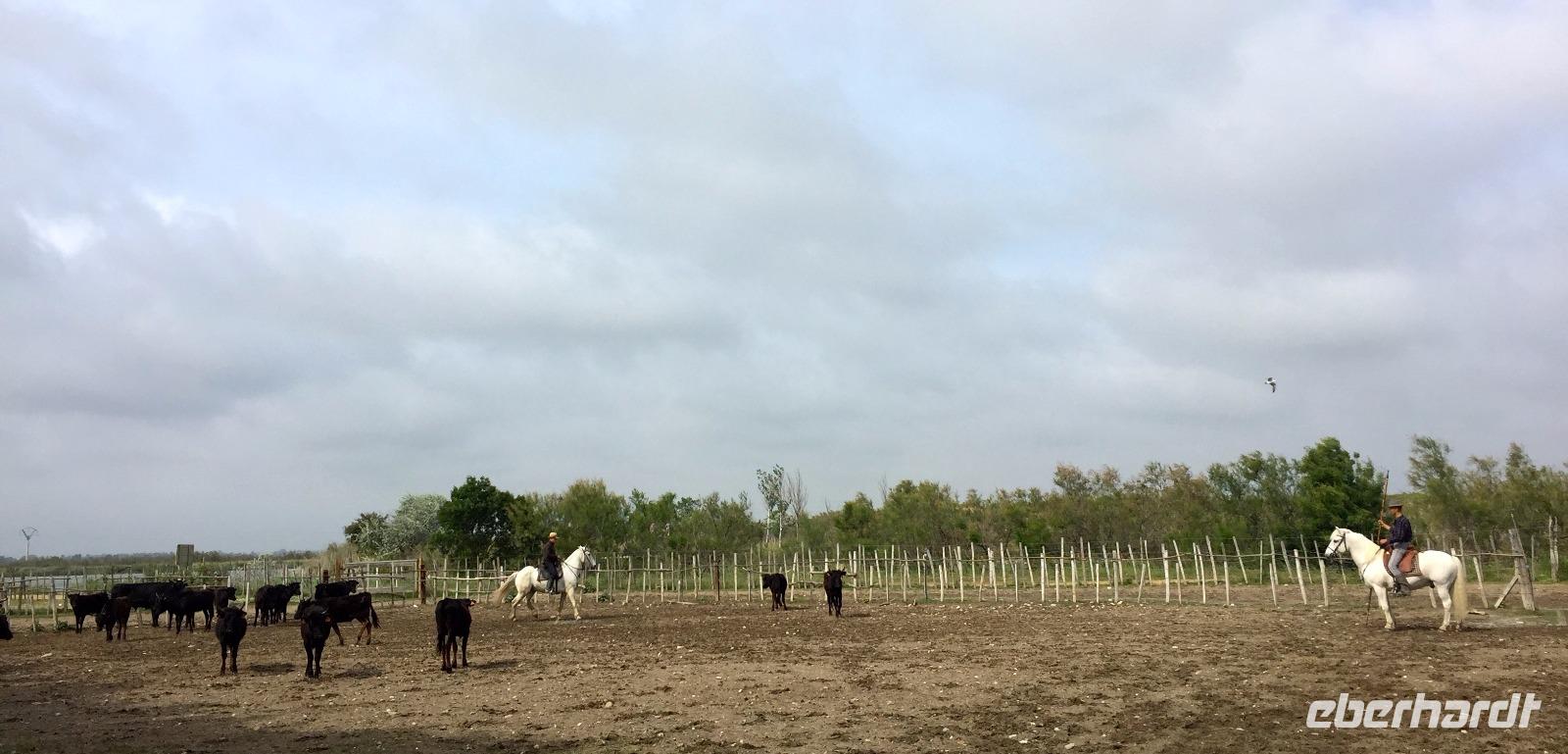 Am frühen Nachmittag finden wir uns auf einem Ausflugsboot ein, welches uns über den Canal du Rhône à Sète zu einer Stieraufzuchtsfarm, einer Manarde, bringt. Wir sehen eine Gardian-Vorführung - so heißen die Männer mit breitkrempigen, schwarzen Hüten, die vom Rücken ihrer Pferde aus die Stierherden zusammenhalten.? Beim Stierkampf der Camargue wird der Stier nicht getötet! Vielmehr geht es darum, ihm die Trophäen von seinen Hörnern zu reißen, wofür der Torero mit einem speziellen Kamm ausgestattet ist.
