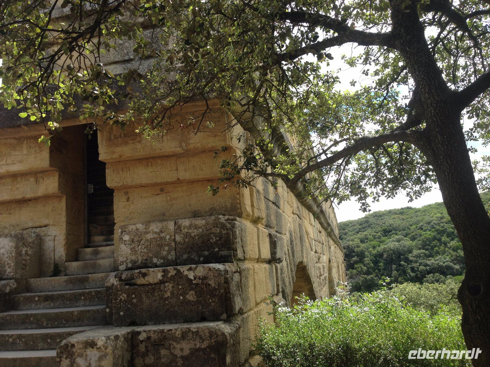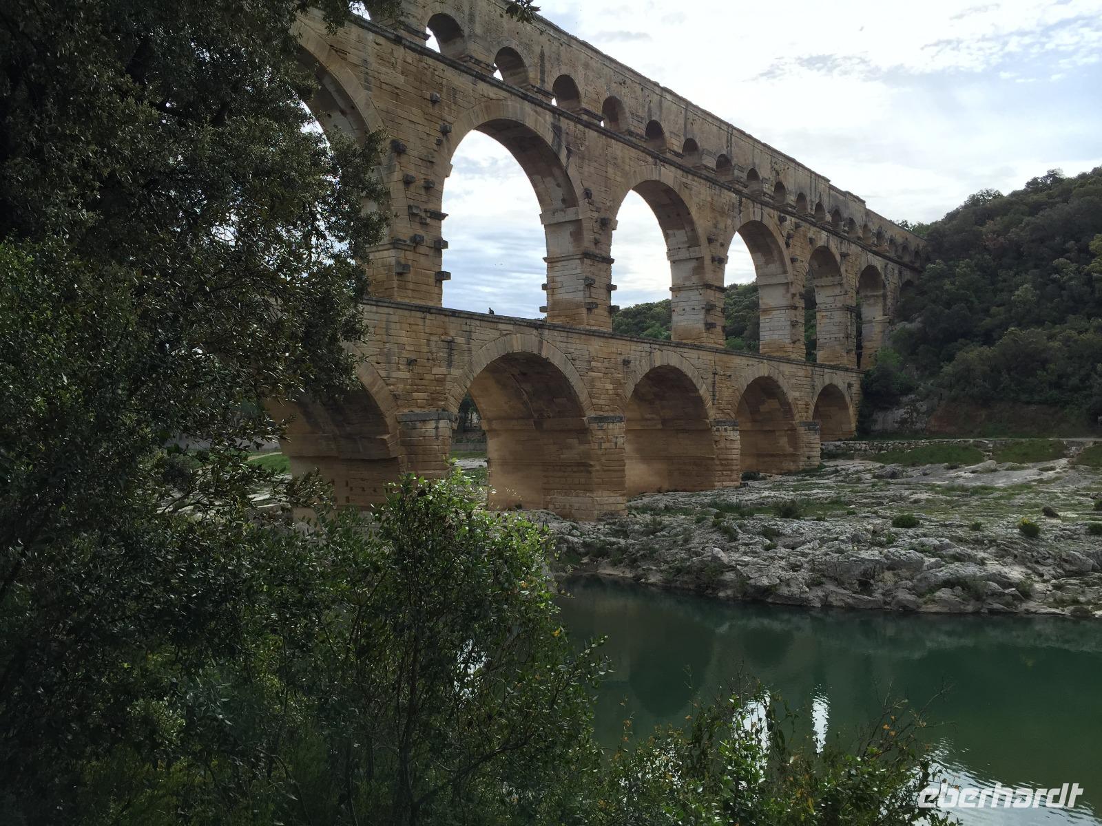 Wir setzen unsere Fahrt fort und erreichen etwa 25 Kilometer nordöstlich von Nîmes den Pont du Gard - den beeindruckenden römischen Aquädukt mit fünfzig Metern Höhe, welcher um die Zeitenwende aus massivem Felsgestein ohne Mörtel errichtet wurde und bis heute im Original erhalten ist. Er war Teil einer etwa fünfzig Kilometer langen Wasserleitung, die mit einem Gefälle von nur 0,03 Grad Wasser nach Nîmes transportierte.