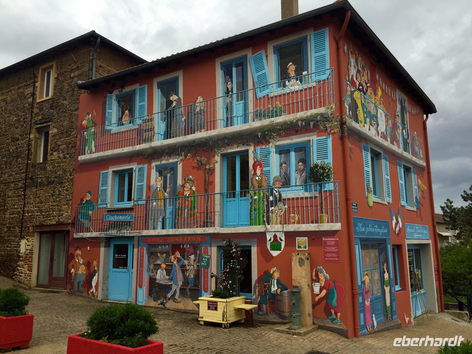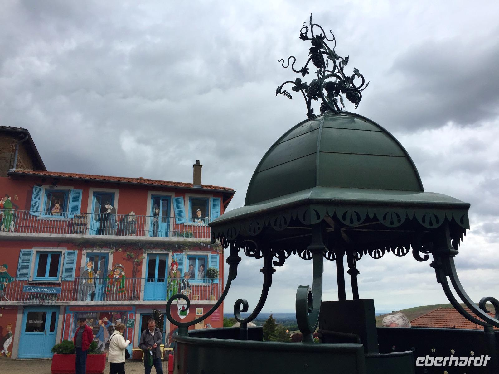 Nach dem Mittagessen in einem der gemütlichen und für ihre Qualität bekannten Bistros, die in Lyon "Bouchons" genannt werden, starten wir eine Rundfahrt durch das berühmte Weinanbaugebiet des Beaujolais. Wir besichtigen den kleinen Ort Oingt, von dessen Kirchplatz wir einen wunderschönen Blick auf die Hügellandschaft mit Weinbergen und Feldern haben. An besonders exponierter Stelle steht die Wallfahrtskapelle der Winzer. Durch das waldreiche Hinterland erreichen wir in der schönen Nachmittagssonne Vaux en Beaujolais. Dieses Winzerdorf hat Gabriel Chevallier zu seinem unvergesslichen Roman Clochemerle inspiriert.?Im Schatten einer Pergola mit Blick über die Hügel und auf das bekannteste "Bauwerk" von Clochmerle probieren wir den gleichnamigen Wein, mit einer "Rosette de Lyon", der bekannten Lyoner Salami, welche aus Schweineschinken hergestellt wird.