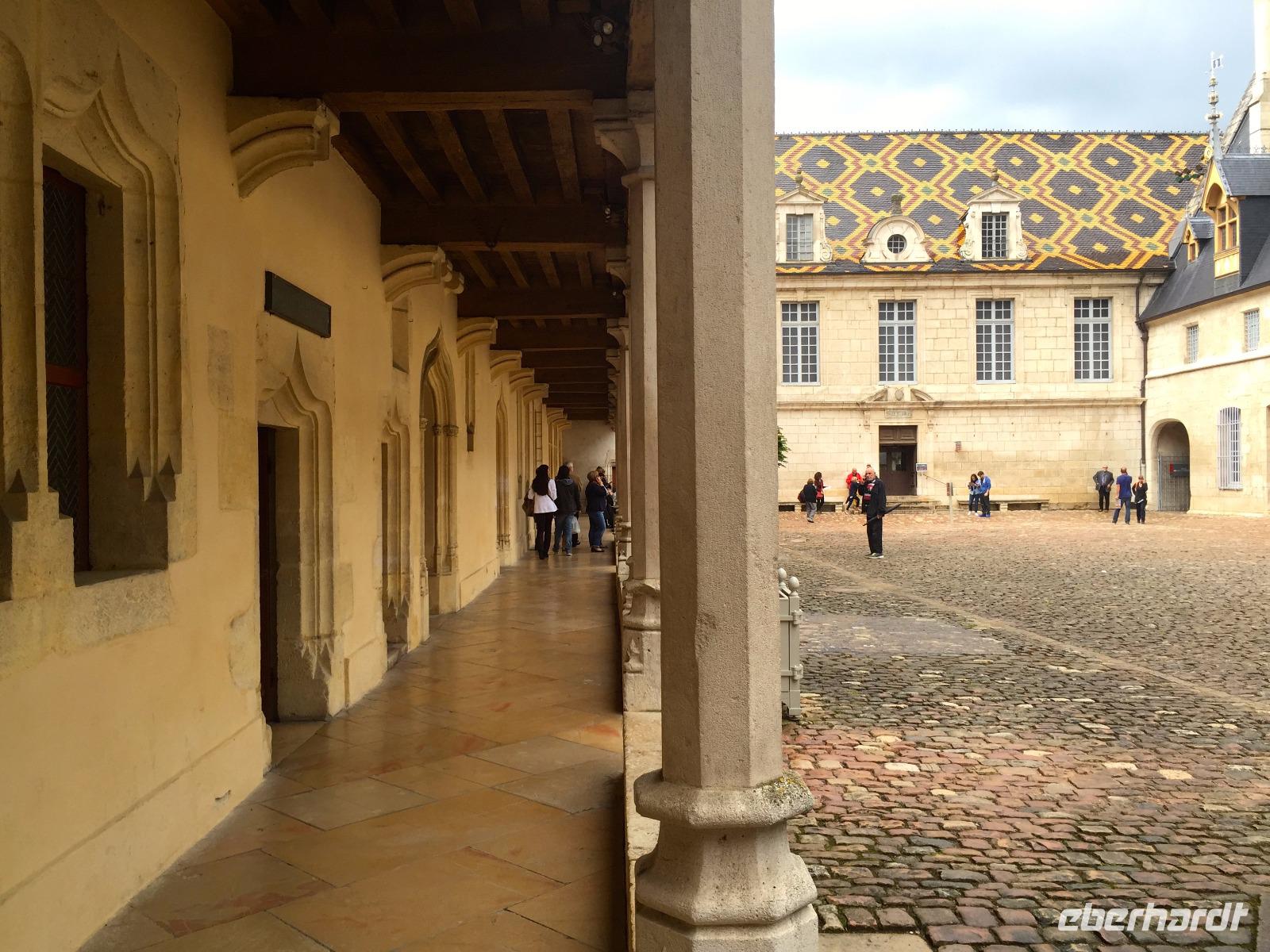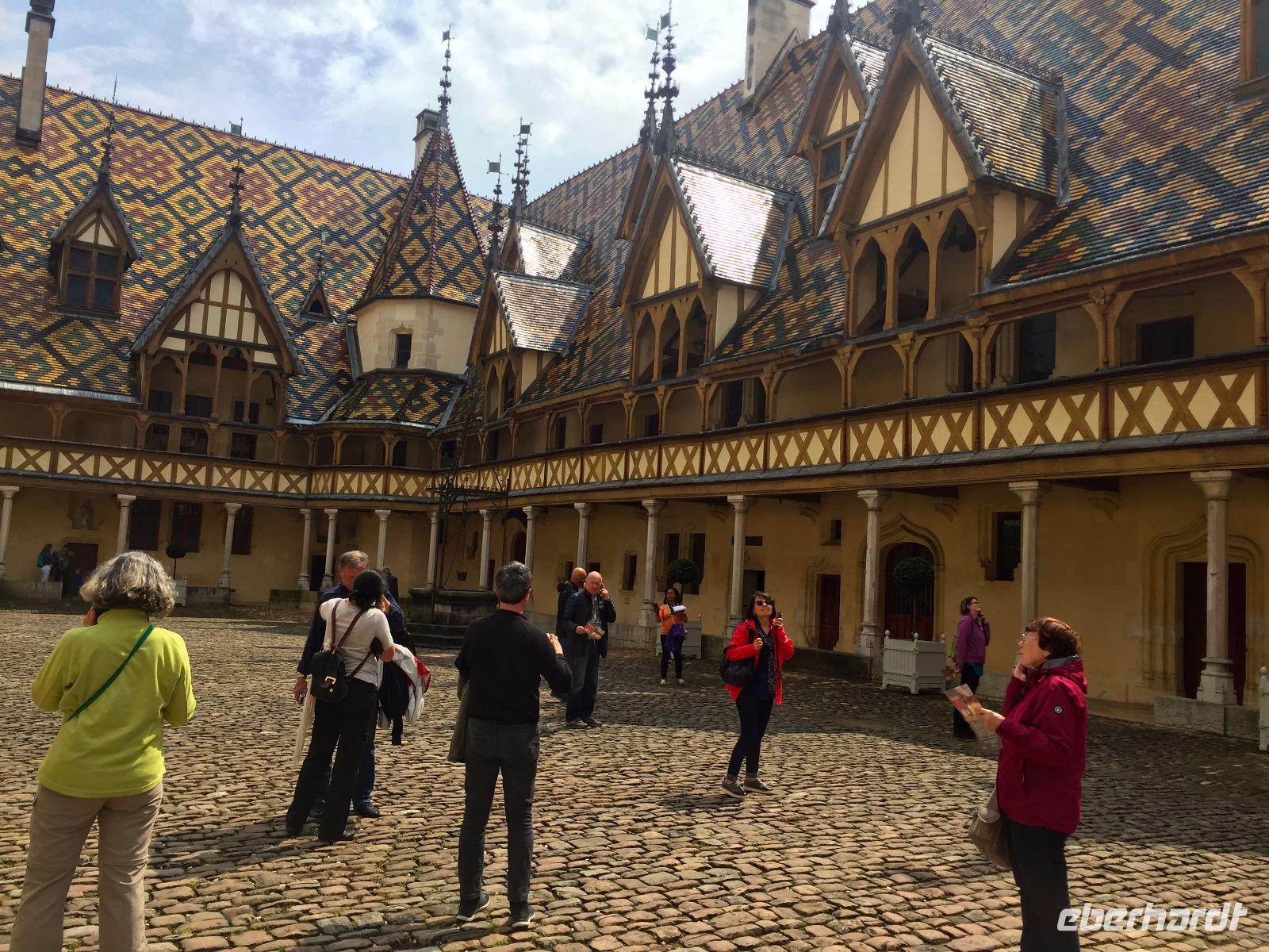Anschließend geht die Reise weiter nach Beaune. Südlich von Dijon gelegen, gehört die Stadt wegen ihrer mittelalterlichen Bauten zu den schönsten Zielen im Burgund. Das Hotel-Dieu ist die bekannteste Sehenswürdigkeit: Ein im burgundisch-flämischen Stil erbautes Hospiz, gestiftet vom burgundischen Kanzler Nicolas Rolin. Die schlichte Außenfassade verrät wenig von der Pracht, die sich im Innenhof entfaltet: Hohe, mit farbig glasierten Ziegeln gedeckte Dächer mit geometrischen Mustern umgeben einen malerischen Innenhof. In den Innenräumen beeindruckt der große Krankensaal mit seinen Holzeinbauten sowie der berühmte Flügelaltar (1443) mit der Darstellung des Jüngsten Gerichts von Rogier van der Weyden.
