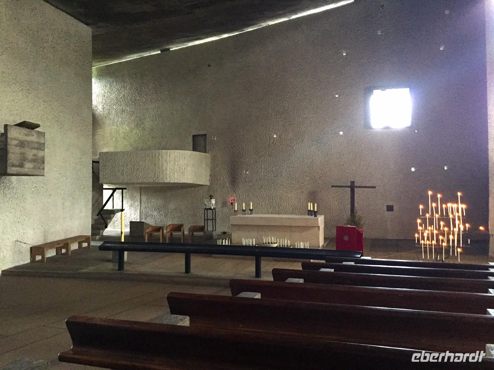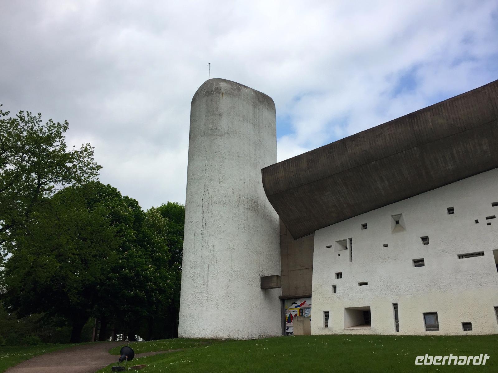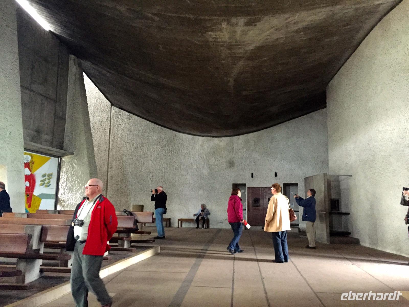 Um die lange Autobahnfahrt zu unterbrechen, machen wir einen Halt in der Franche-Comté im Wallfahrtsort Ronchamp und nutzen die Gelegenheit zum Besuch der von Le Corbusier in den fünfziger Jahren des zwanzigsten Jahrhunderts aus Stahlbeton gebauten Kapelle. Ein beeindruckendes, muschelartiges Dach bedeckt das Gebäude. Innen biegt es sich wie ein schweres, beschützendes Segel. Der Kirchenraum und die Altarkapellen sind von der sorgfältig und intelligent ausgearbeiteten Lichtführung geprägt.