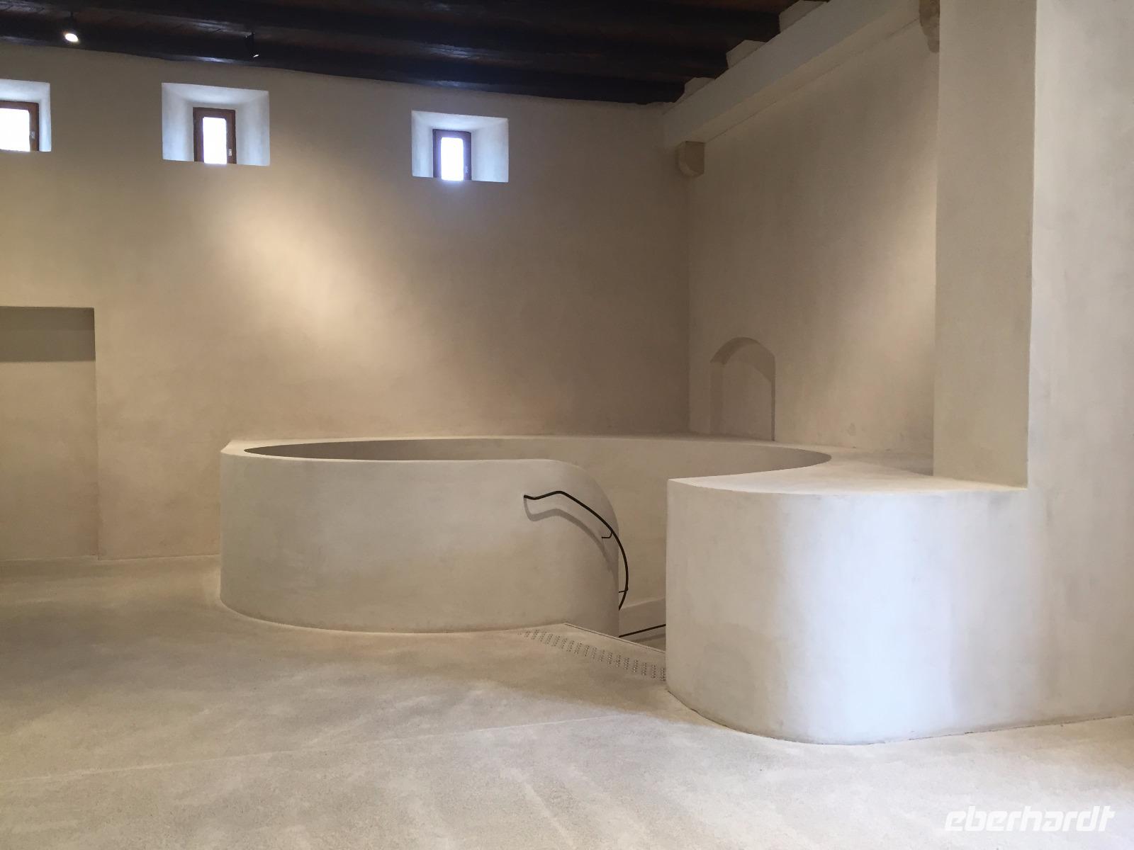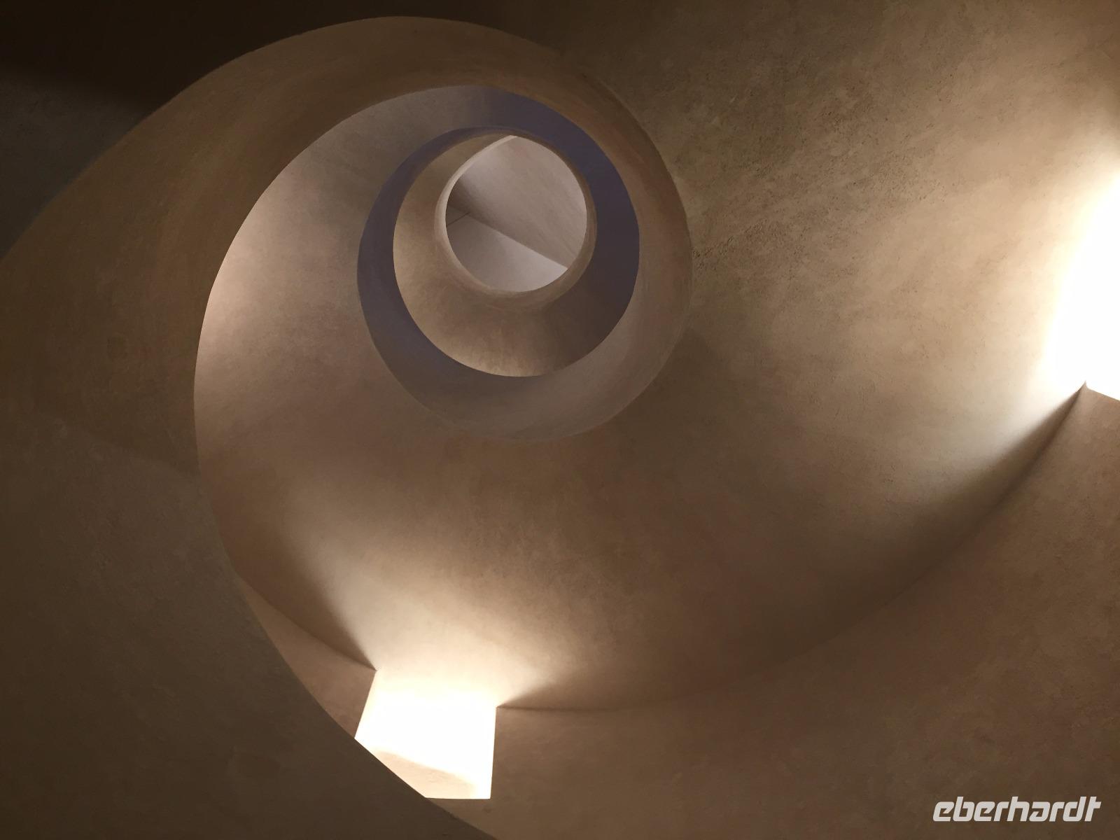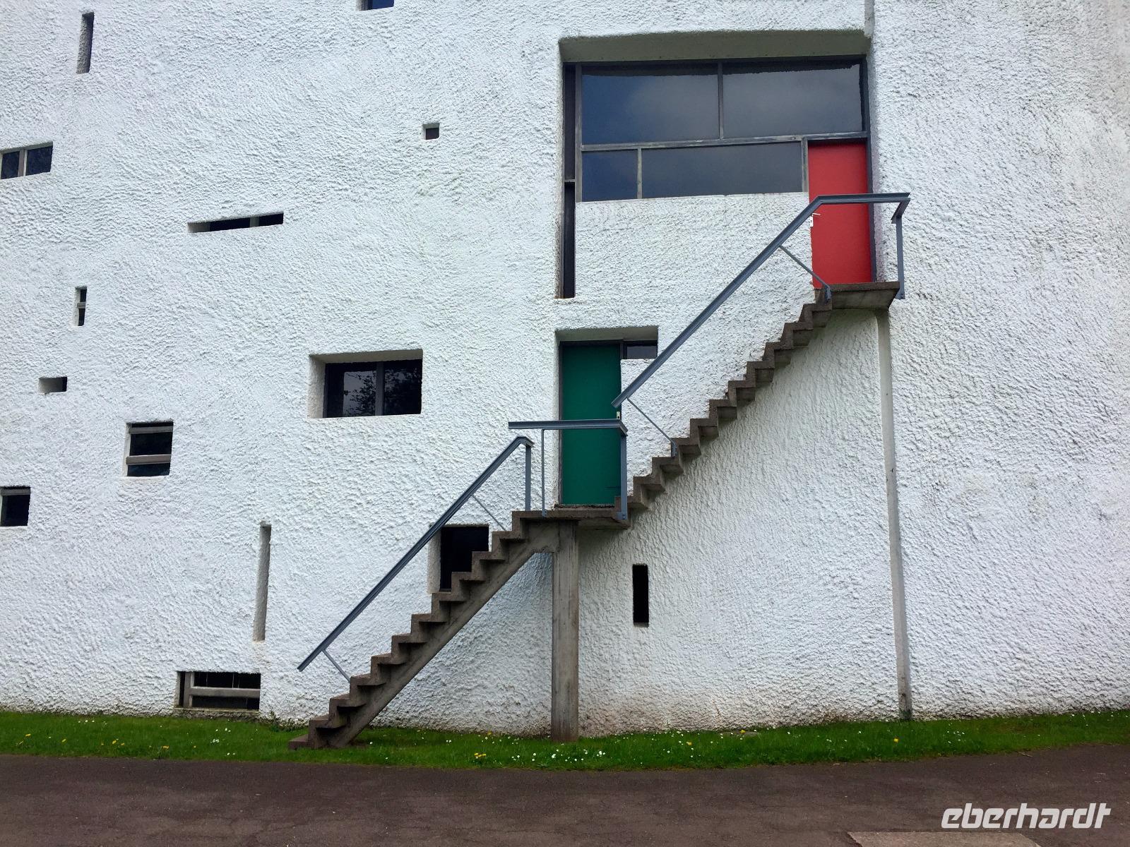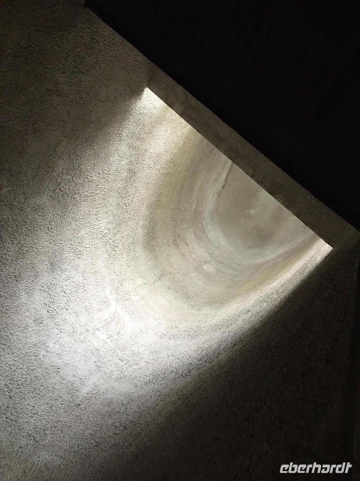Um die lange Autobahnfahrt zu unterbrechen, machen wir einen Halt in der Franche-Comté im Wallfahrtsort Ronchamp und nutzen die Gelegenheit zum Besuch der von Le Corbusier in den fünfziger Jahren des zwanzigsten Jahrhunderts aus Stahlbeton gebauten Kapelle. Ein beeindruckendes, muschelartiges Dach bedeckt das Gebäude. Innen biegt es sich wie ein schweres, beschützendes Segel. Der Kirchenraum und die Altarkapellen sind von der sorgfältig und intelligent ausgearbeiteten Lichtführung geprägt.