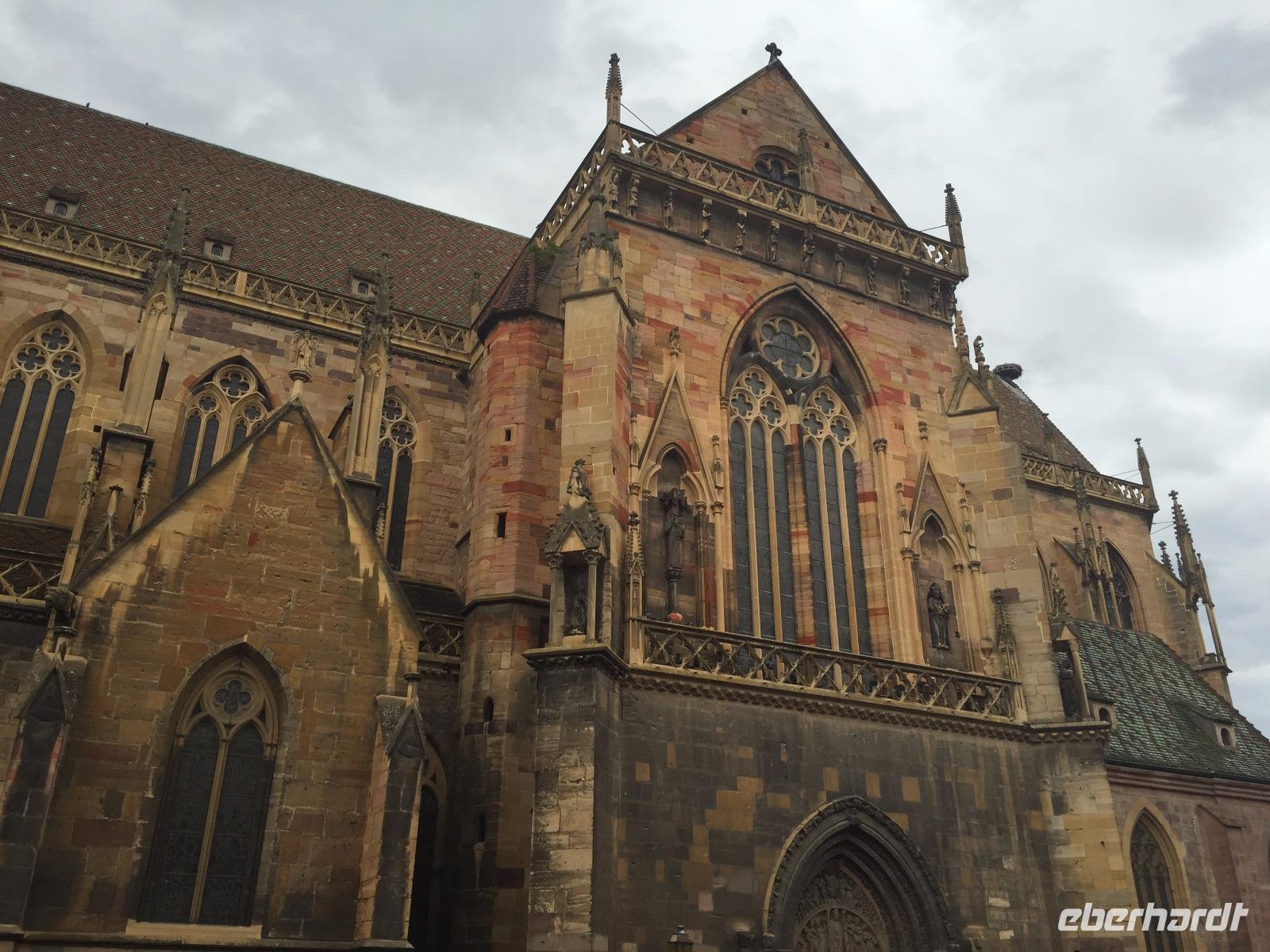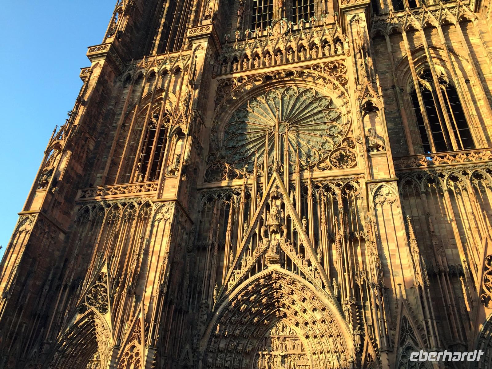 Goethe hat über das Münster geschrieben: „ Je mehr ich die Fassade desselben betrachte, desto mehr bestärkte und entwickelte sich jener erste Eindruck, dass hier das Erhabene mit dem Gefälligen in Bund getreten sei." Der rote Sandstein der Vogesen prägt das äußere Bild in der von Goethe beschriebenen Art.