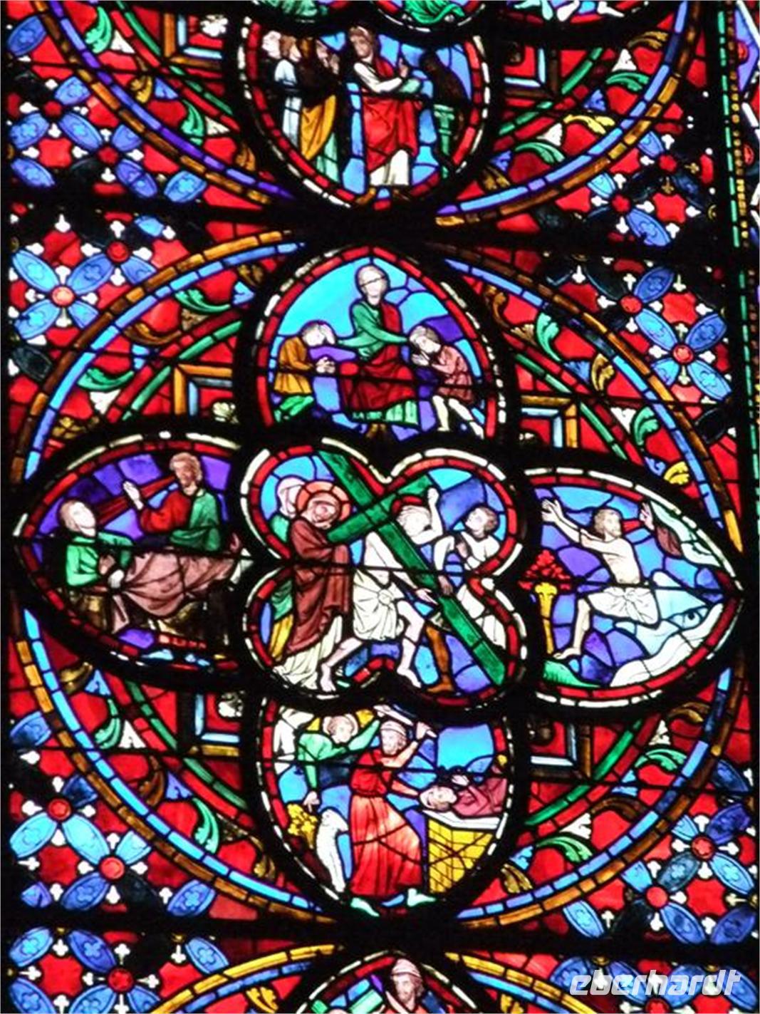 Wir betrachten Portale und sehen, wie sich in wenigen Jahrzehnten die Bildhauerkunst weiterentwickelte. Bunte Glasfenster, die 700 Jahre alt sind geben in realistischer Weise die Tätigkeit ihrer Stifter, Könige und mittelalterlicher Handwerkerzünfte wieder. Auf einem kleine Stadtspaziergang zum Ufer der Eure lernen wir die Stadt näher kennen.