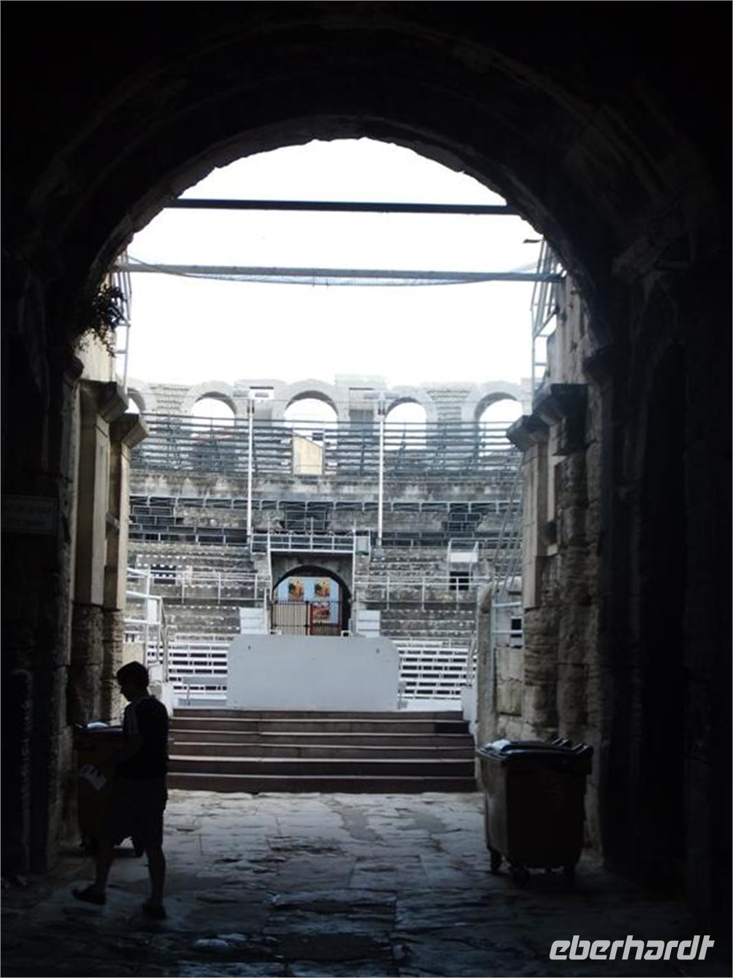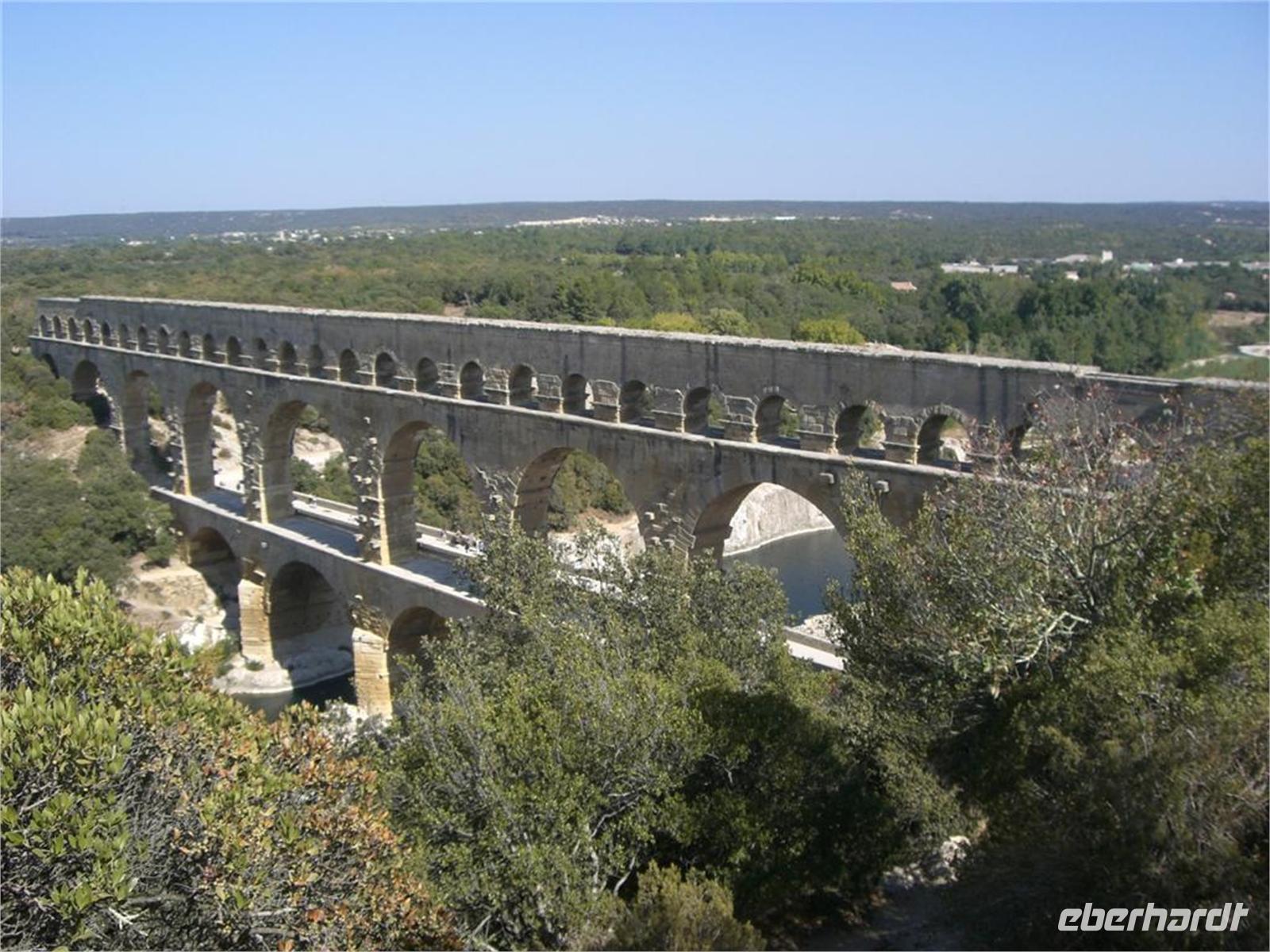 Hatten wir gestern noch gestaunt, wie die Römer die riesige Arena von Arles errichtet hatten, die durch ein System von Aufgängen und Galerien so schnell verlassen werden konnte wie heute kaum ein Stadion, so kann man nur voller Bewunderung vor dem Aquädukt Pont du Gard stehen, Teil eines 50 km langen Bewässerungskanal für die antike Großstadt Arles. Hier musste das Tal des Flusses Gard gequert werden, hier mussten 6 t schwere Steine beim Bau 40 m hoch gehoben werden, hier musste auf der gesamten Kanallänge ein gleichmäßiges Gefälle von nur 11 m eingehalten werden.
